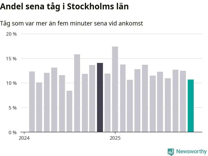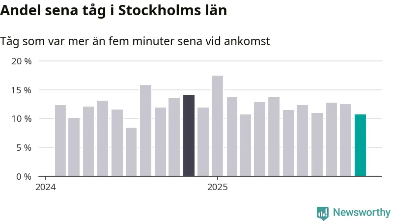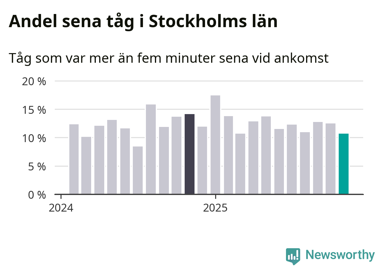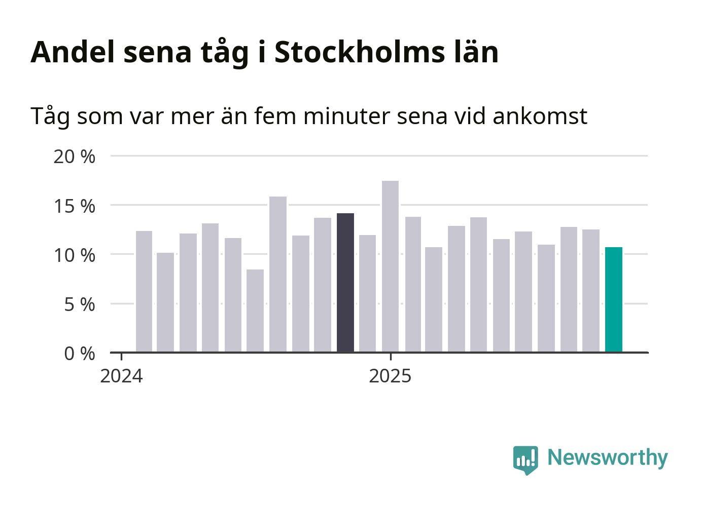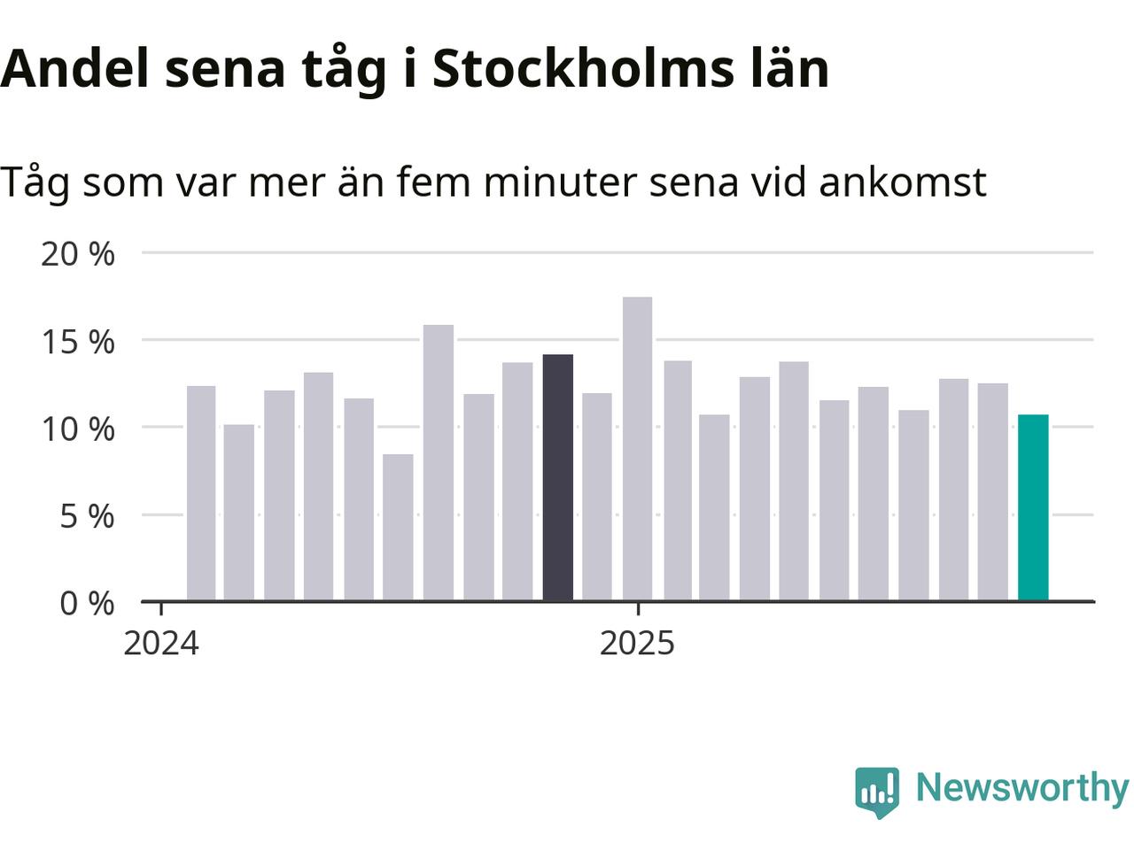 Elva procent kan jämföras med tolv procent månaden innan, och 14 procent i november 2024. Siffrorna bygger på realtidsinformation om tågavgångar och ankomster från Trafikverket, som Newsworthy löpande samlar in.