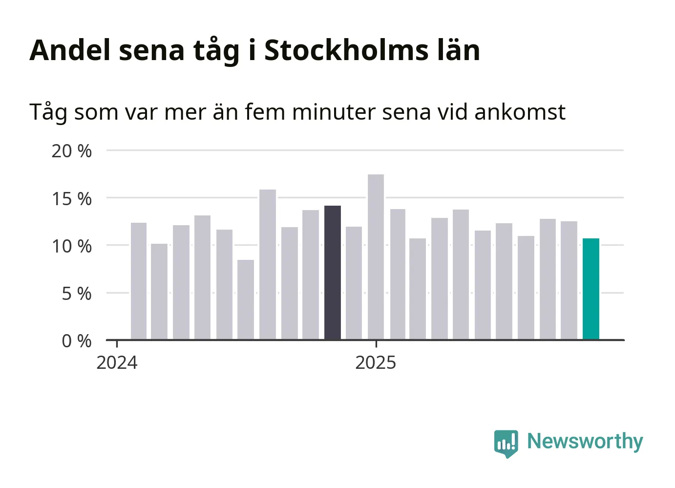 Av omkring 22 900 tåg som passerade någon av stationerna i Stockholms län i november var 2 457 mer än fem minuter sena. Det motsvarar 11 procent, en bit över den nationella målsättningen som säger att inte mer än fem procent av tågen ska vara sena.