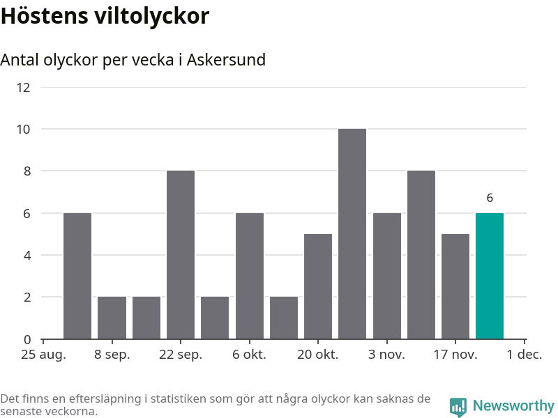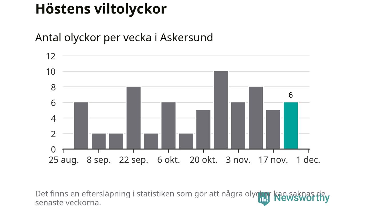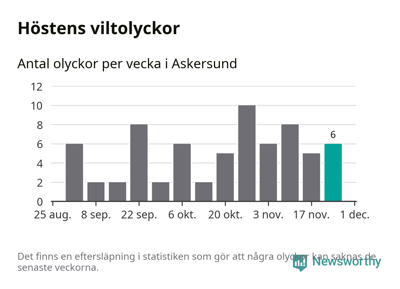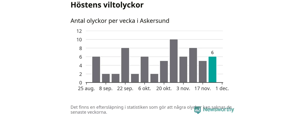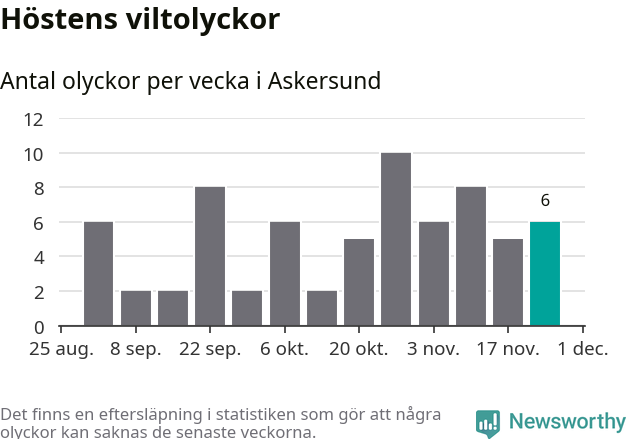 Hittills har sex viltolyckor rapporterats in i Askersunds kommun från vecka 48. Se listan här.