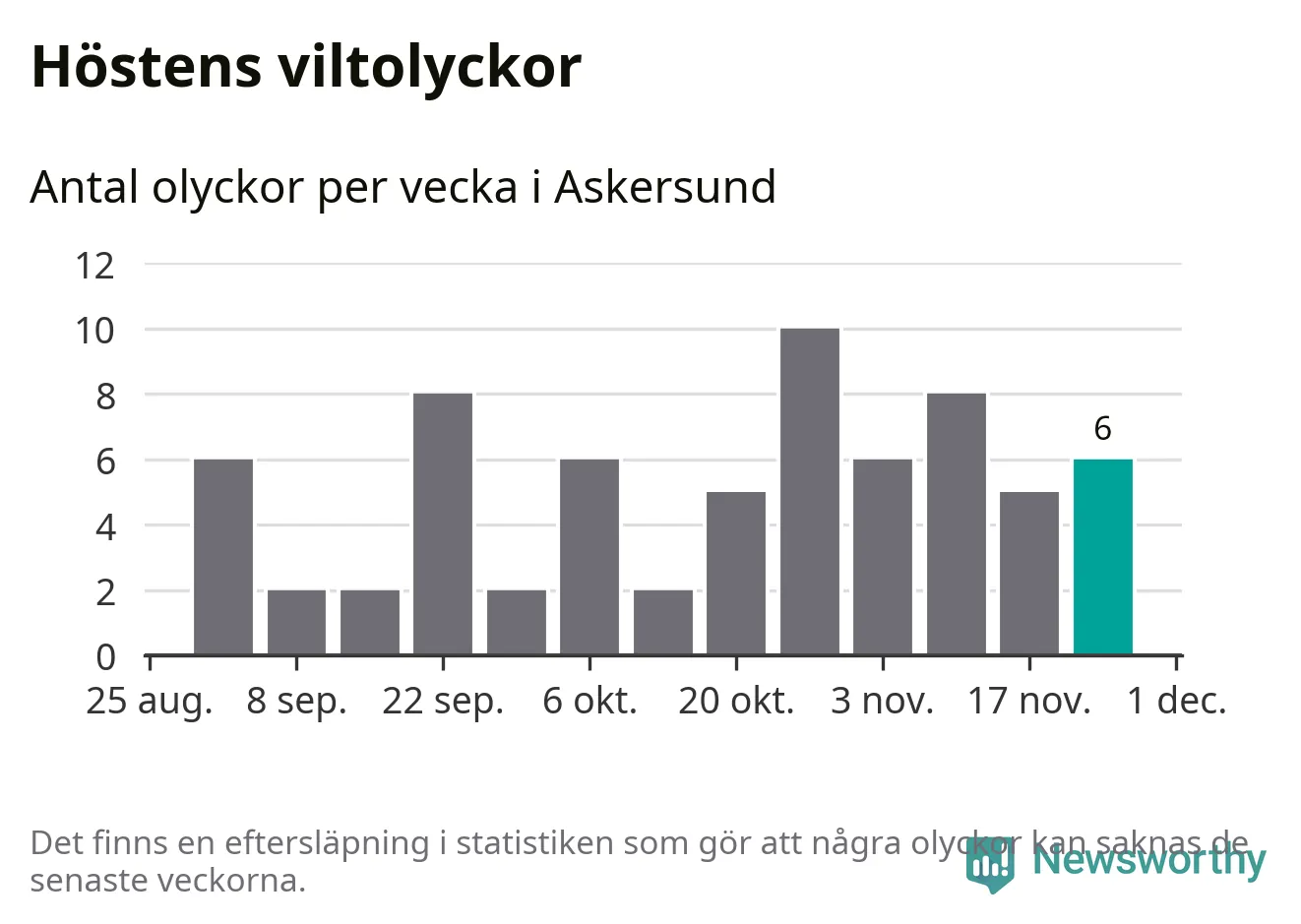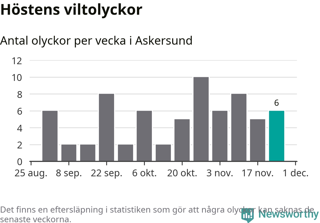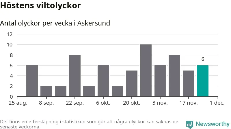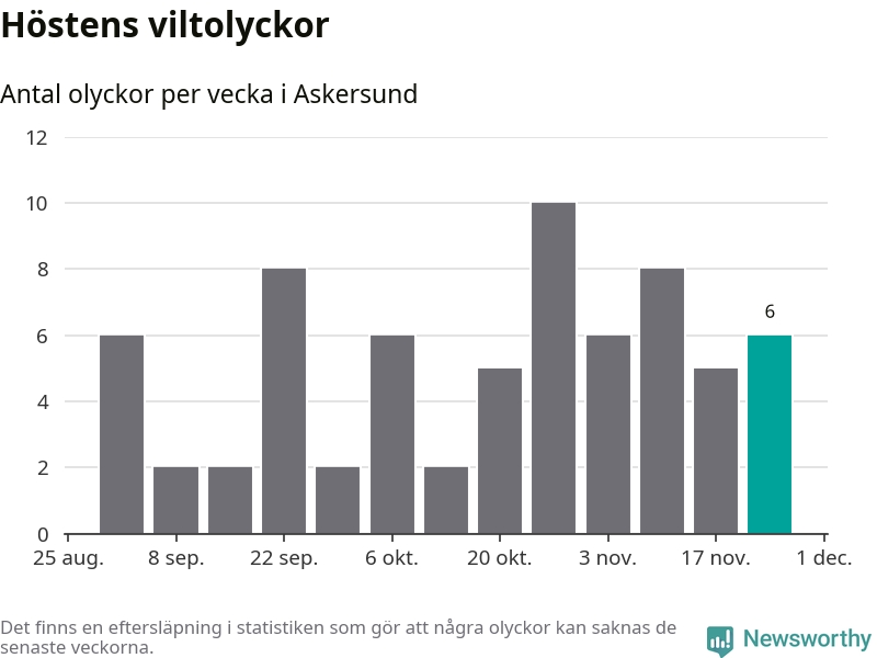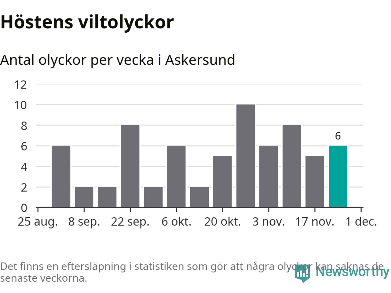 Hittills har sex viltolyckor rapporterats in i Askersunds kommun från vecka 48. Se listan här.