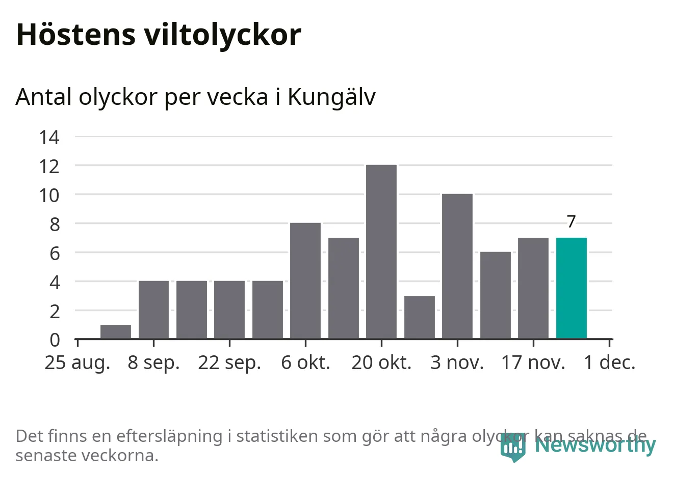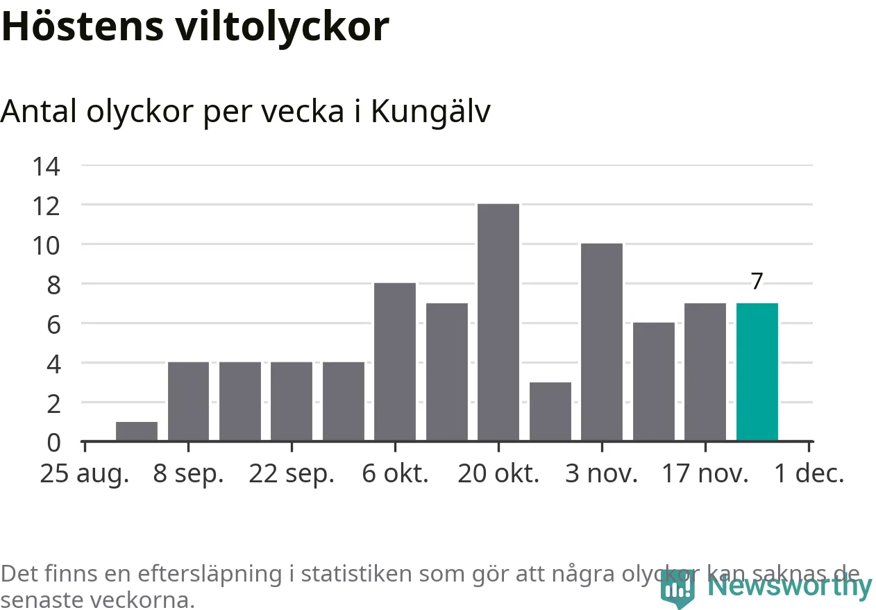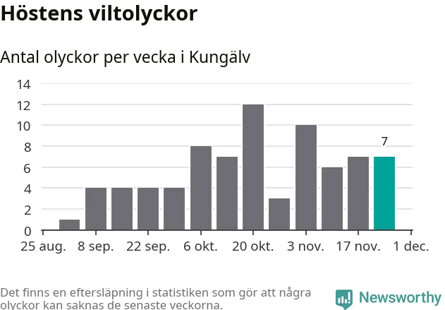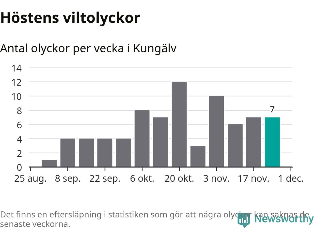 Hittills har sju viltolyckor rapporterats in i Kungälvs kommun från vecka 48. Se listan här.