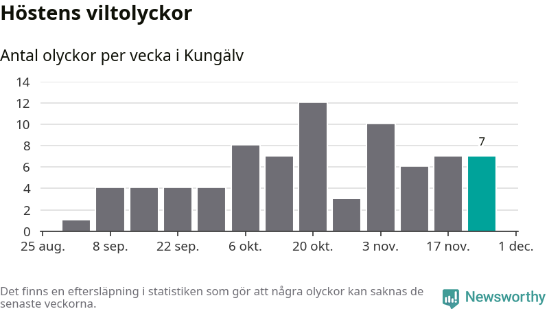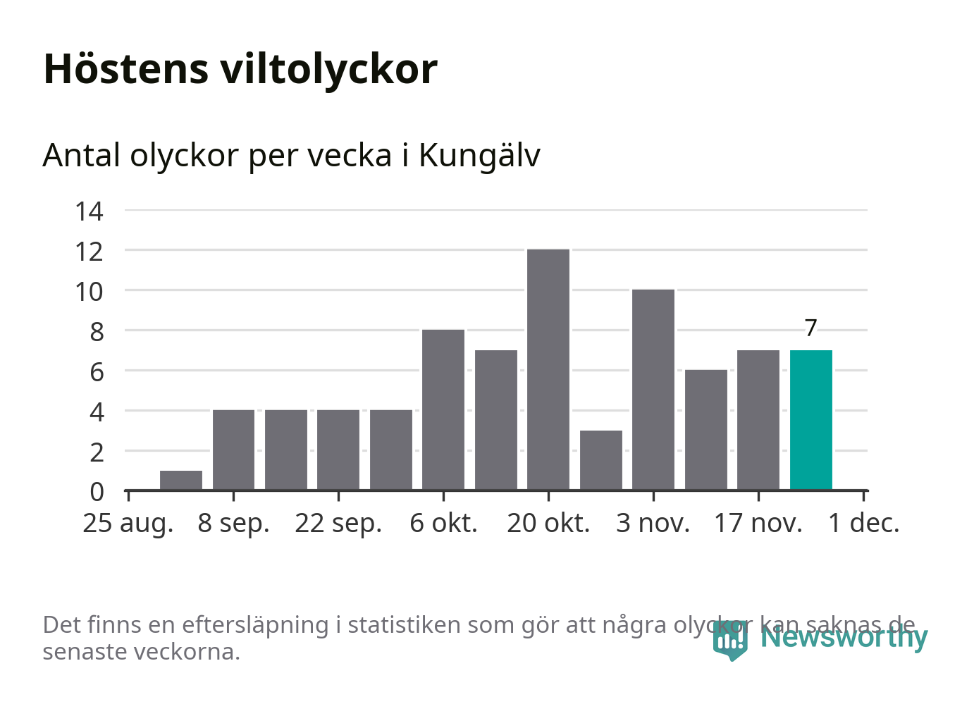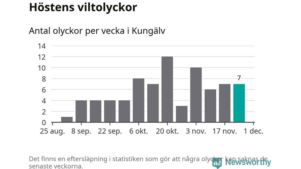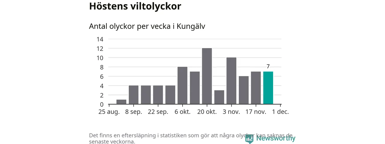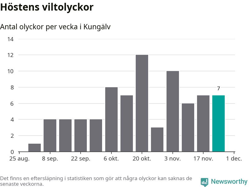 Hittills har sju viltolyckor rapporterats in i Kungälvs kommun från vecka 48. Se listan här.