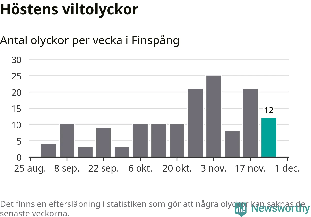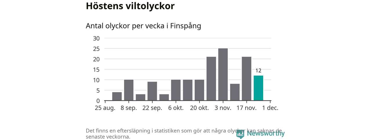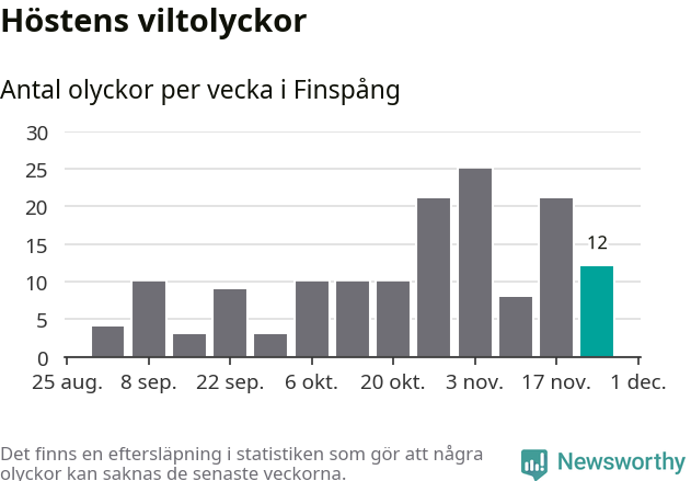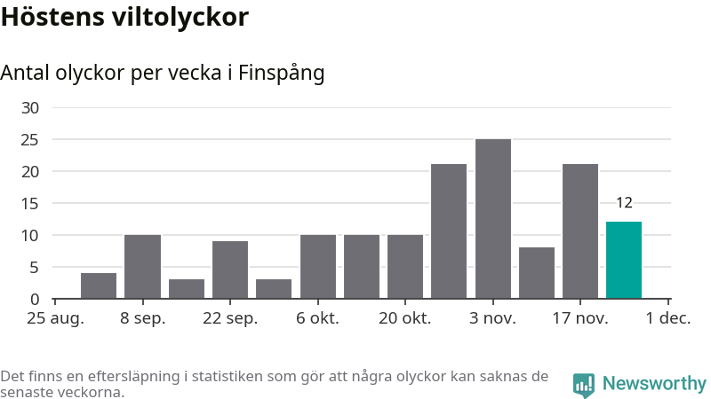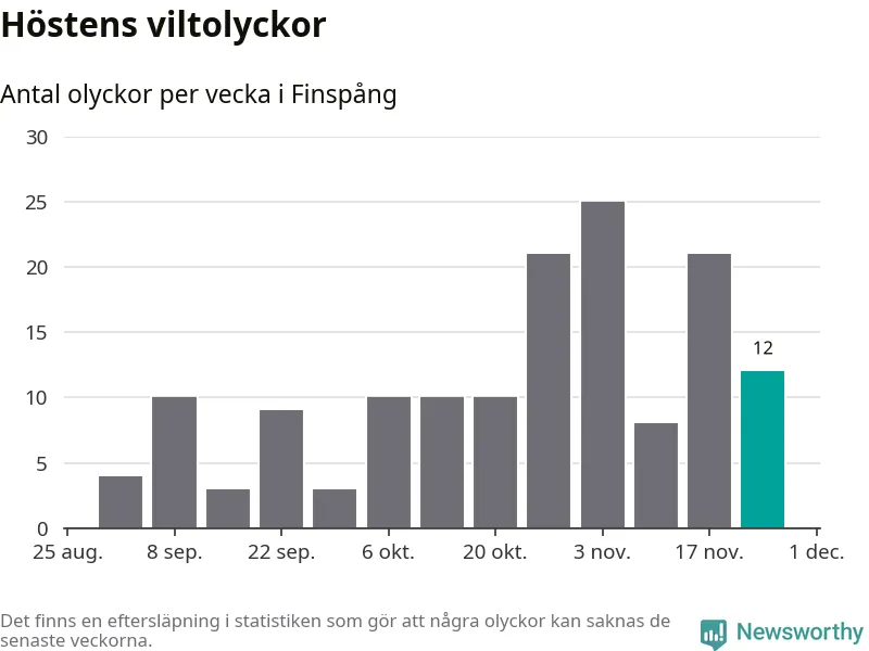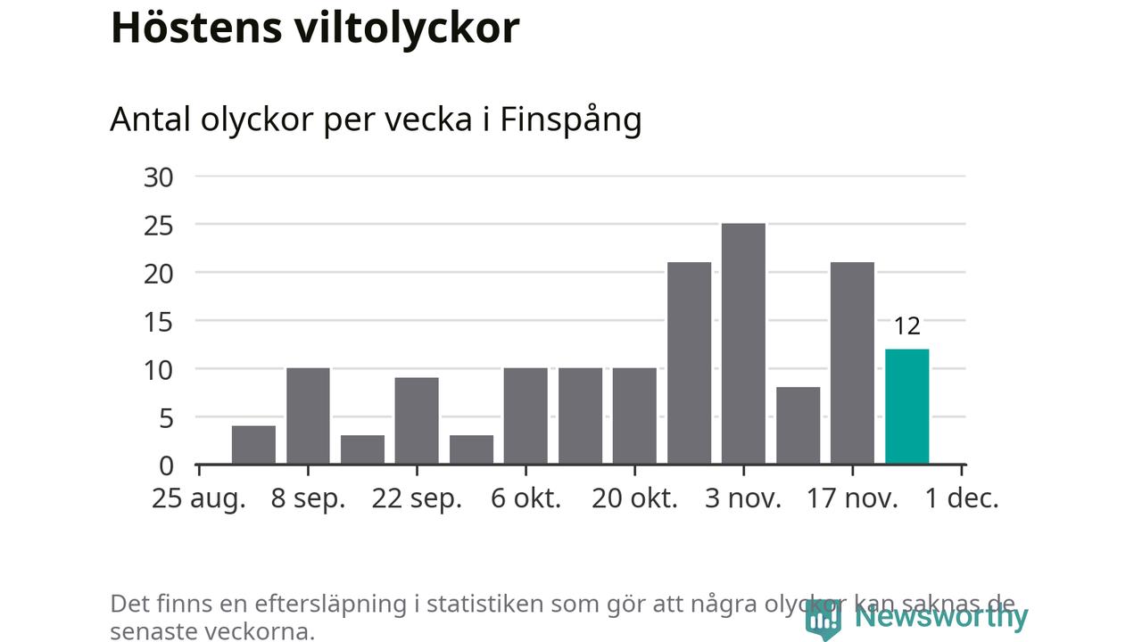 Hittills har tolv viltolyckor rapporterats in i Finspångs kommun från vecka 48. Se listan här.