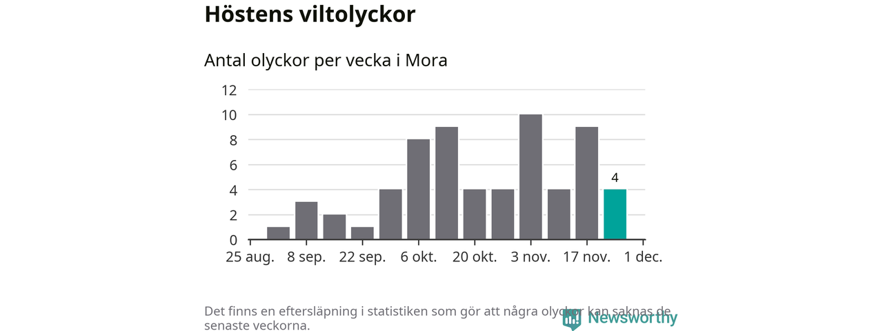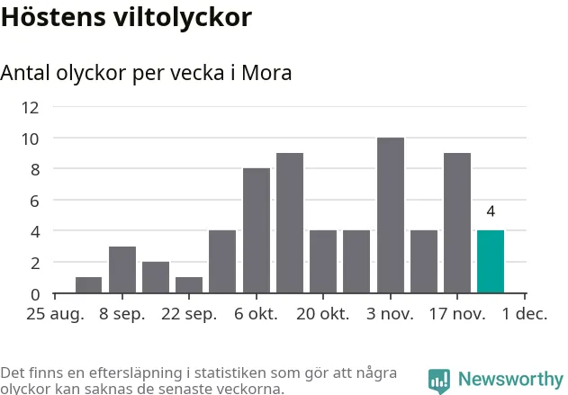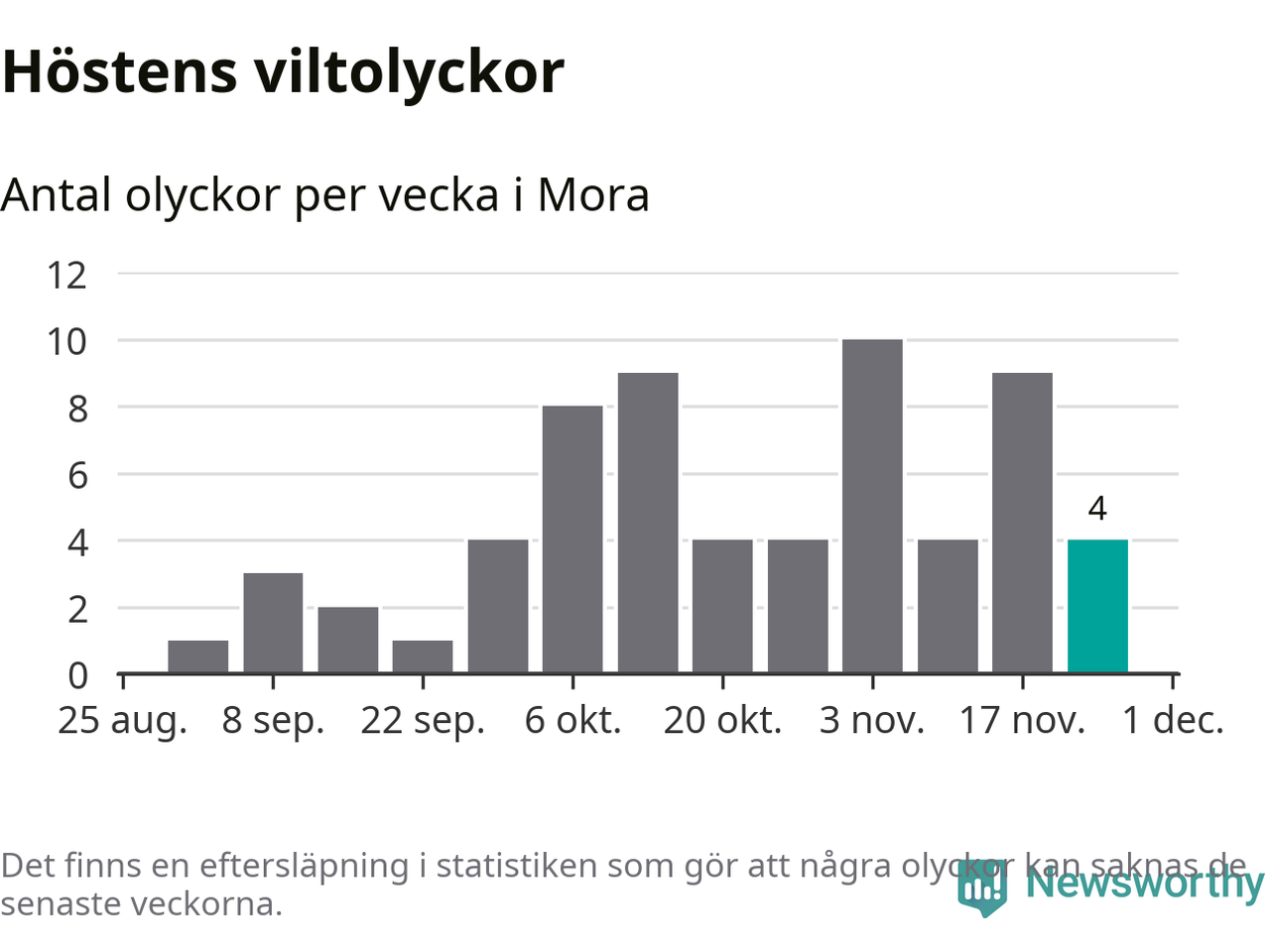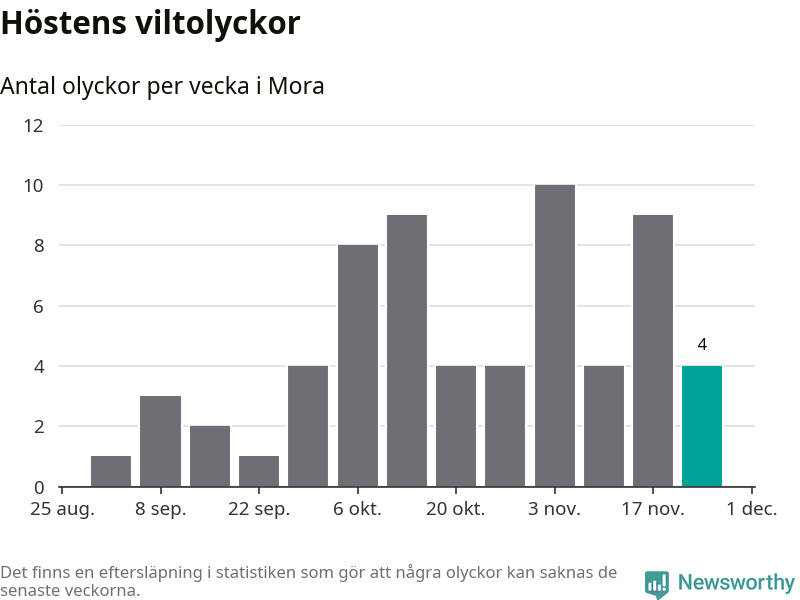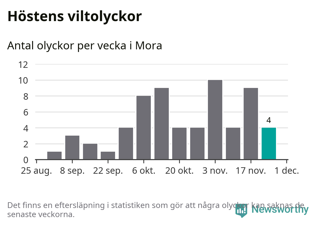 Hittills har fyra viltolyckor rapporterats in i Mora kommun från vecka 48. Se listan här.