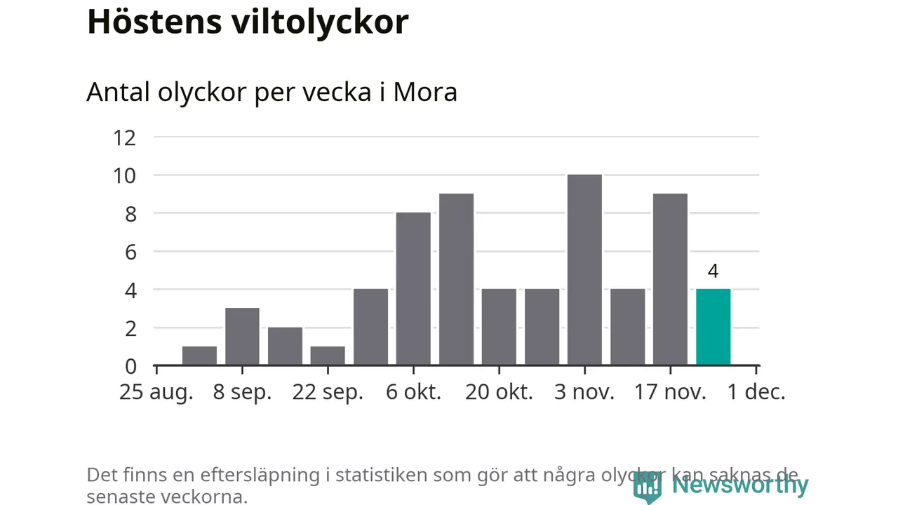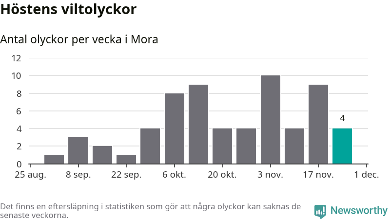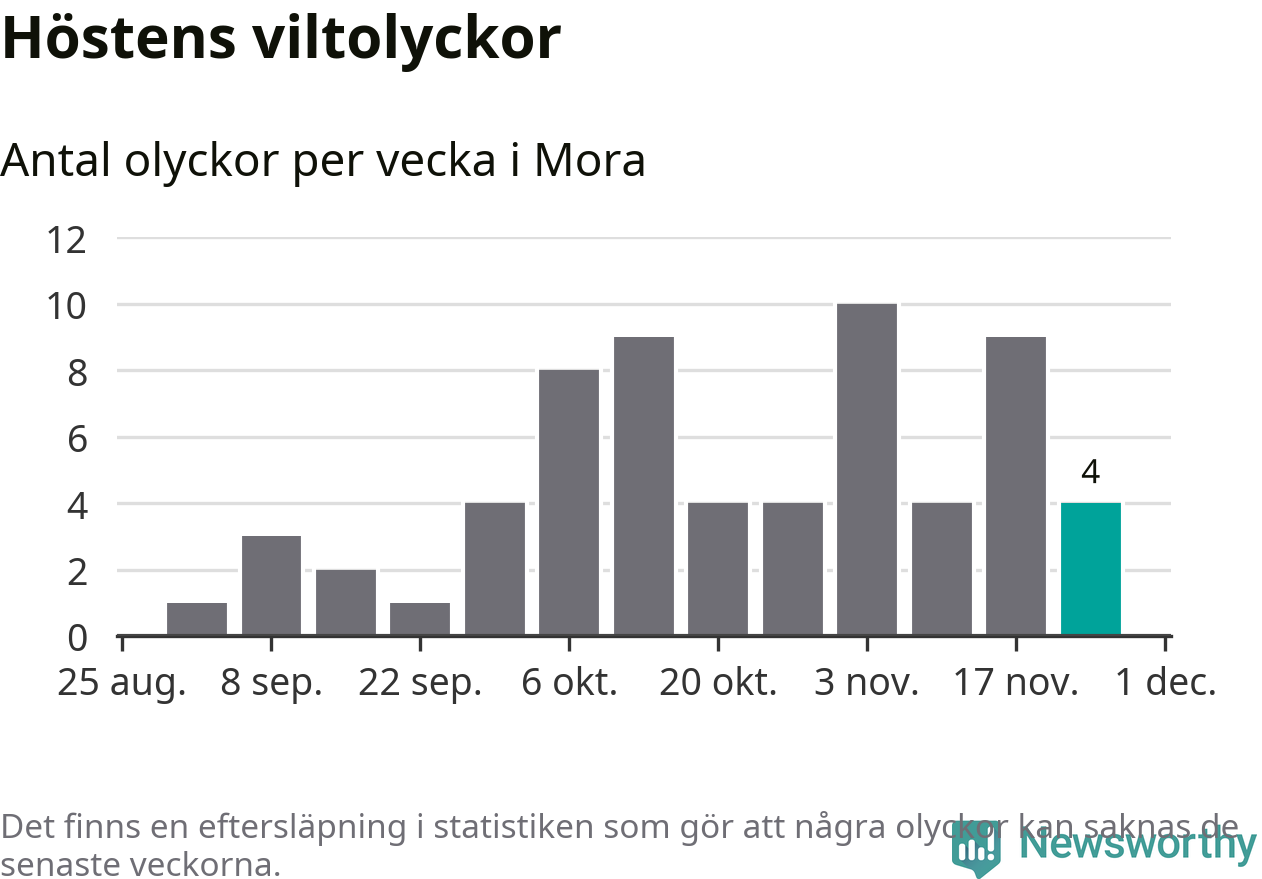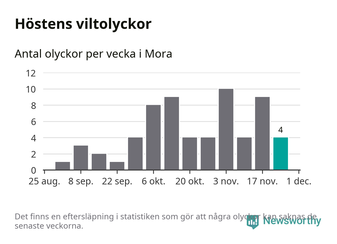 Hittills har fyra viltolyckor rapporterats in i Mora kommun från vecka 48. Se listan här.
