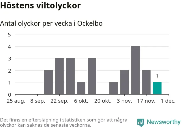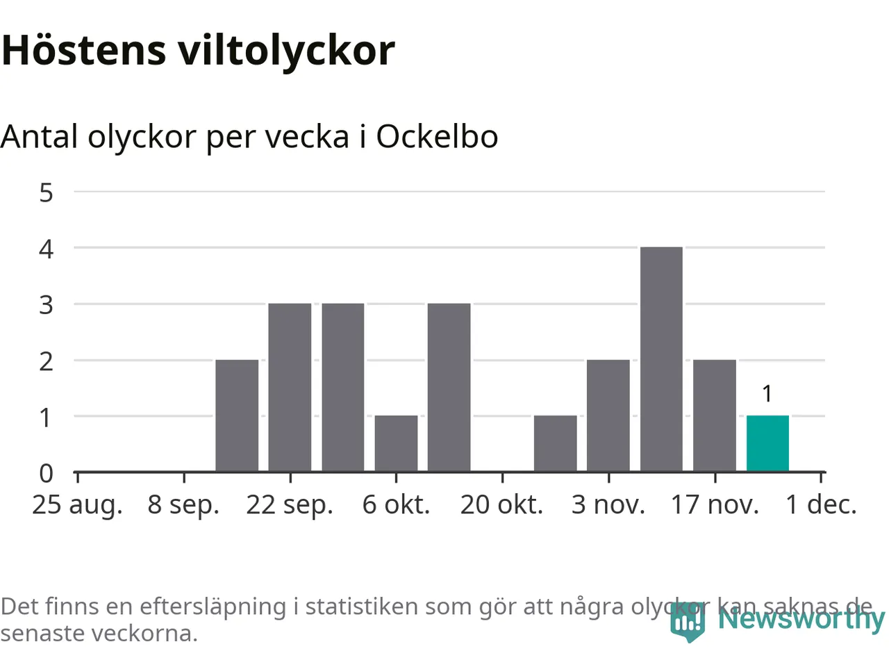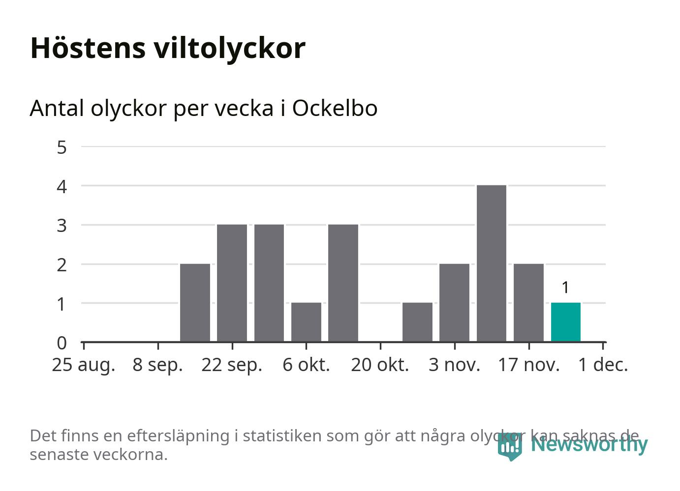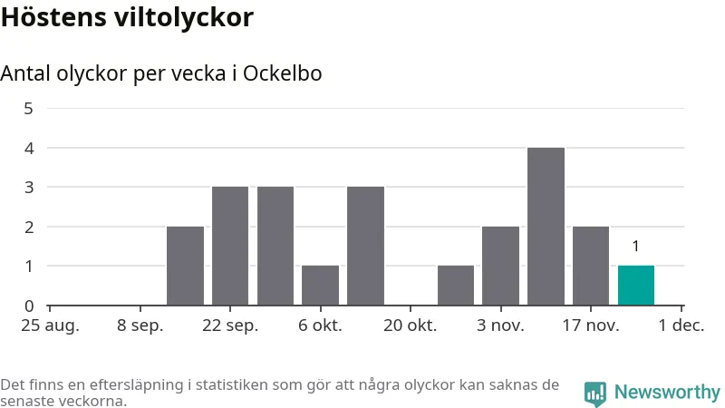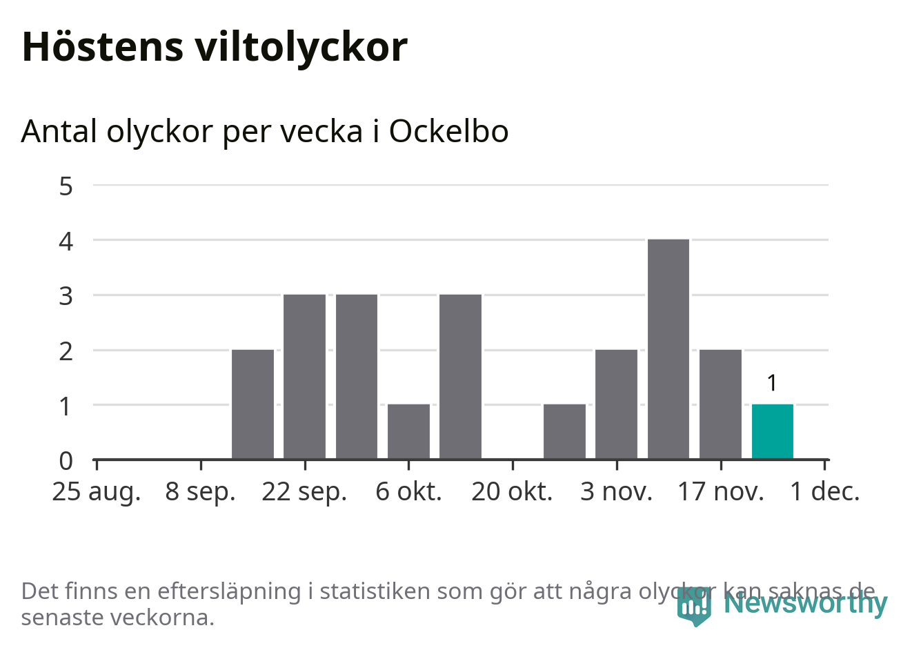 Från förra veckan (vecka 48) har hittills en viltolycka rapporterats in i Ockelbo kommun.