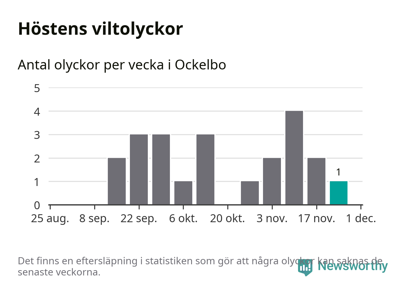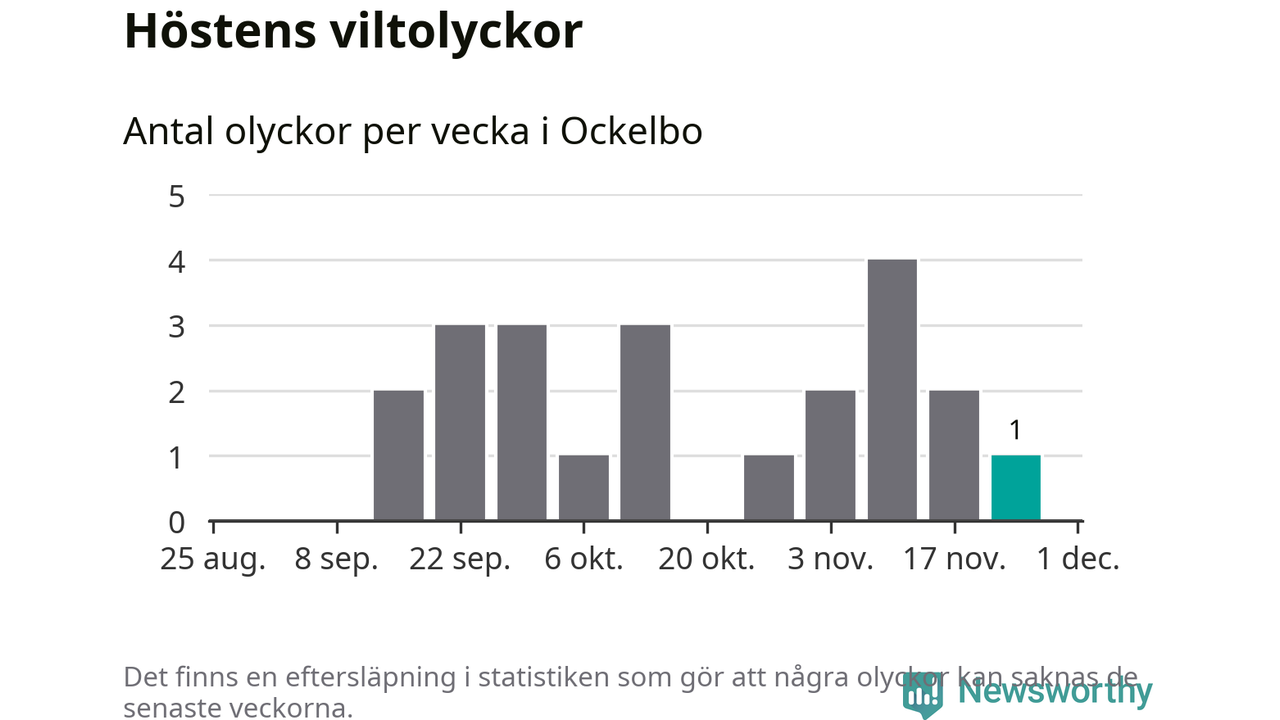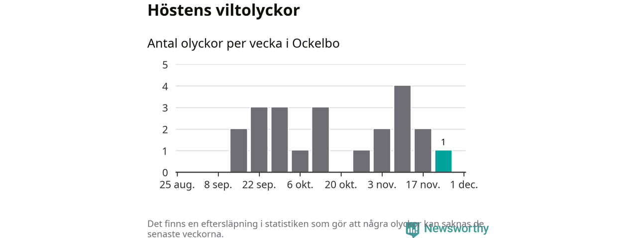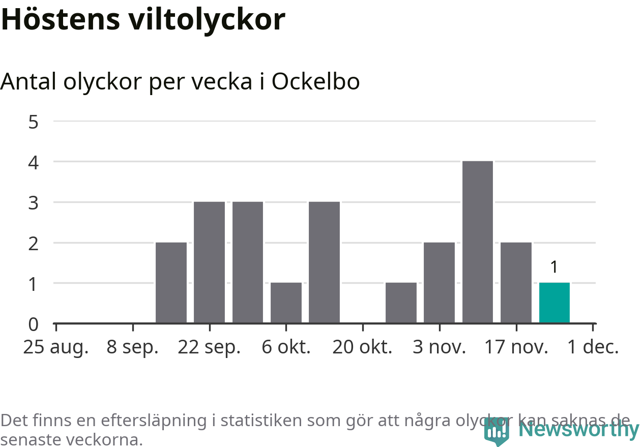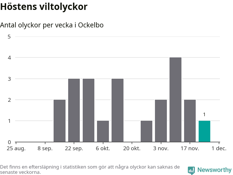 Från förra veckan (vecka 48) har hittills en viltolycka rapporterats in i Ockelbo kommun.