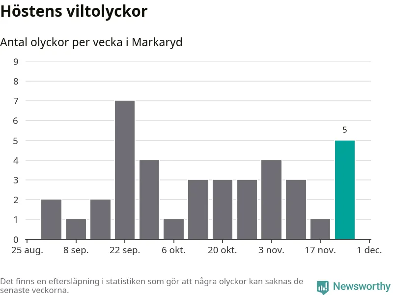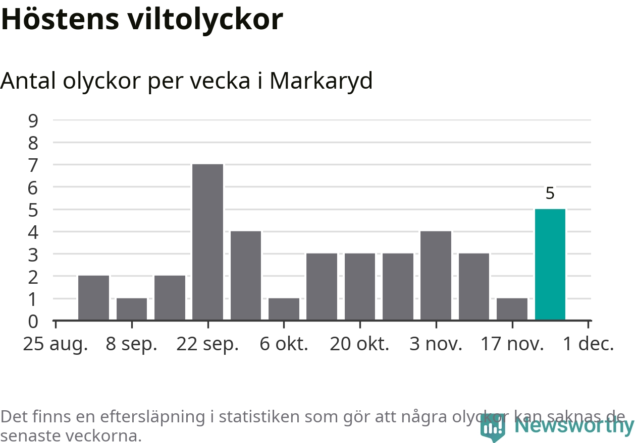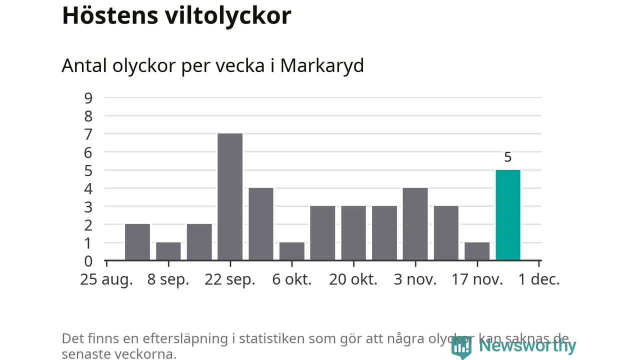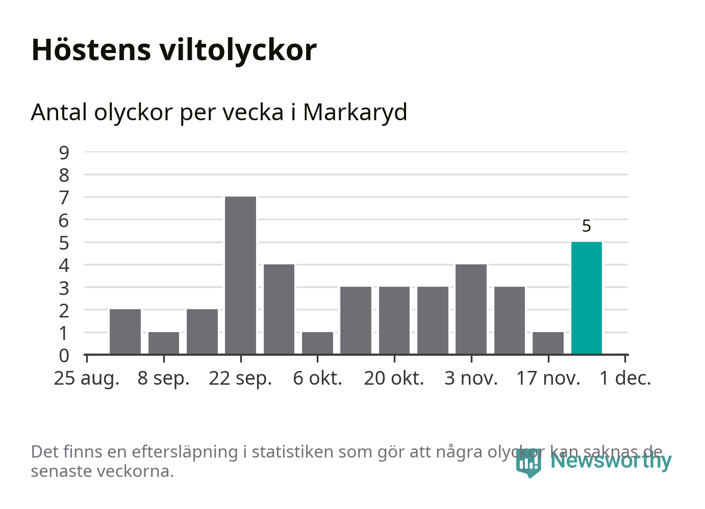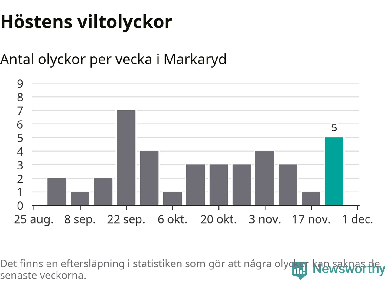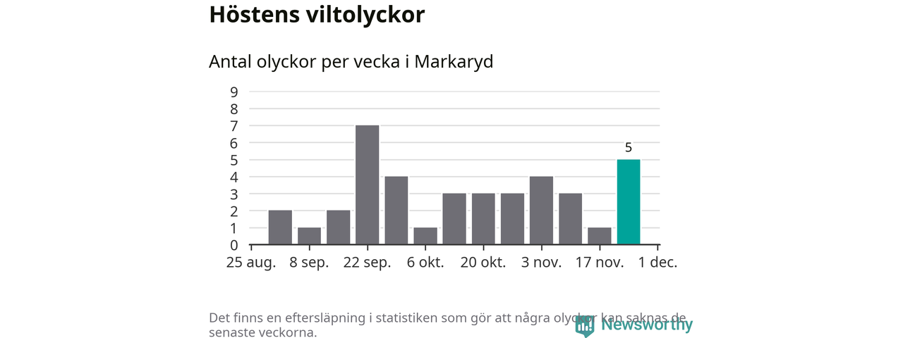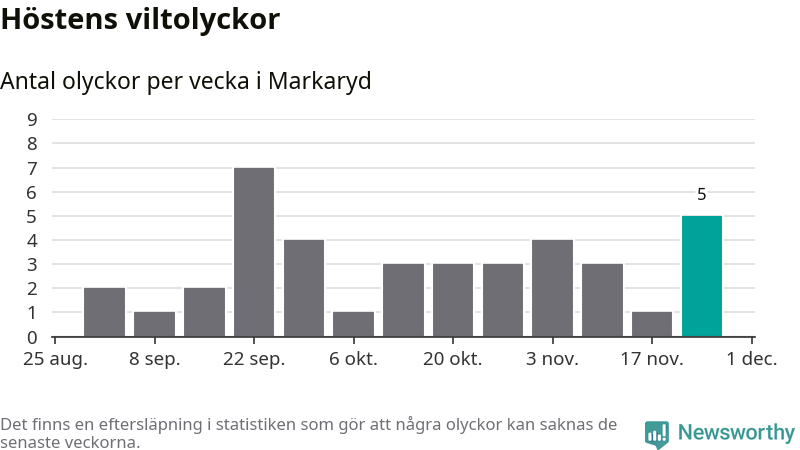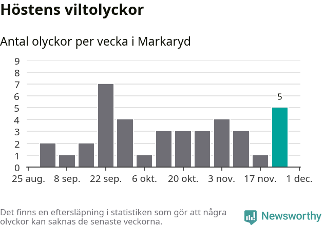 Hittills har fem viltolyckor rapporterats in i Markaryds kommun från vecka 48. Se listan här.