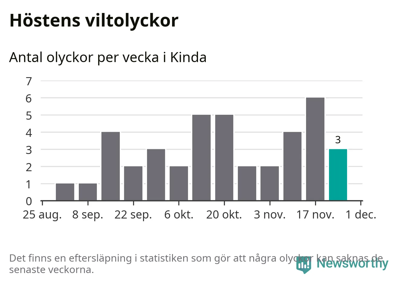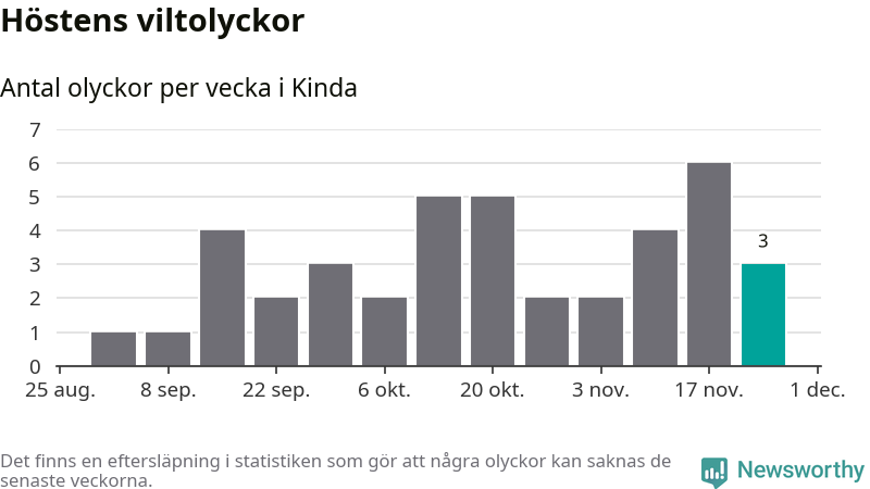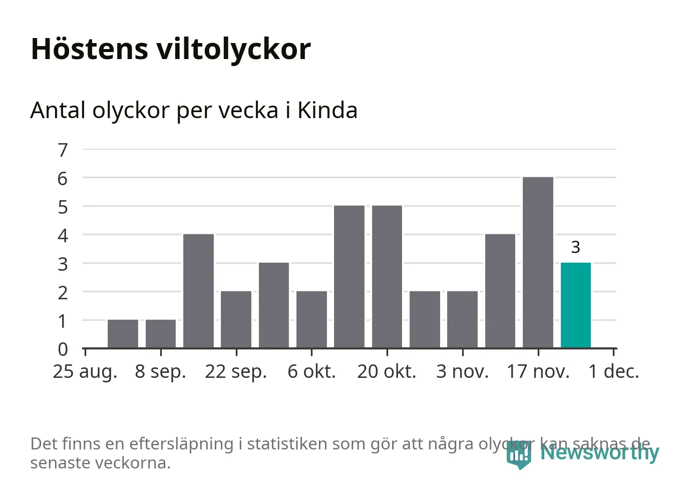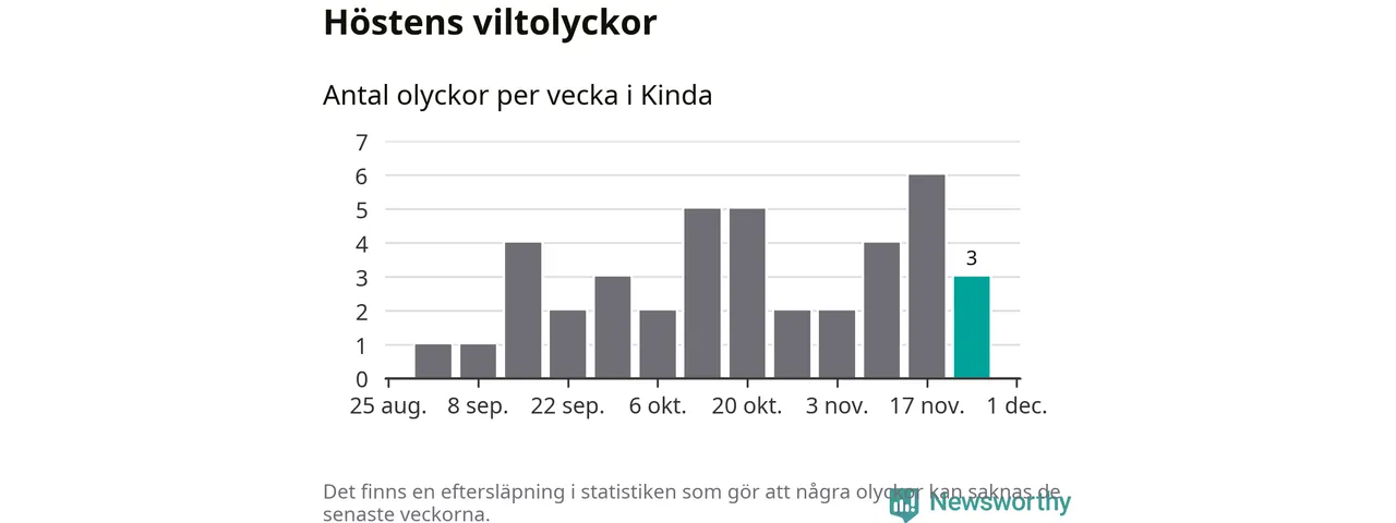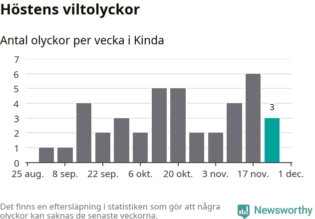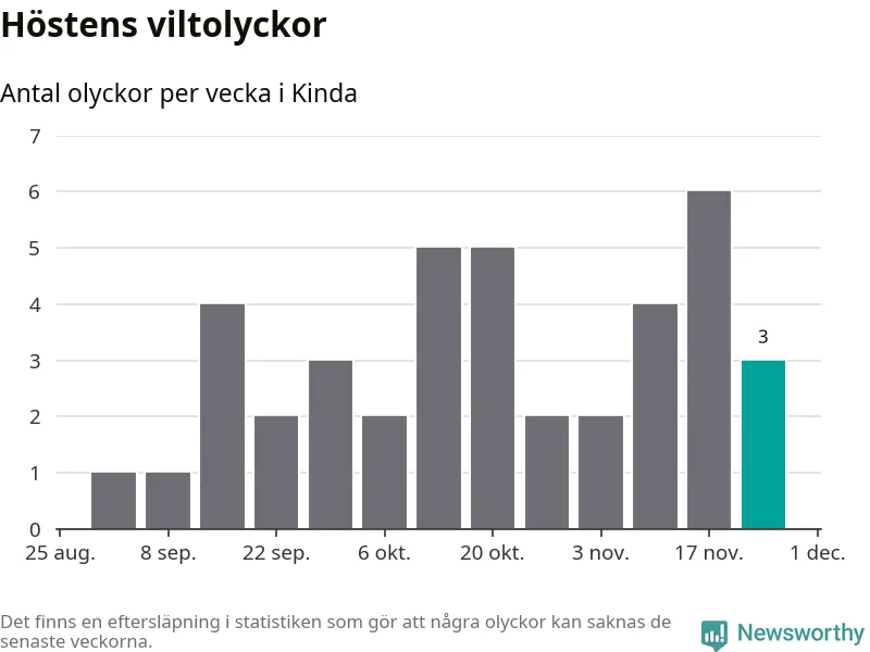 Hittills har tre viltolyckor rapporterats in i Kinda kommun från vecka 48. Se listan här.