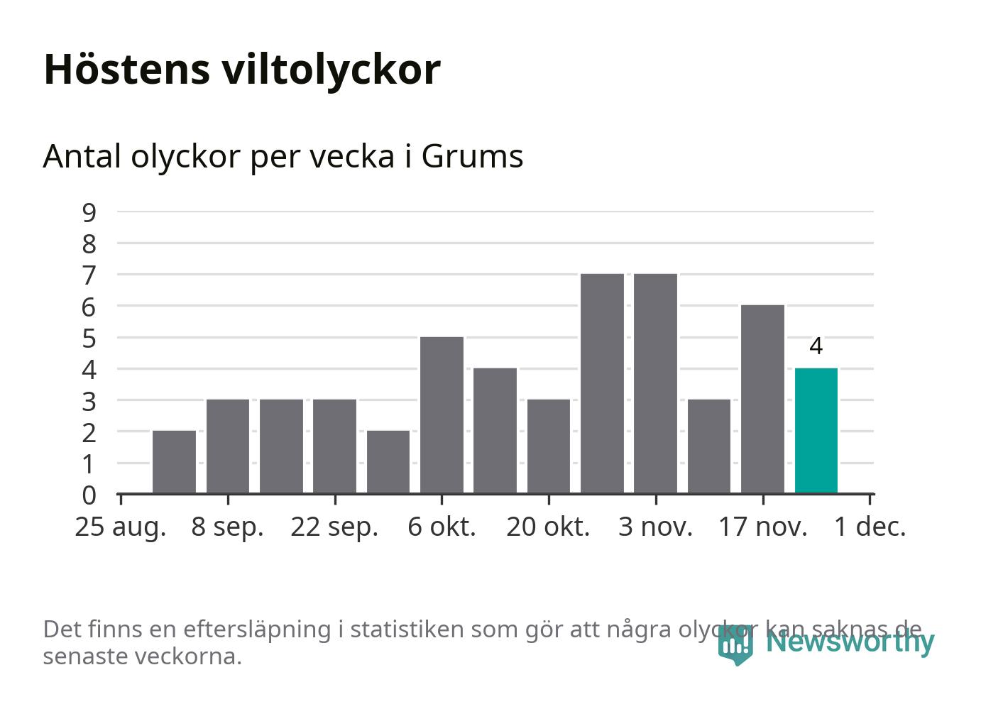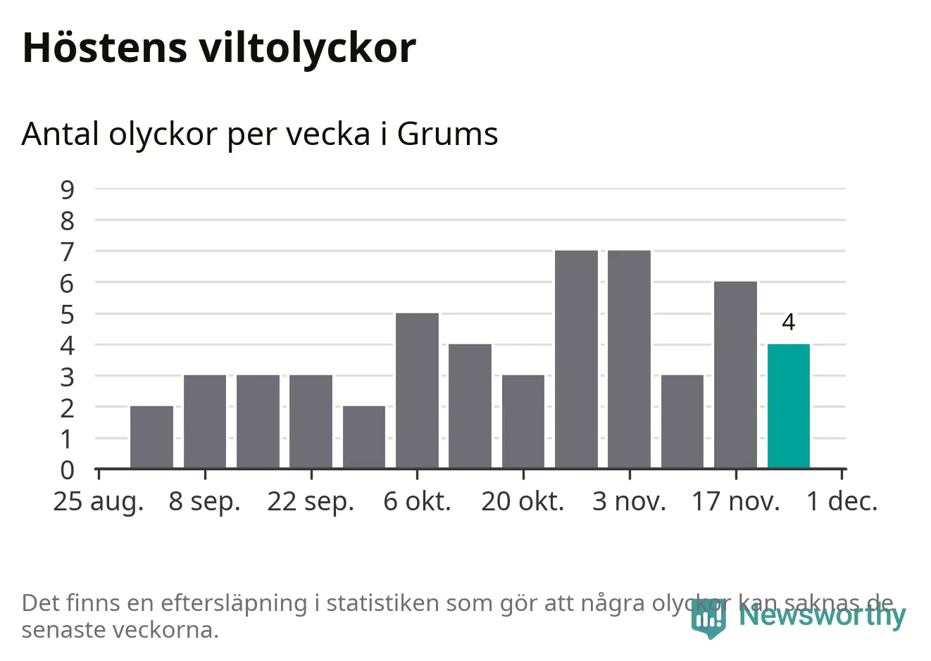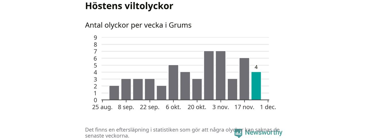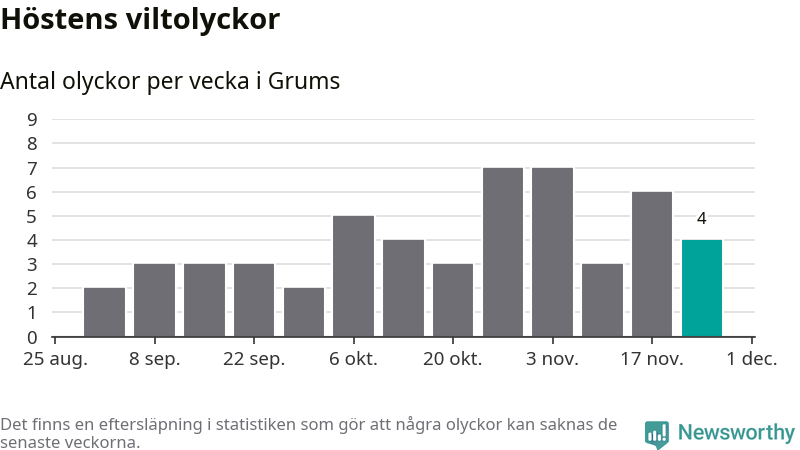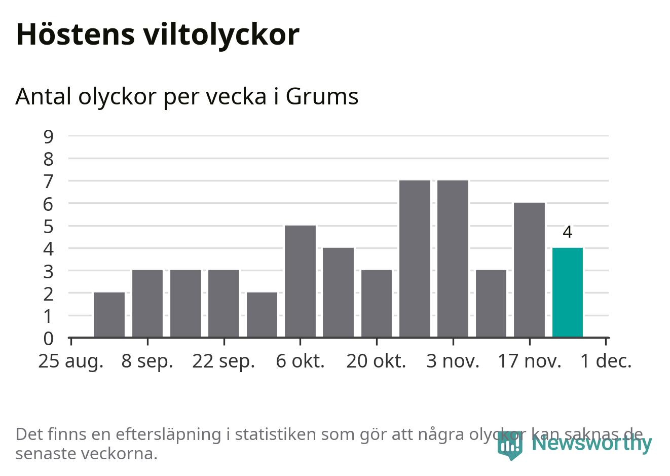 Hittills har fyra viltolyckor rapporterats in i Grums kommun från vecka 48. Se listan här.