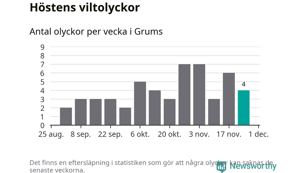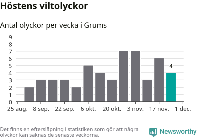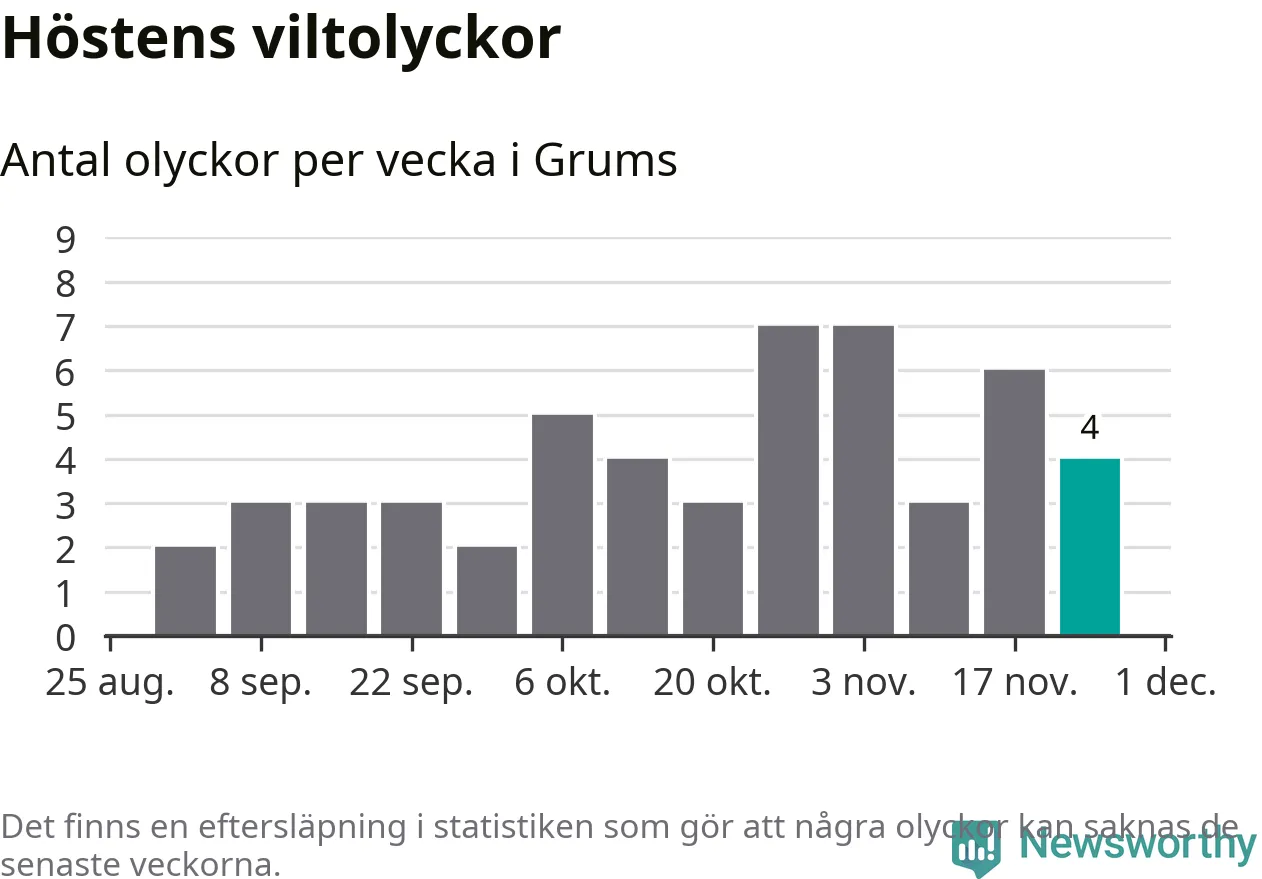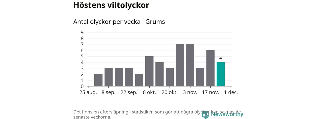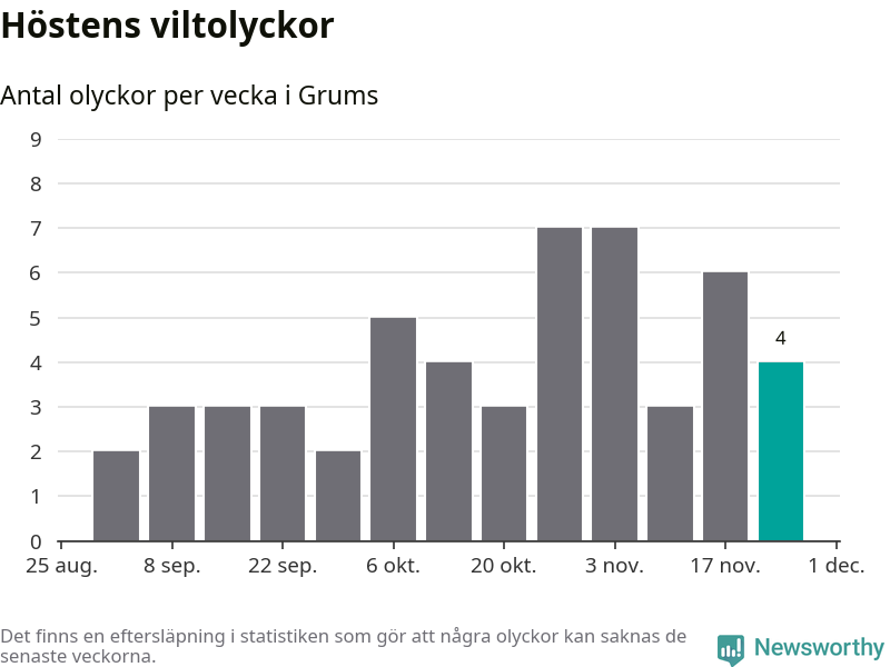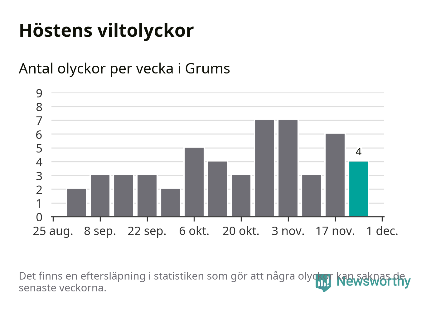 Hittills har fyra viltolyckor rapporterats in i Grums kommun från vecka 48. Se listan här.