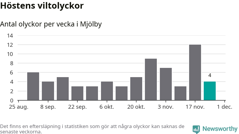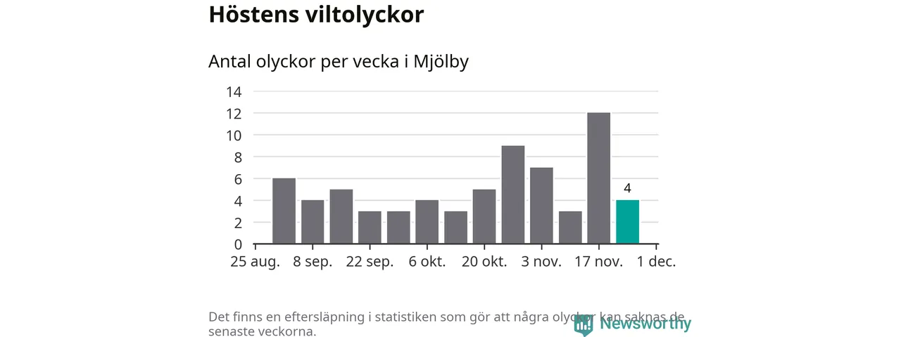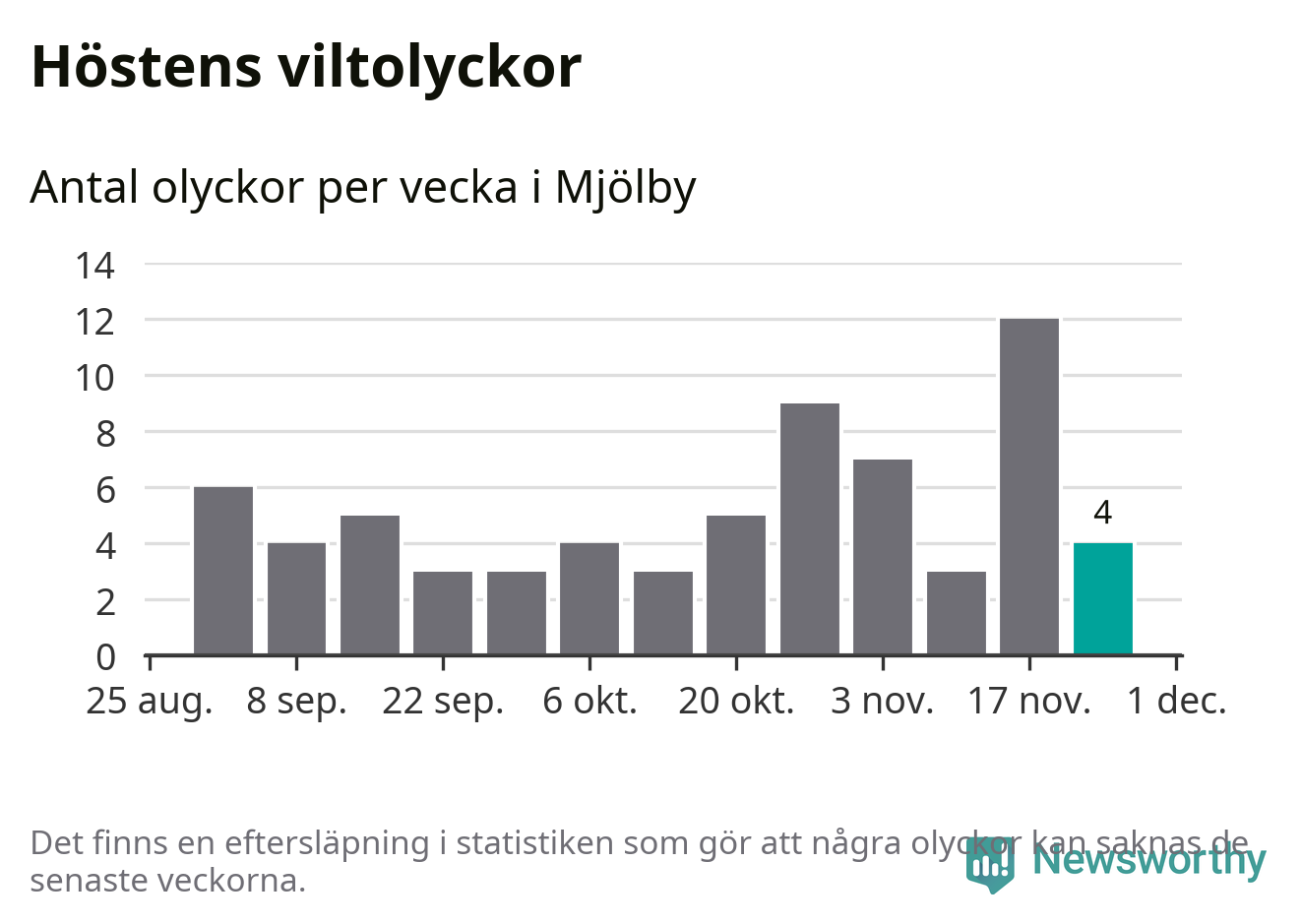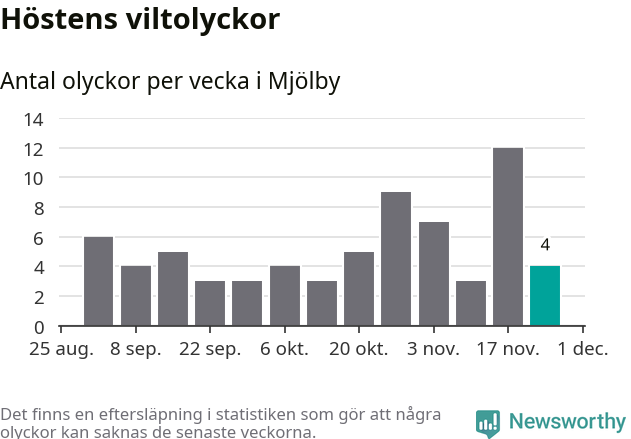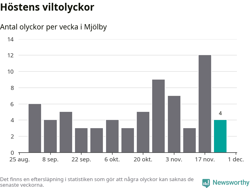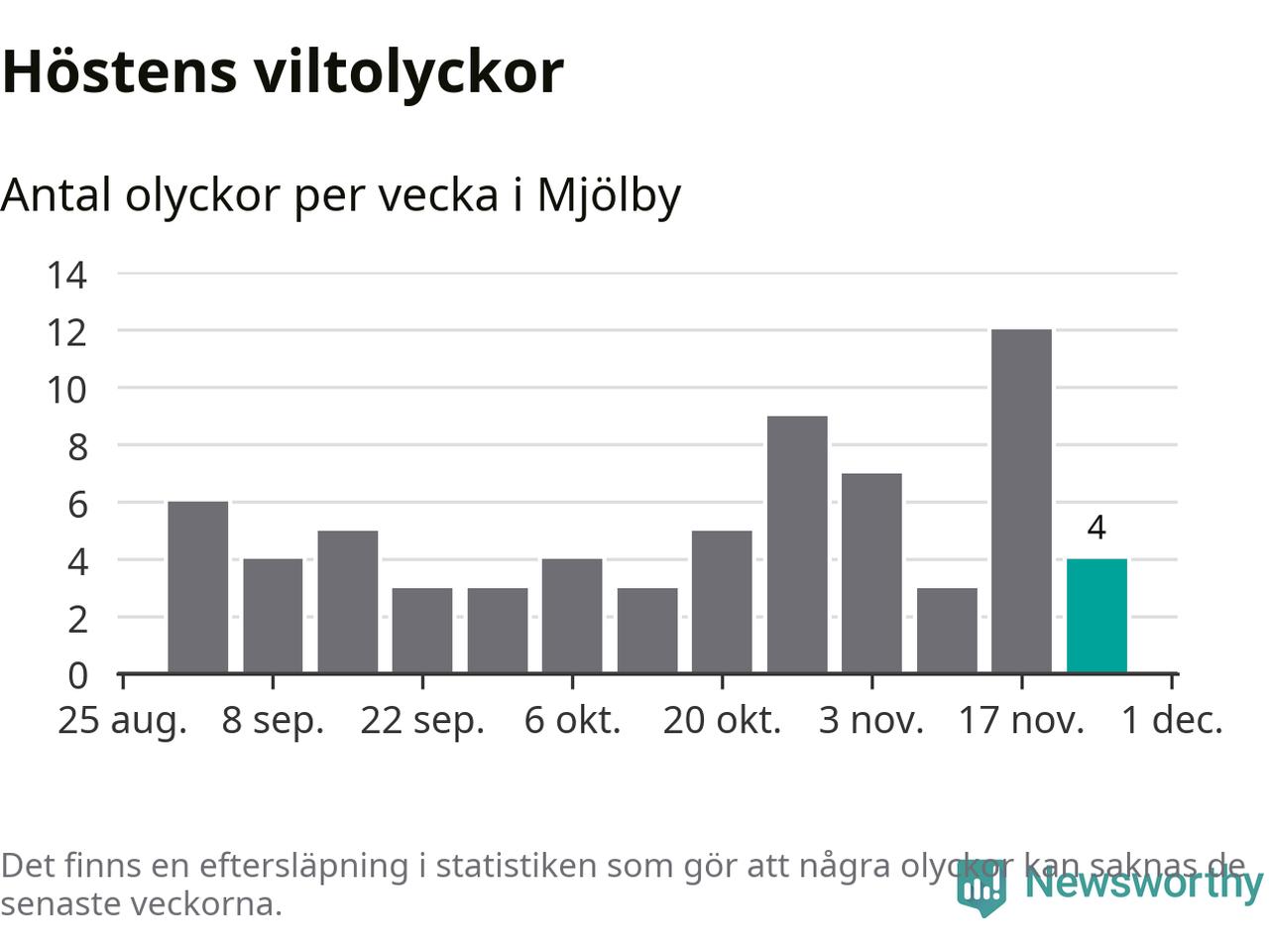 Hittills har fyra viltolyckor rapporterats in i Mjölby kommun från vecka 48. Se listan här.