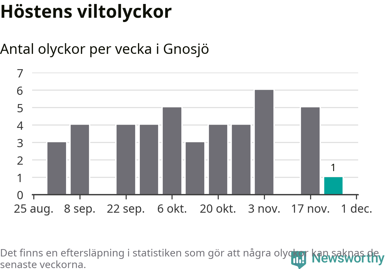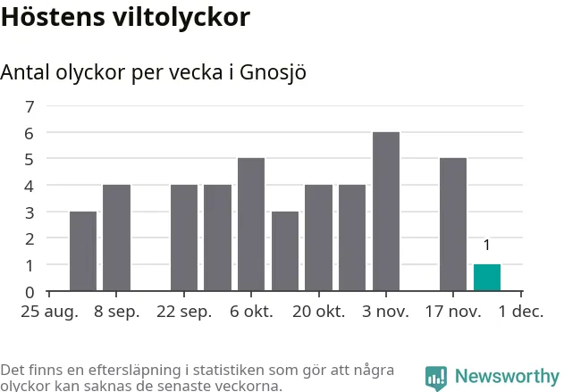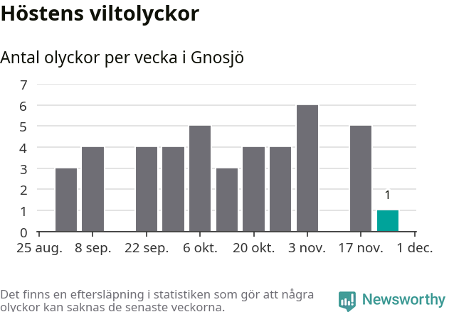 Från förra veckan (vecka 48) har hittills en viltolycka rapporterats in i Gnosjö kommun.