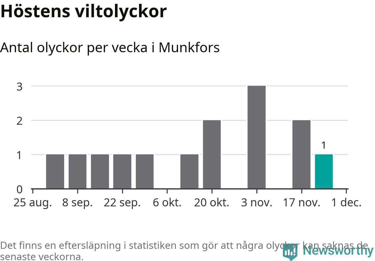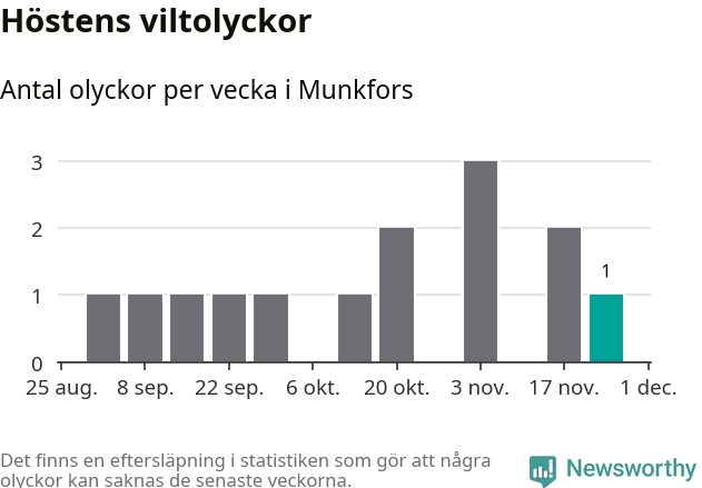 Från förra veckan (vecka 48) har hittills en viltolycka rapporterats in i Munkfors kommun.