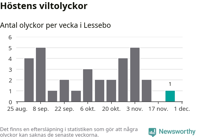 Från förra veckan (vecka 48) har hittills en viltolycka rapporterats in i Lessebo kommun.