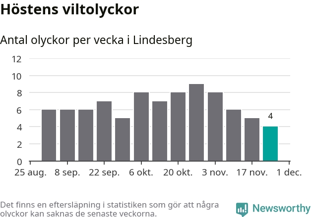 Hittills har fyra viltolyckor rapporterats in i Lindesbergs kommun från vecka 48. Se listan här.