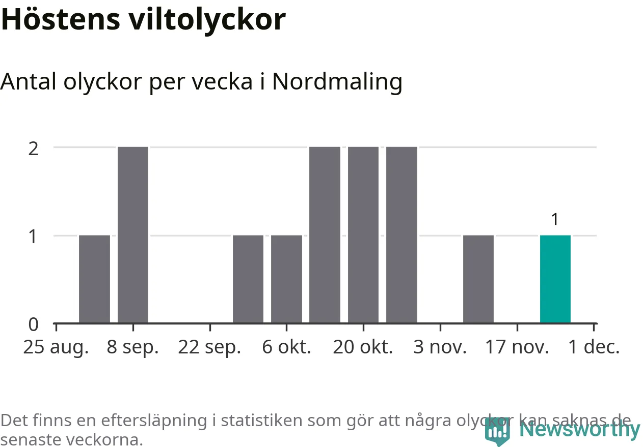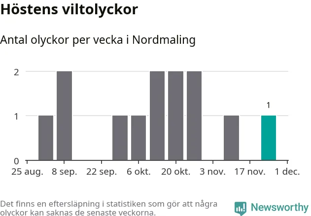Från förra veckan (vecka 48) har hittills en viltolycka rapporterats in i Nordmalings kommun.