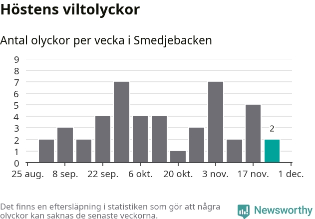 Hittills har två viltolyckor rapporterats in i Smedjebackens kommun från vecka 48. Se listan här.