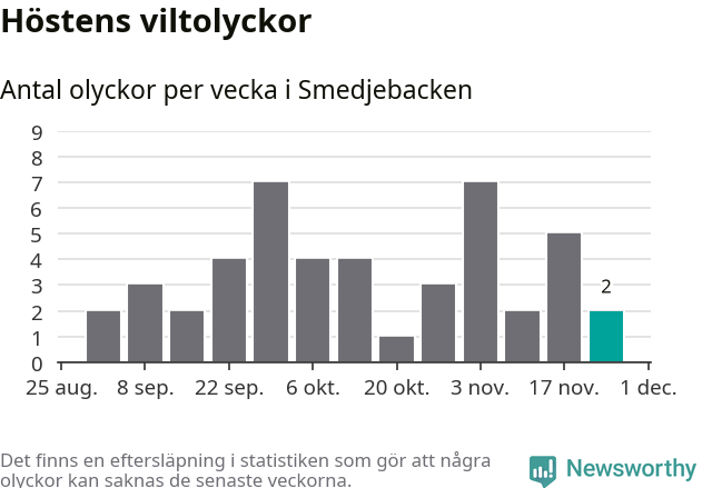 Totalt den här hösten har det inträffat 46 viltolyckor i kommunen. Det är mindre än genomsnittet för motsvarande period (omkring 56) de senaste tio åren.