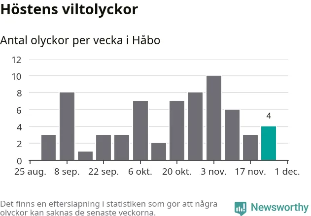 Hittills har fyra viltolyckor rapporterats in i Håbo kommun från vecka 48. Se listan här.