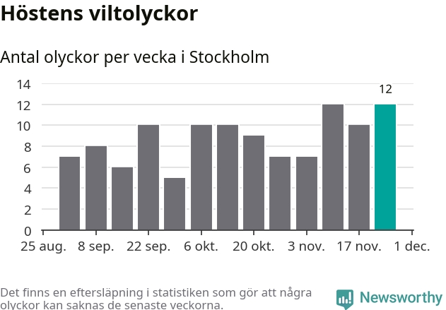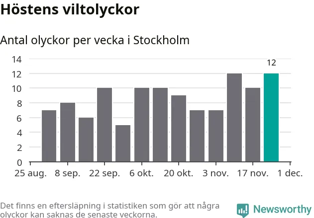 Tolv olyckor är ovanligt många för en höstvecka. Bara en gång tidigare sedan 2015 har det skett