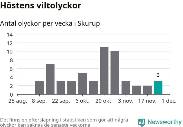 Hittills har tre viltolyckor rapporterats in i Skurups kommun från vecka 48. Se listan här.