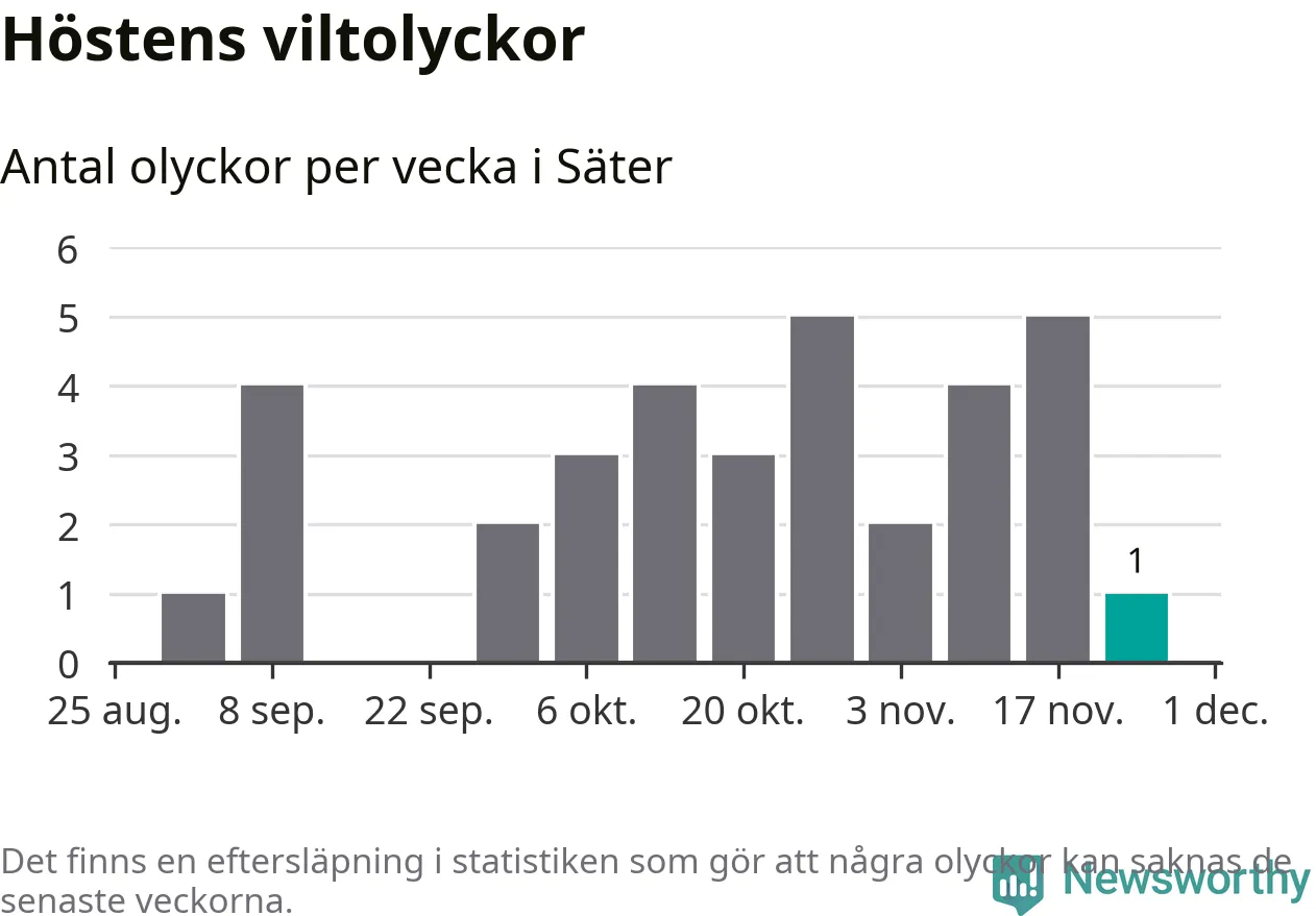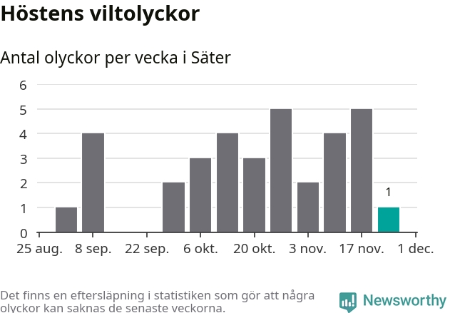 Från förra veckan (vecka 48) har hittills en viltolycka rapporterats in i Säters kommun.