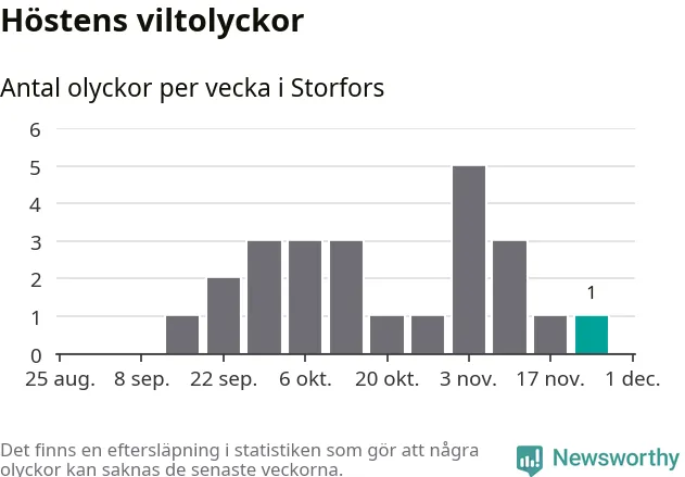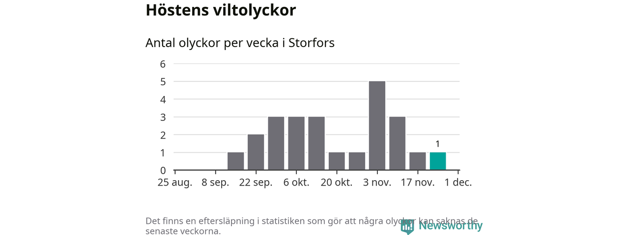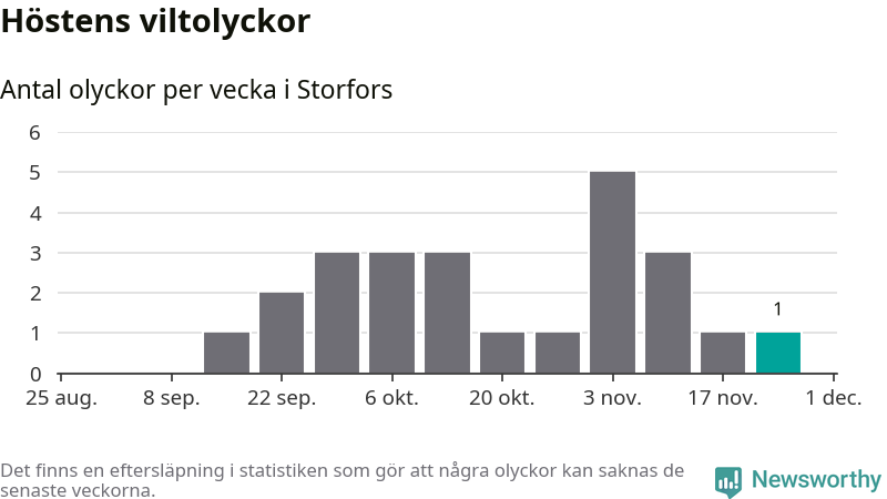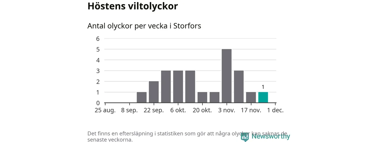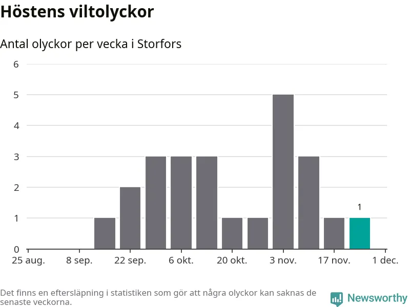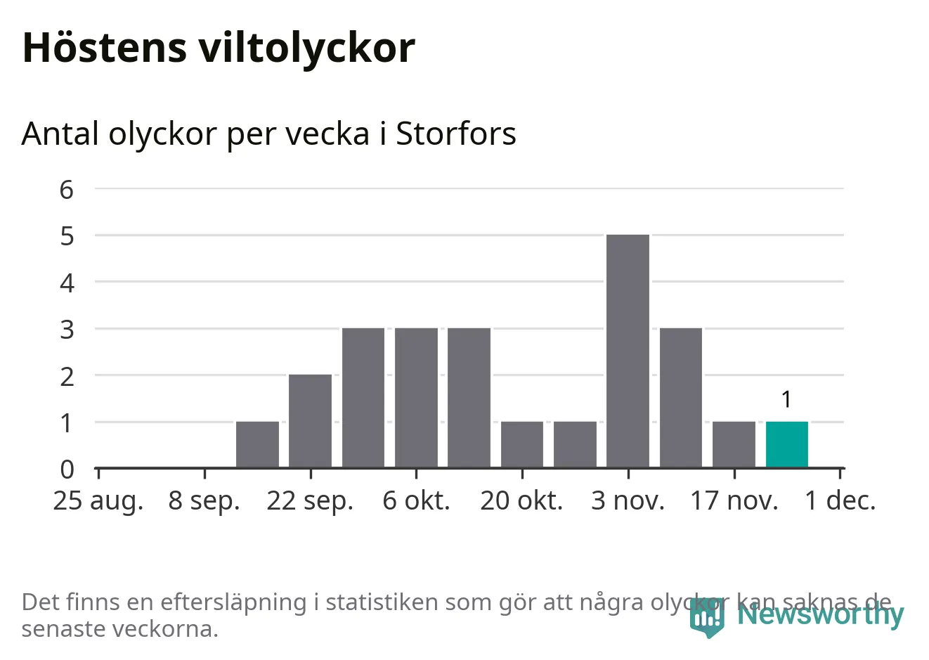 Från förra veckan (vecka 48) har hittills en viltolycka rapporterats in i Storfors kommun.