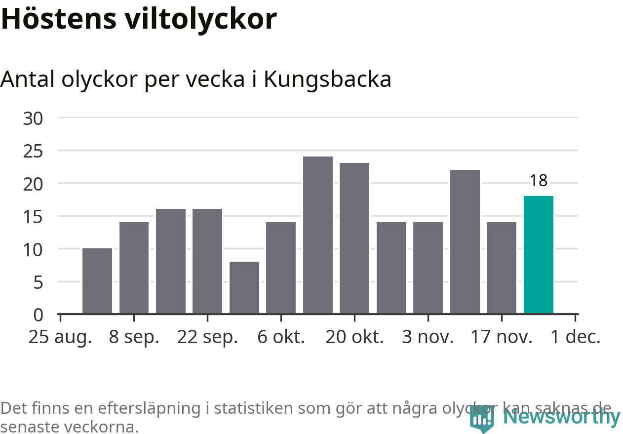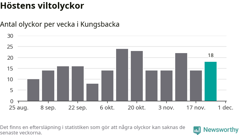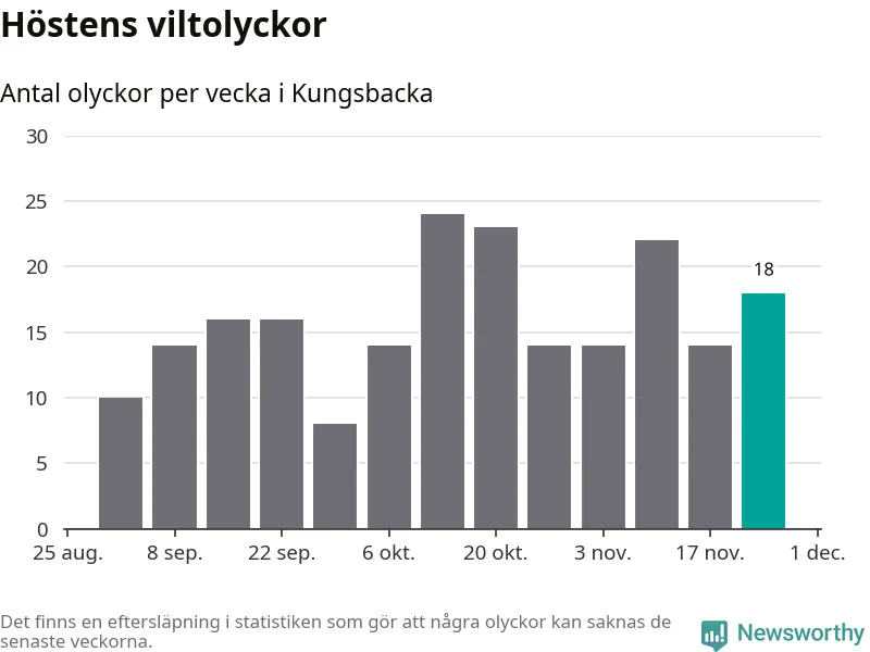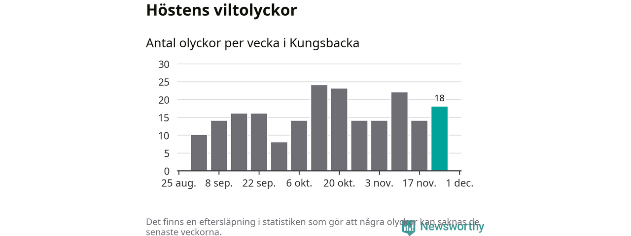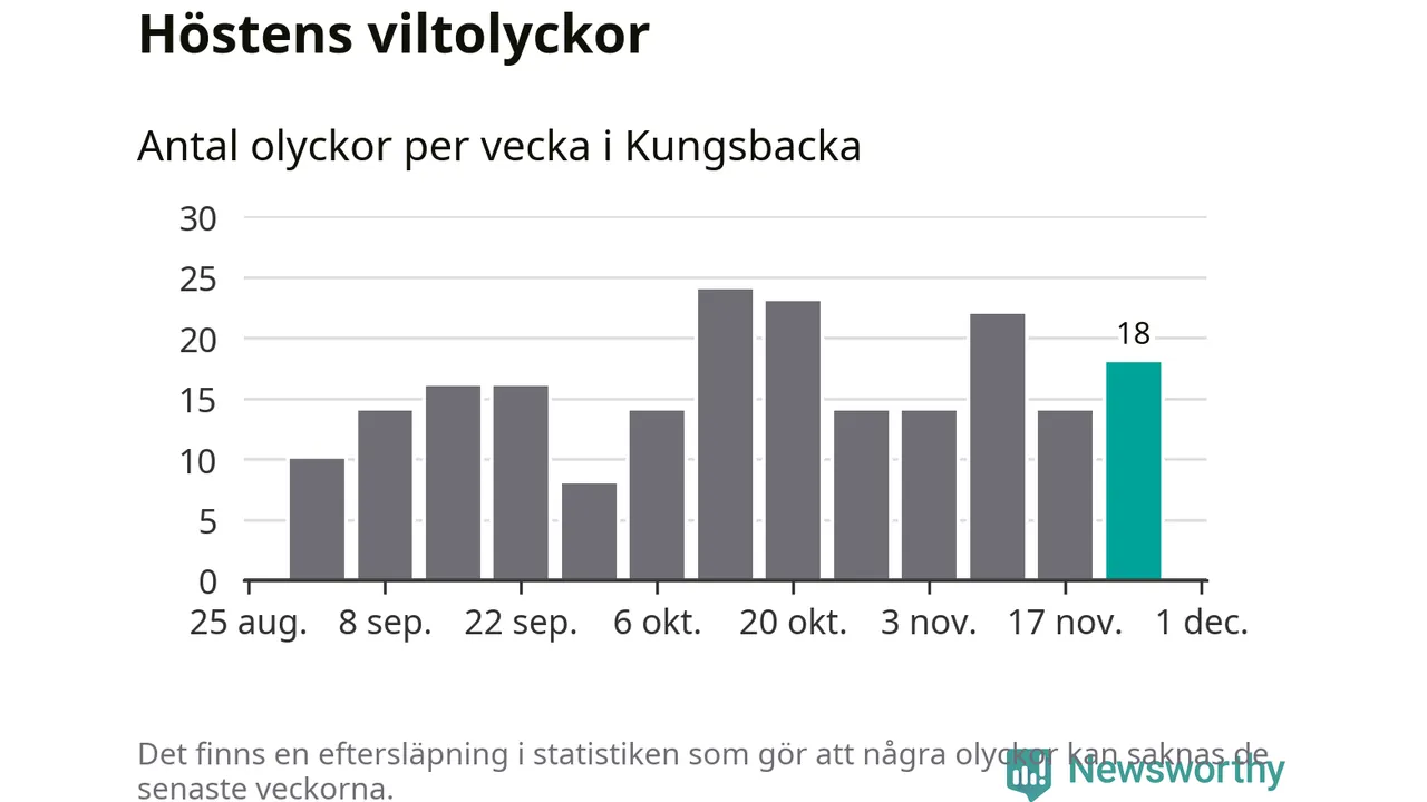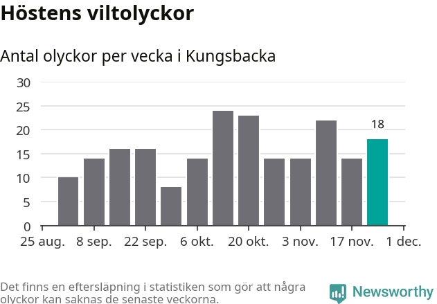Hittills har 18 viltolyckor rapporterats in i Kungsbacka kommun från vecka 48. Se listan här.