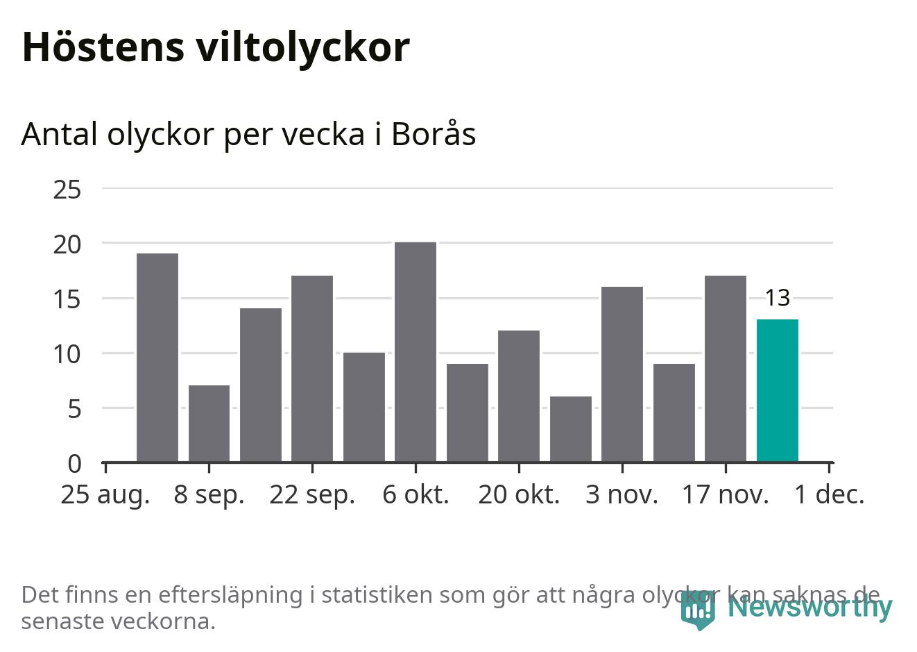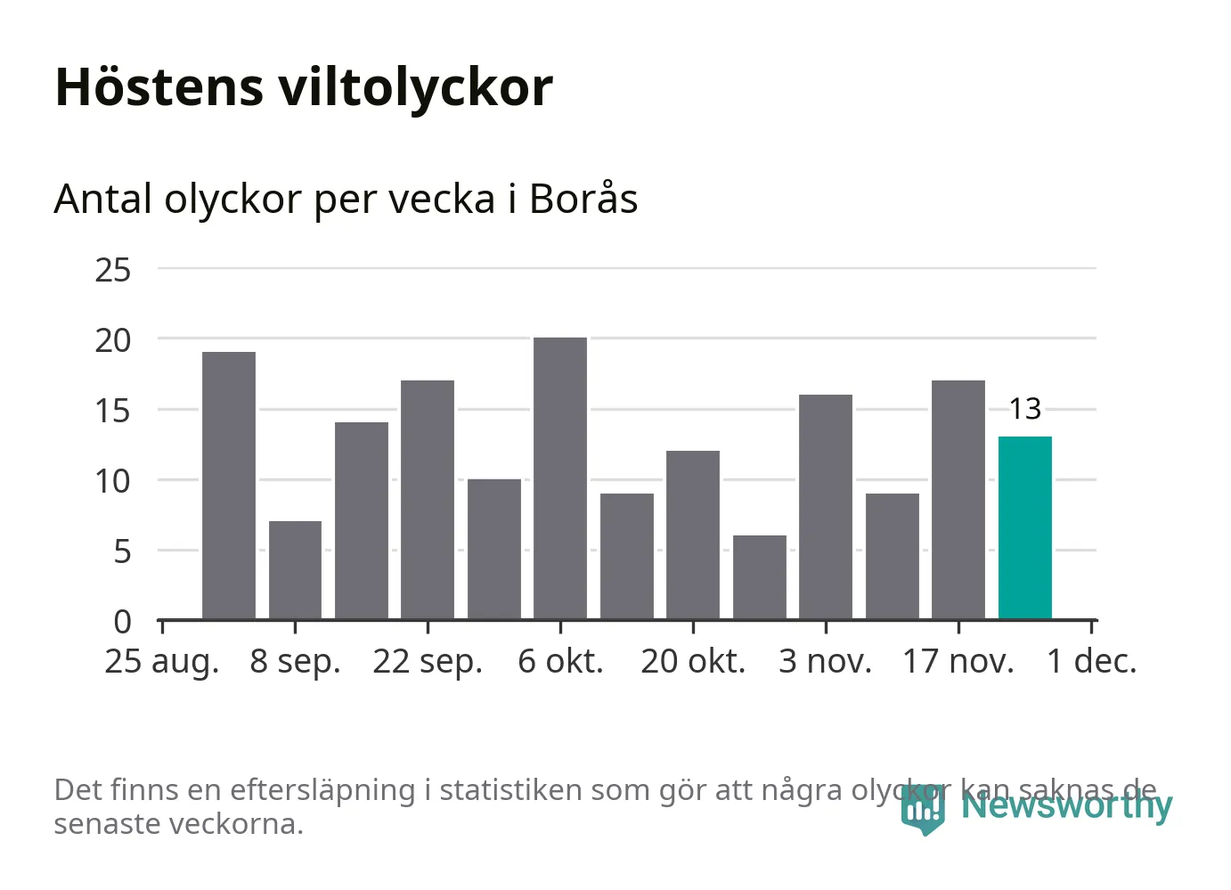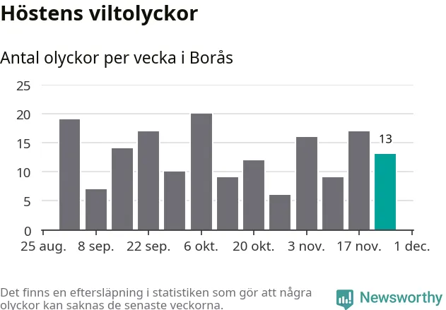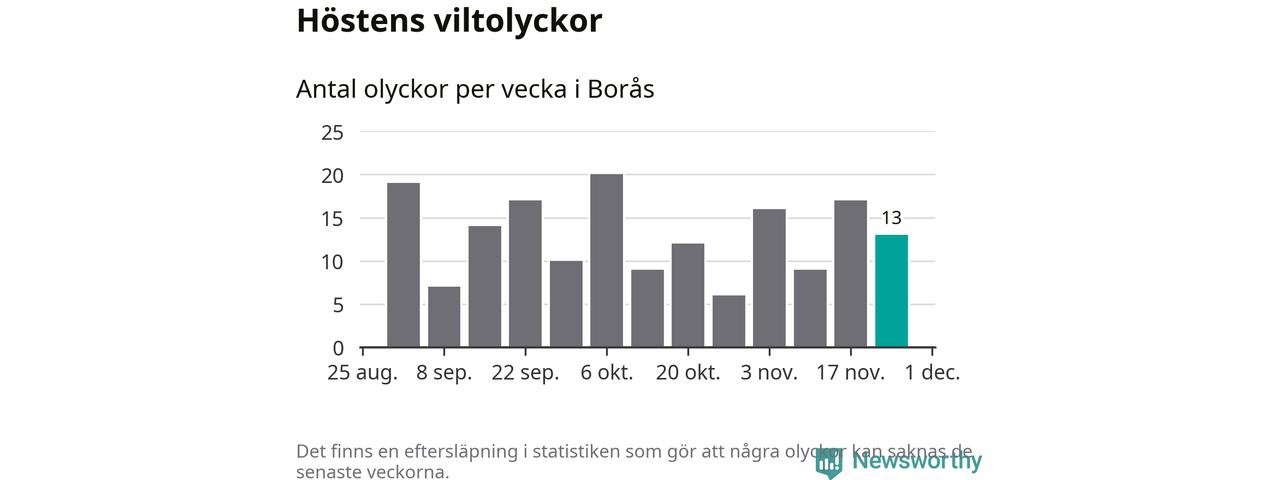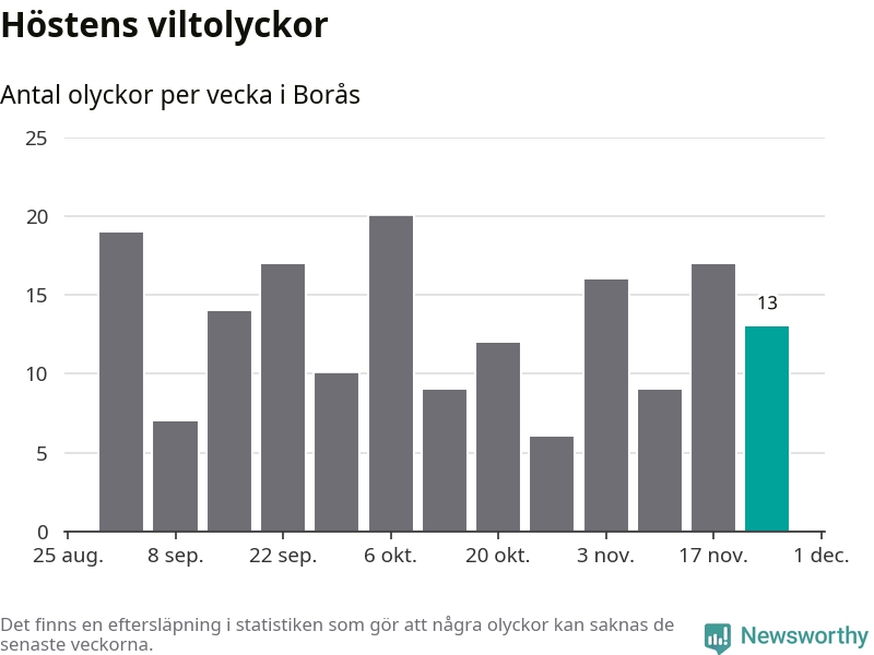 Hittills har 13 viltolyckor rapporterats in i Borås kommun från vecka 48. Se listan här.