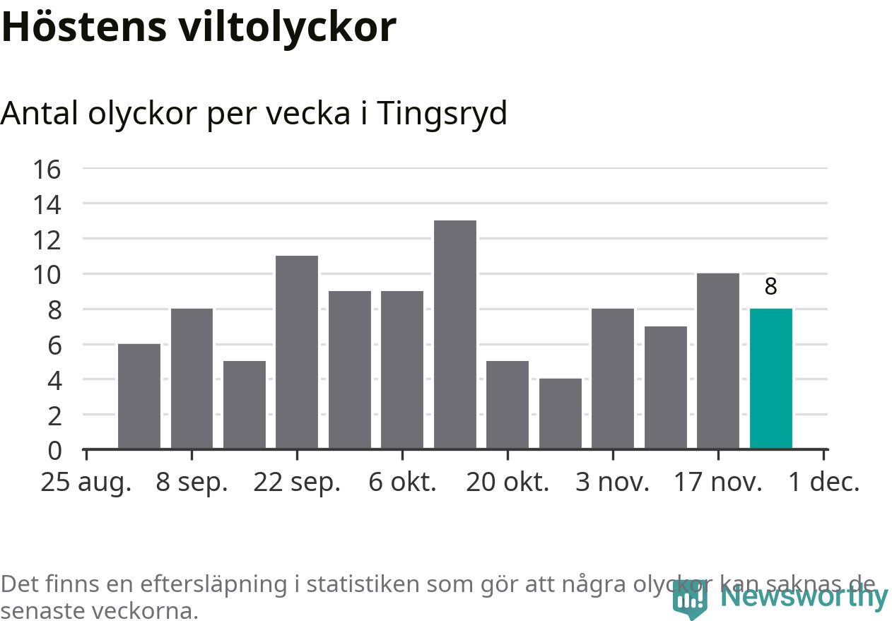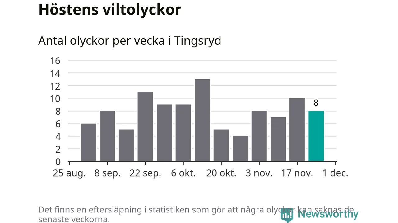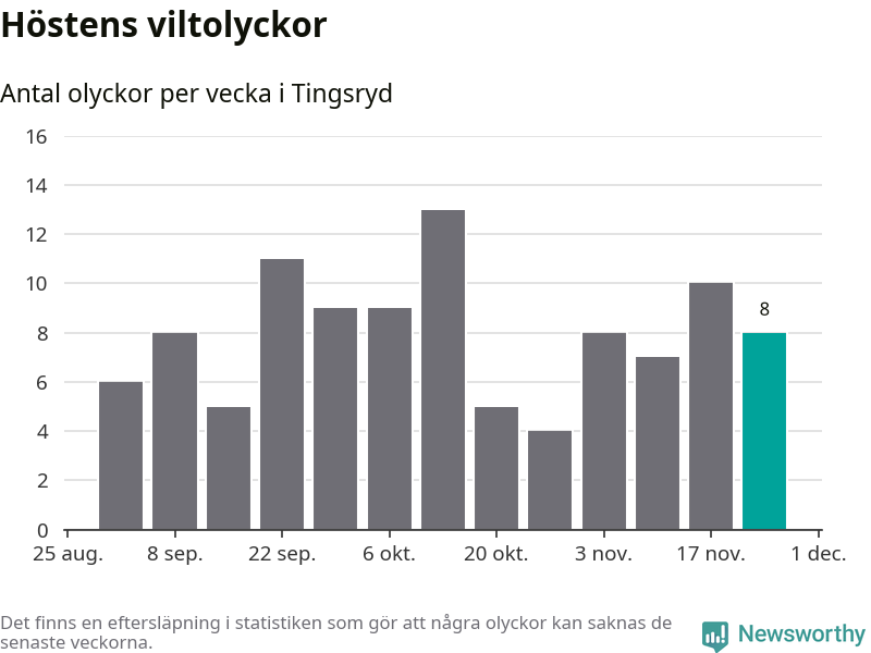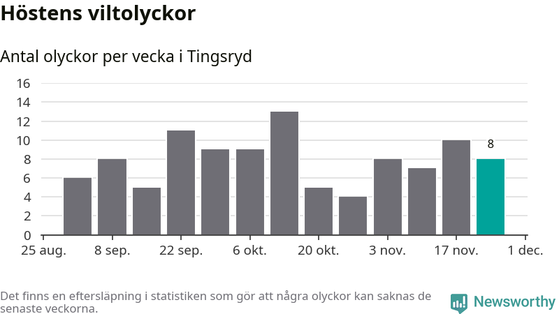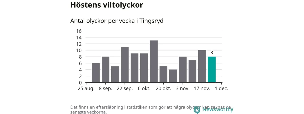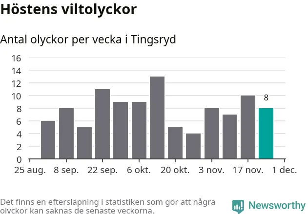 Hittills har åtta viltolyckor rapporterats in i Tingsryds kommun från vecka 48. Se listan här.