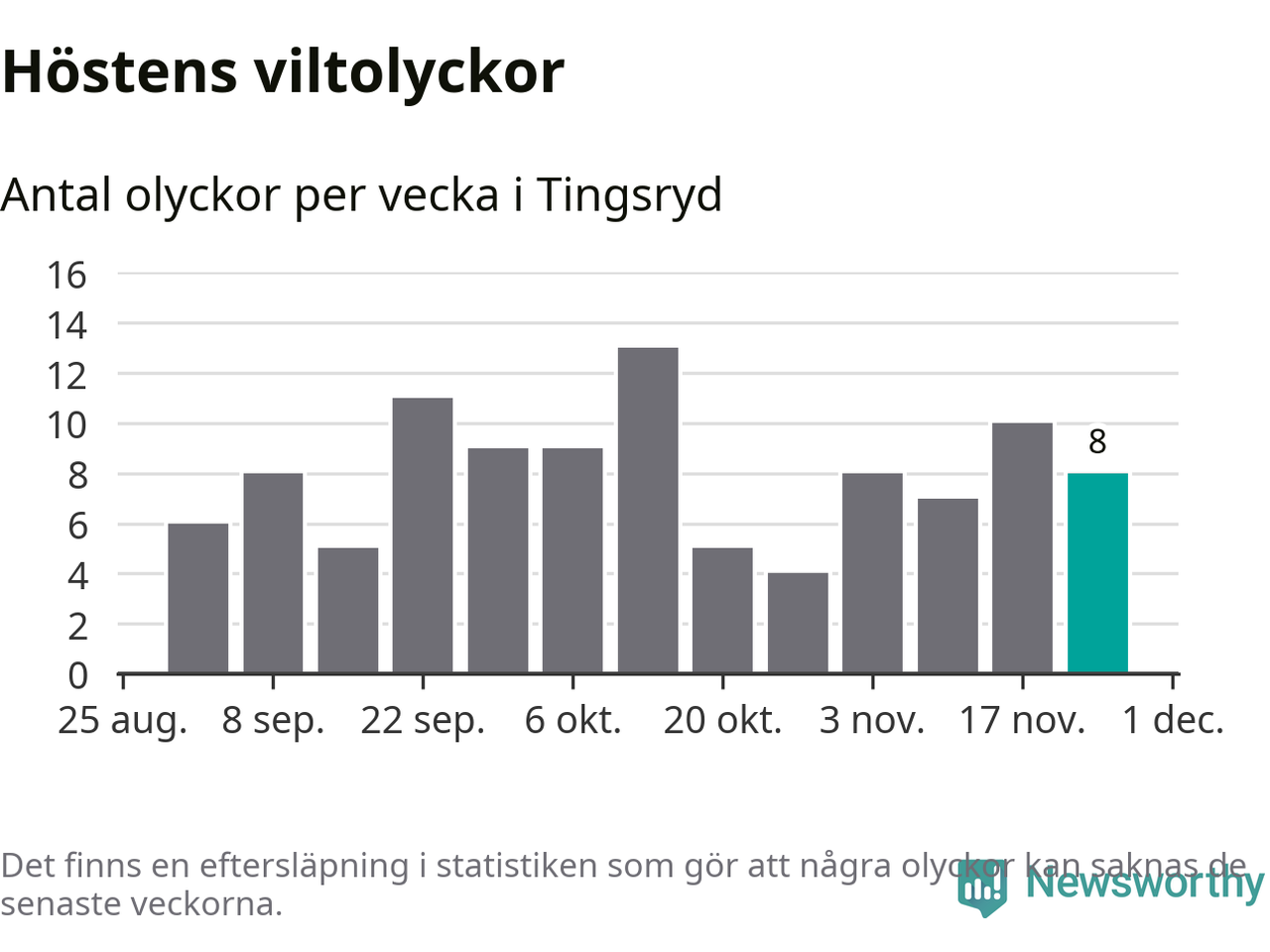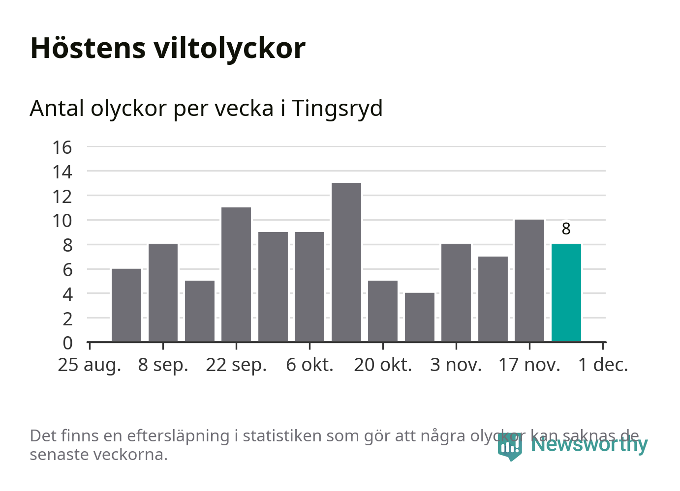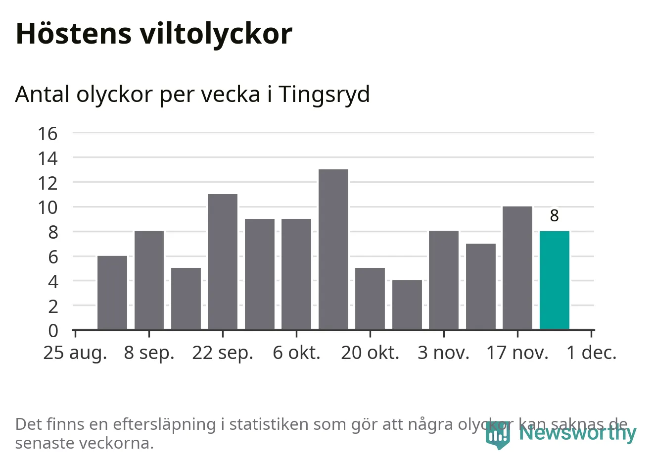Hittills har åtta viltolyckor rapporterats in i Tingsryds kommun från vecka 48. Se listan här.
