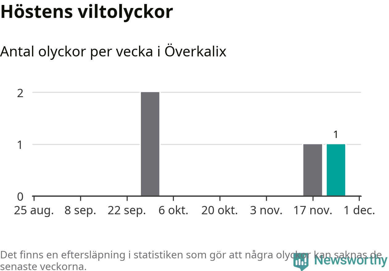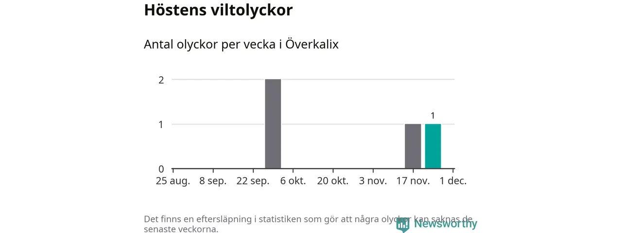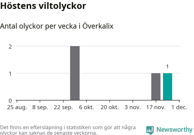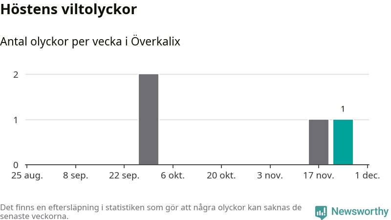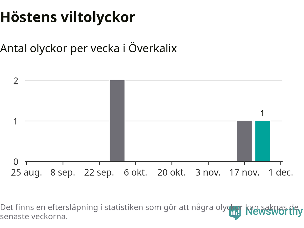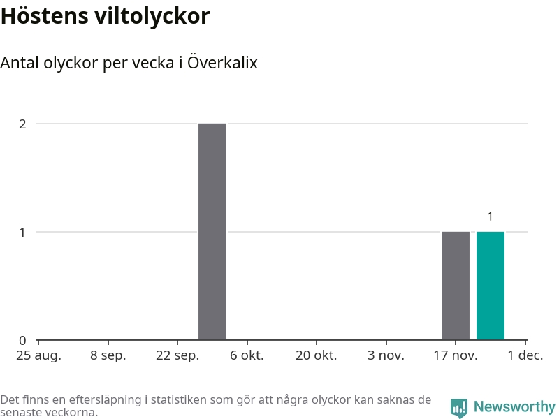 Från förra veckan (vecka 48) har hittills en viltolycka rapporterats in i Överkalix kommun.