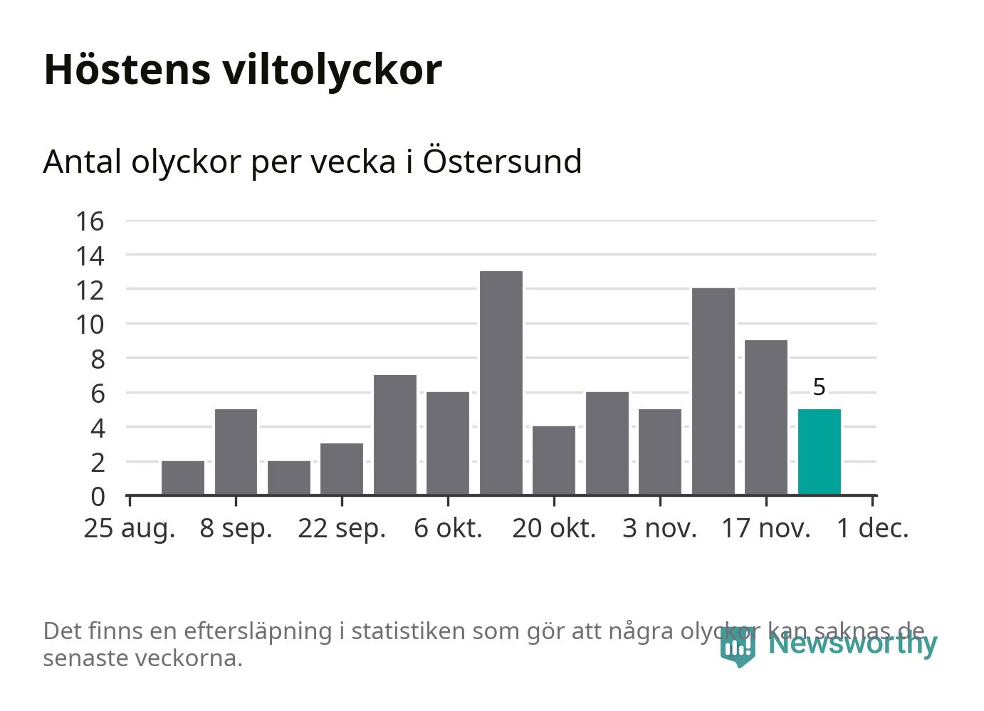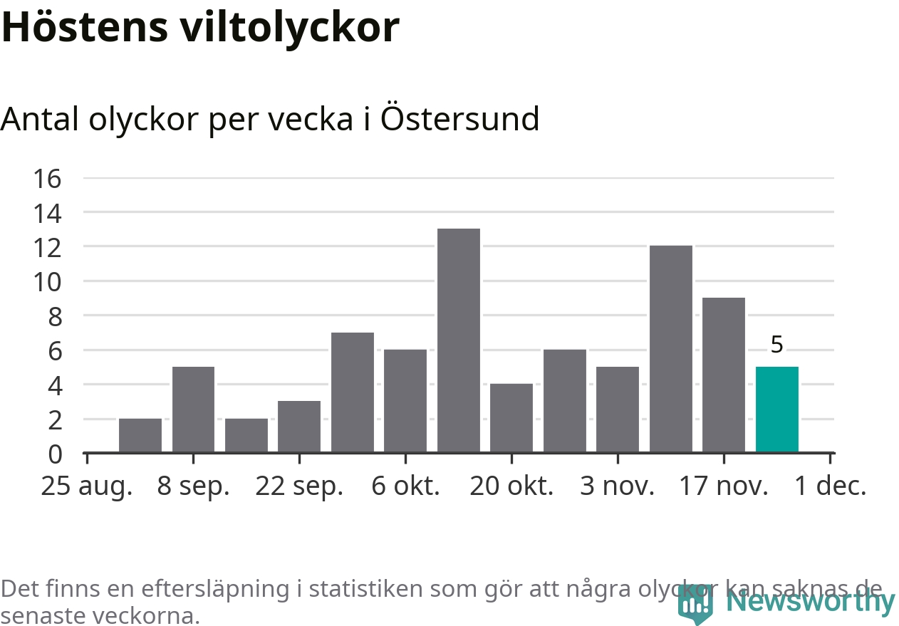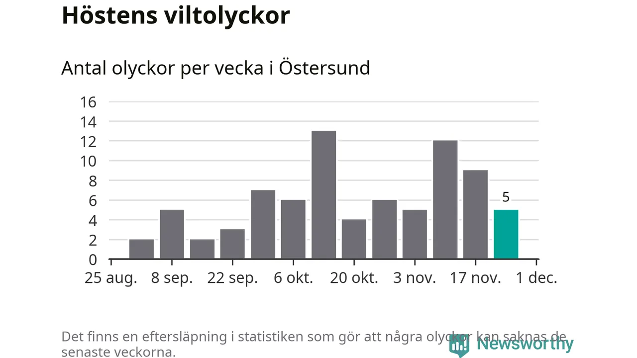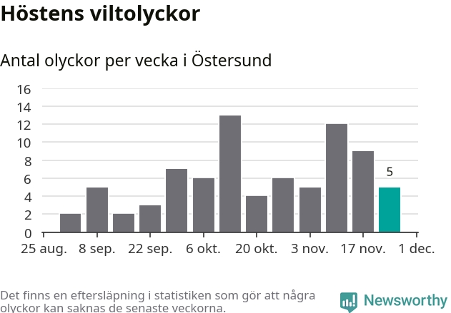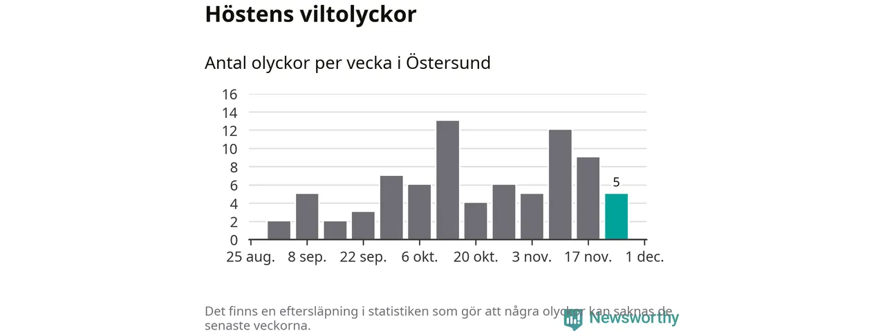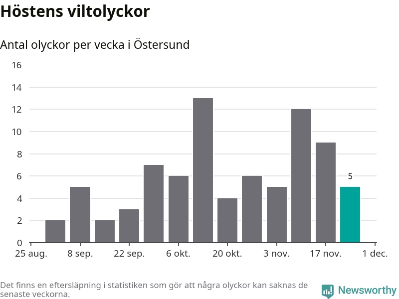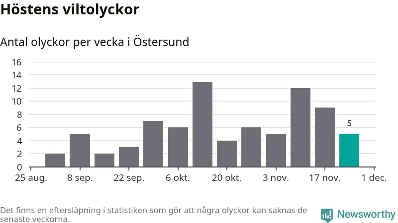 Hittills har fem viltolyckor rapporterats in i Östersunds kommun från vecka 48. Se listan här.