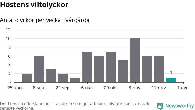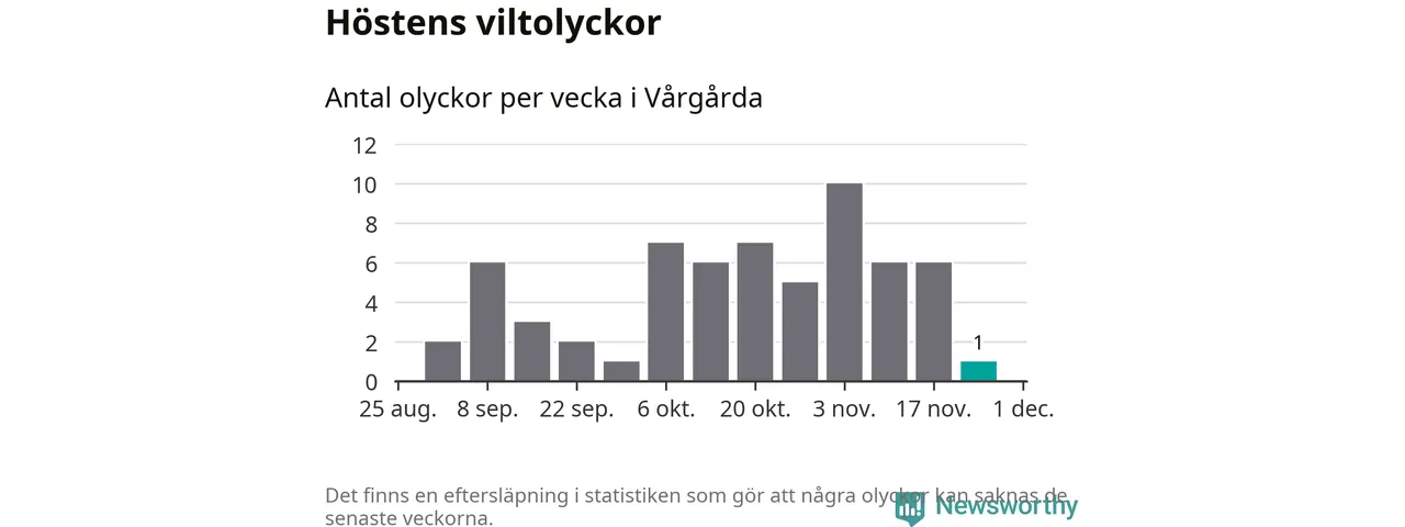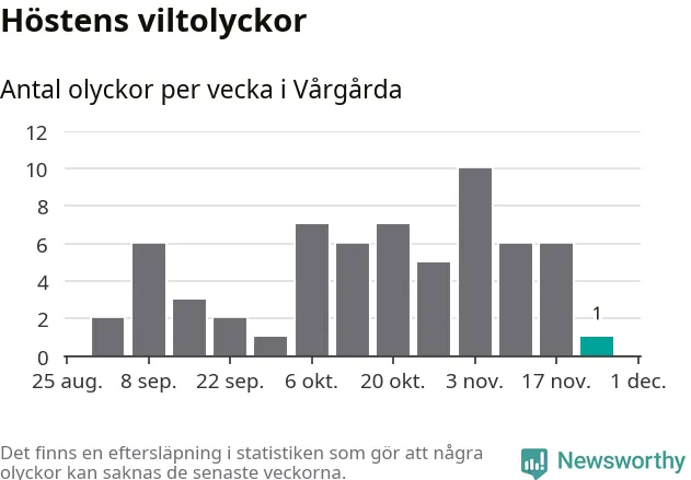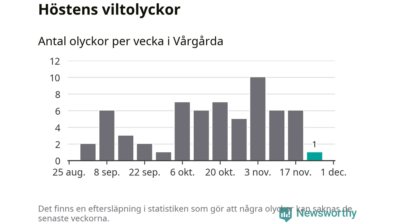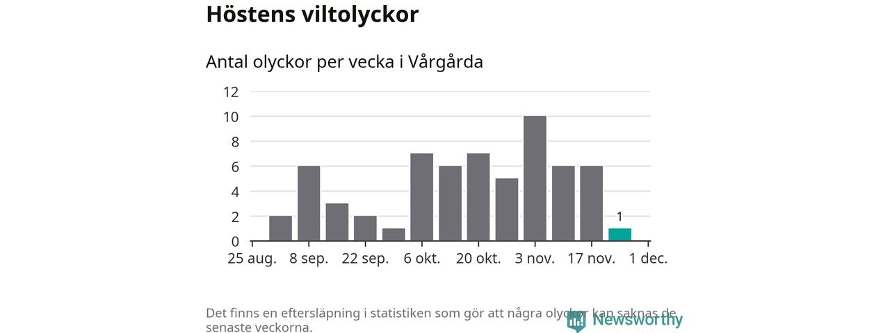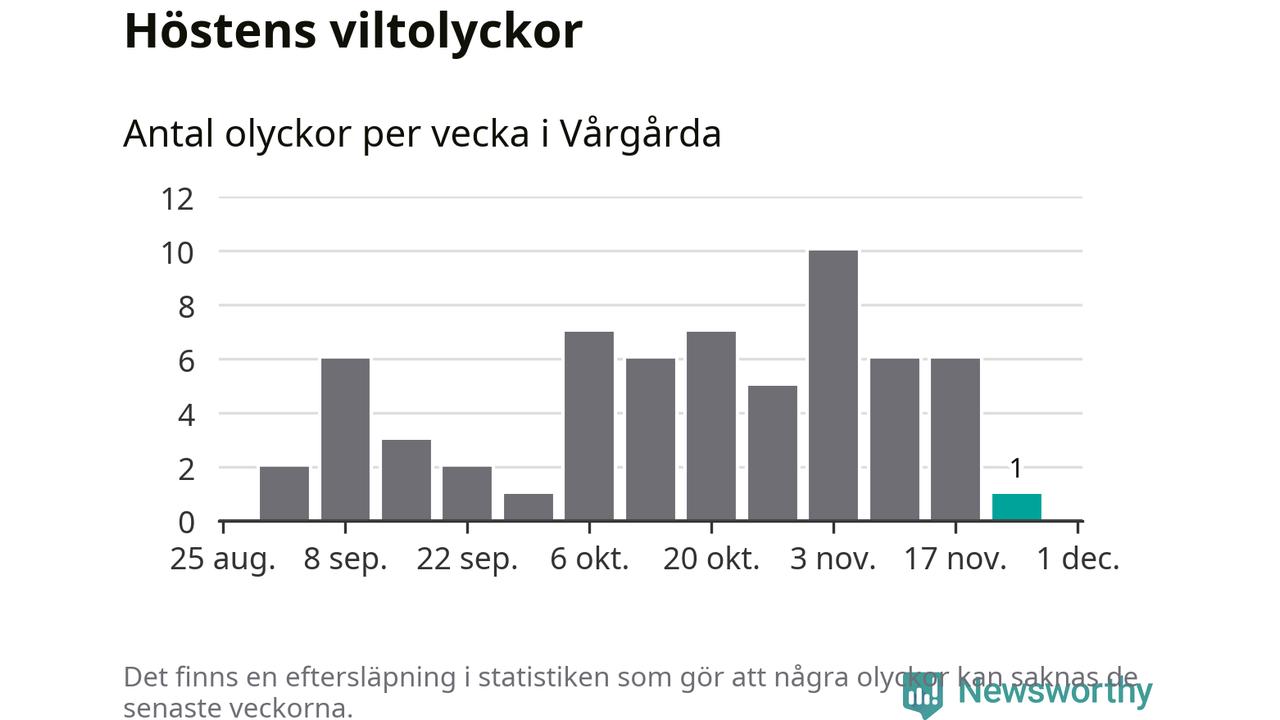 Från förra veckan (vecka 48) har hittills en viltolycka rapporterats in i Vårgårda kommun.