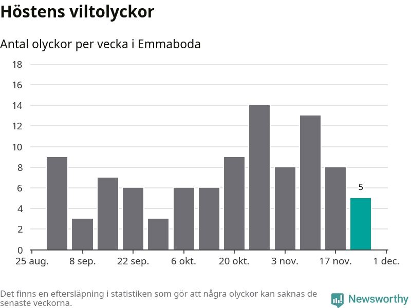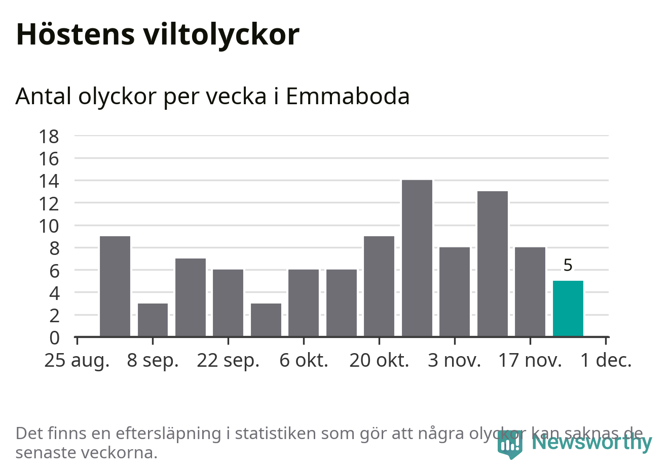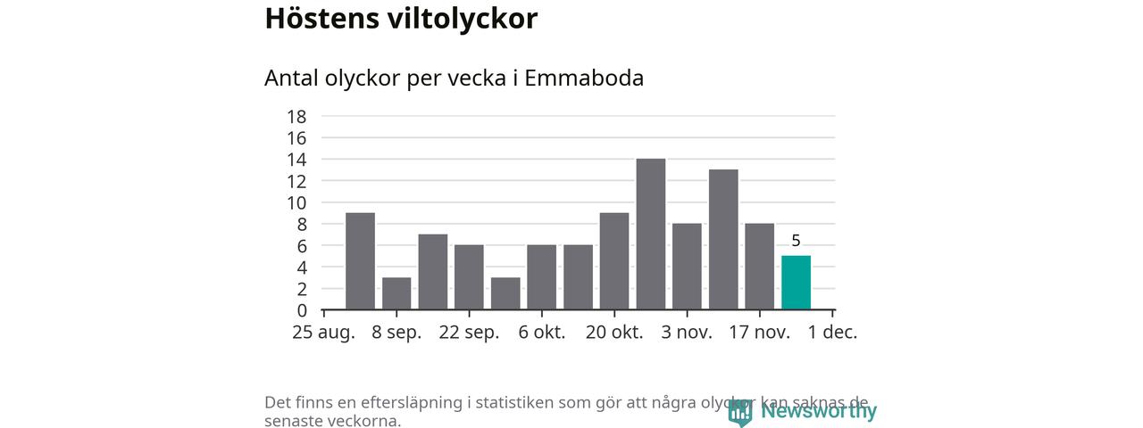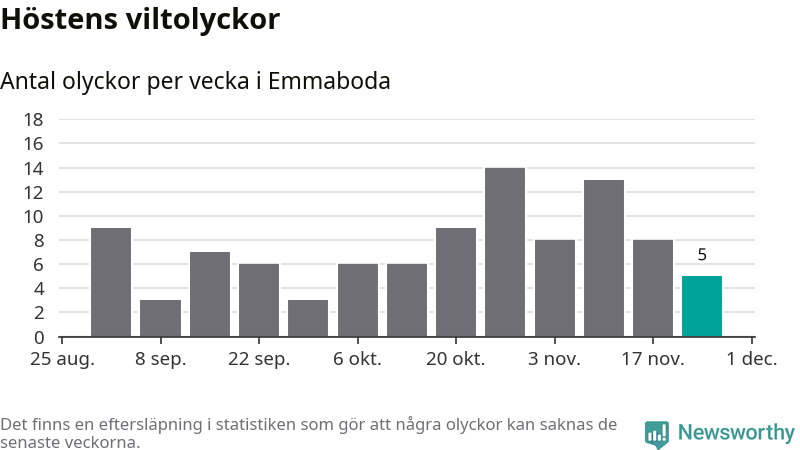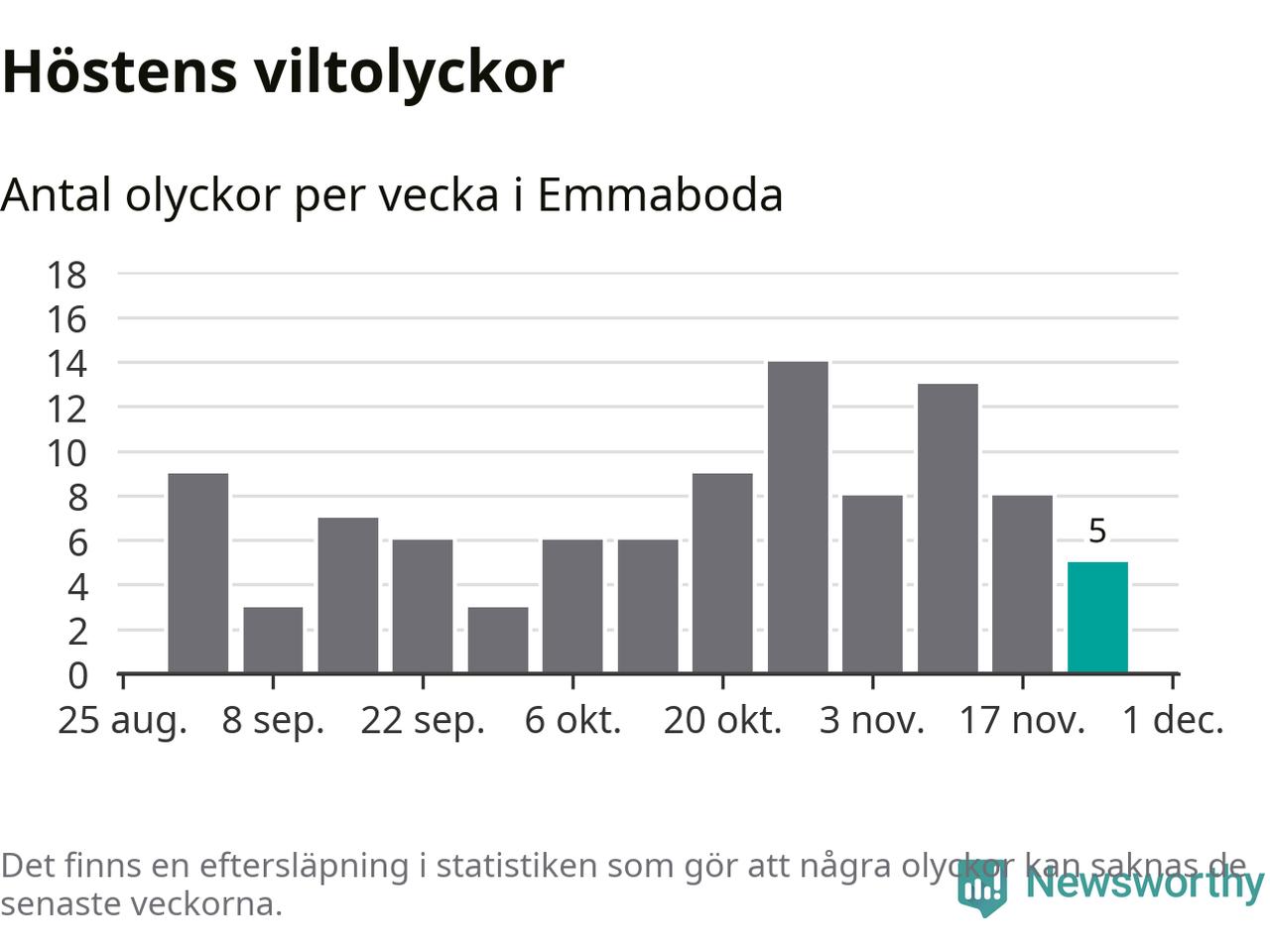 Hittills har fem viltolyckor rapporterats in i Emmaboda kommun från vecka 48. Se listan här.