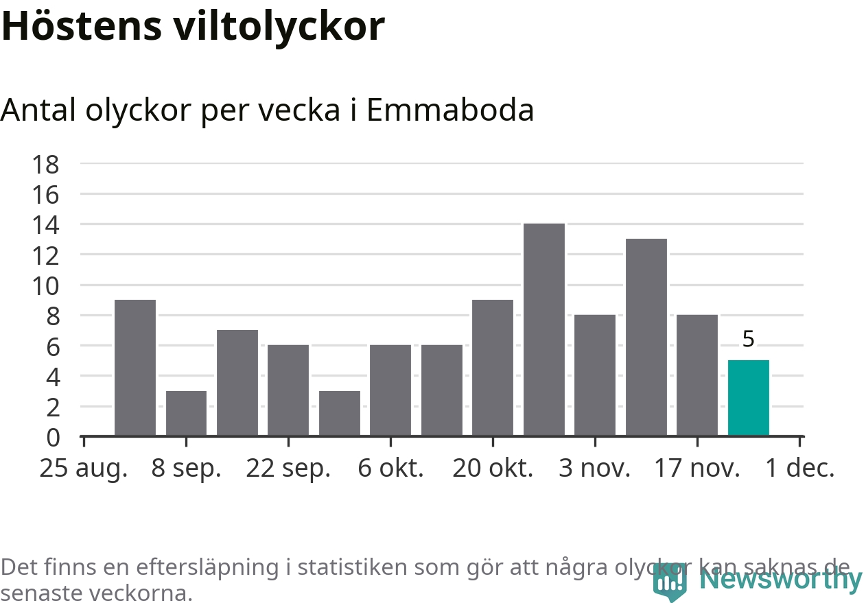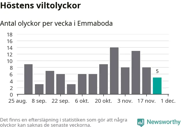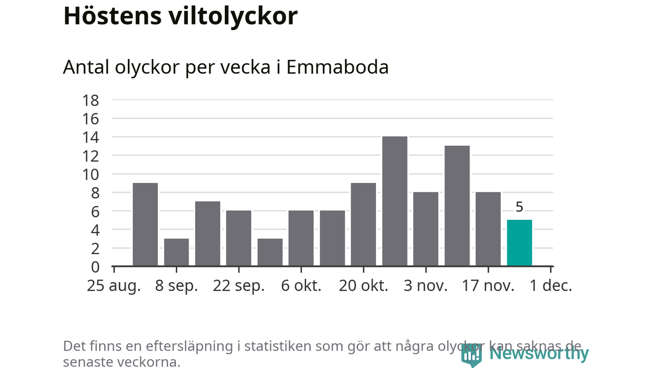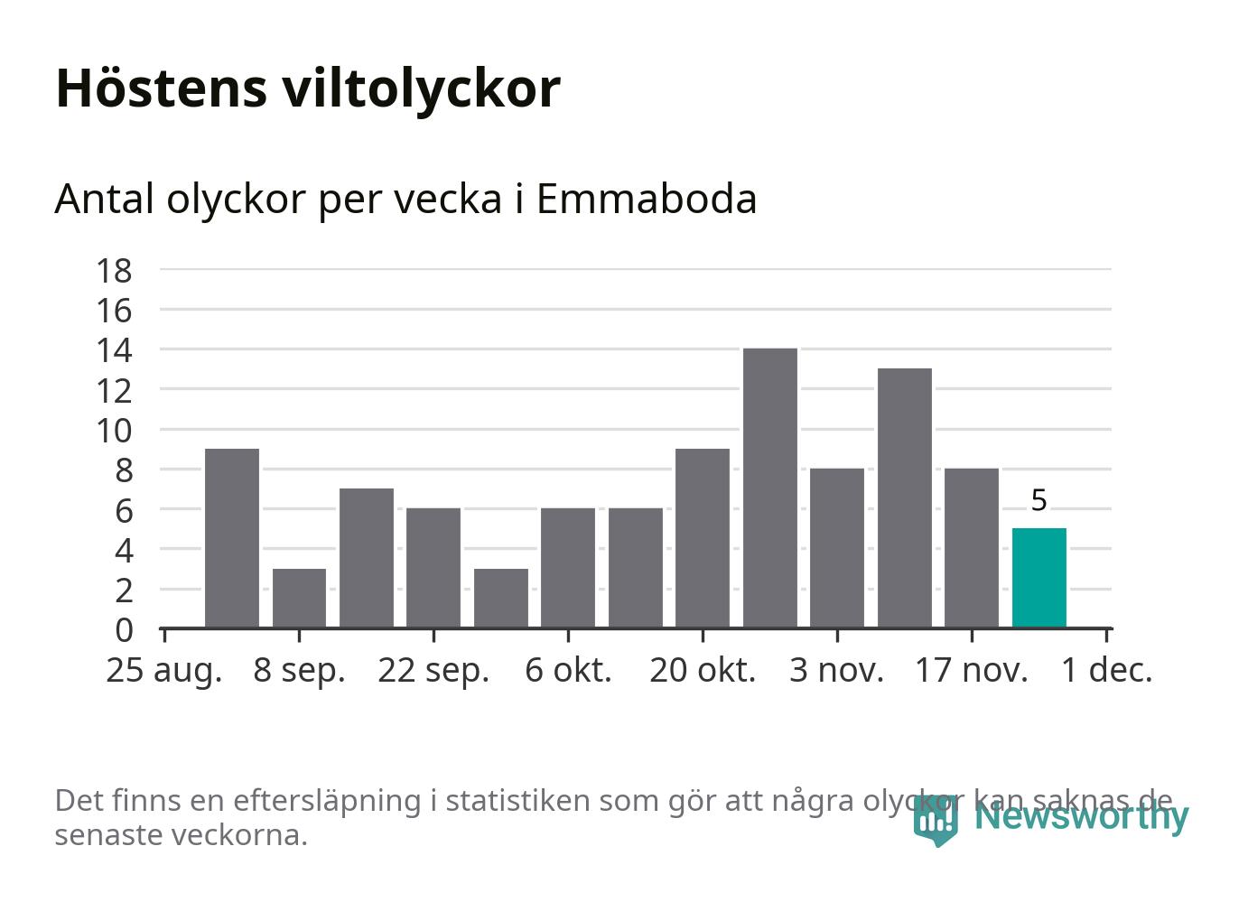 Hittills har fem viltolyckor rapporterats in i Emmaboda kommun från vecka 48. Se listan här.