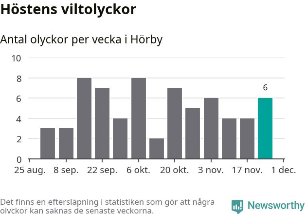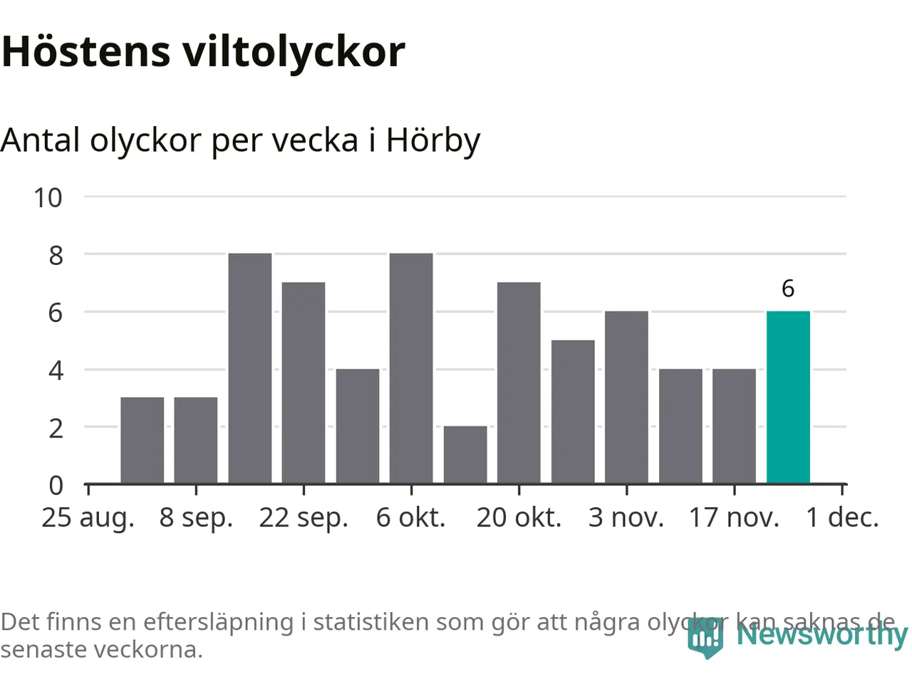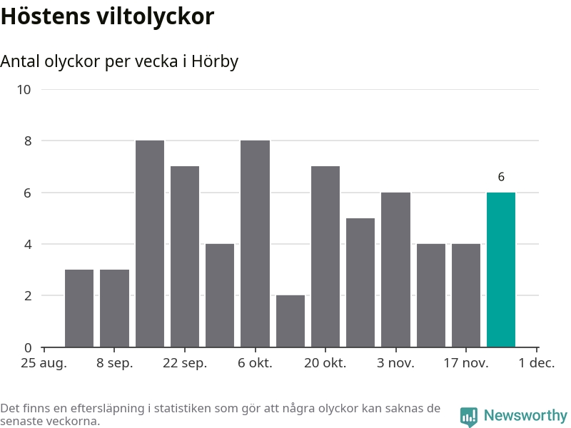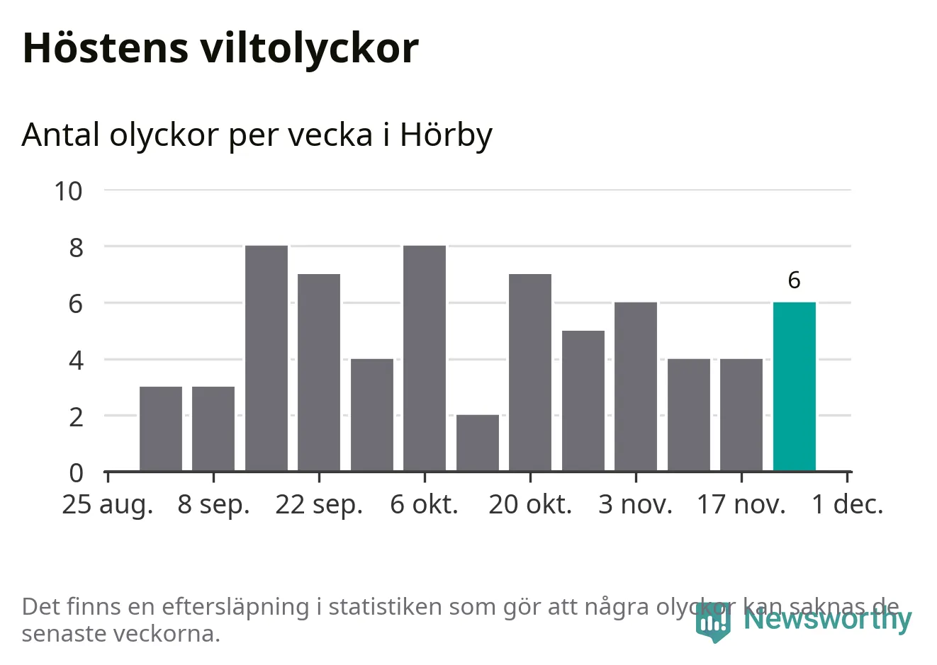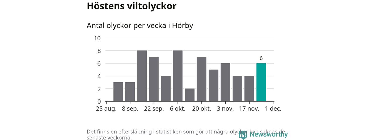 Hittills har sex viltolyckor rapporterats in i Hörby kommun från vecka 48. Se listan här.