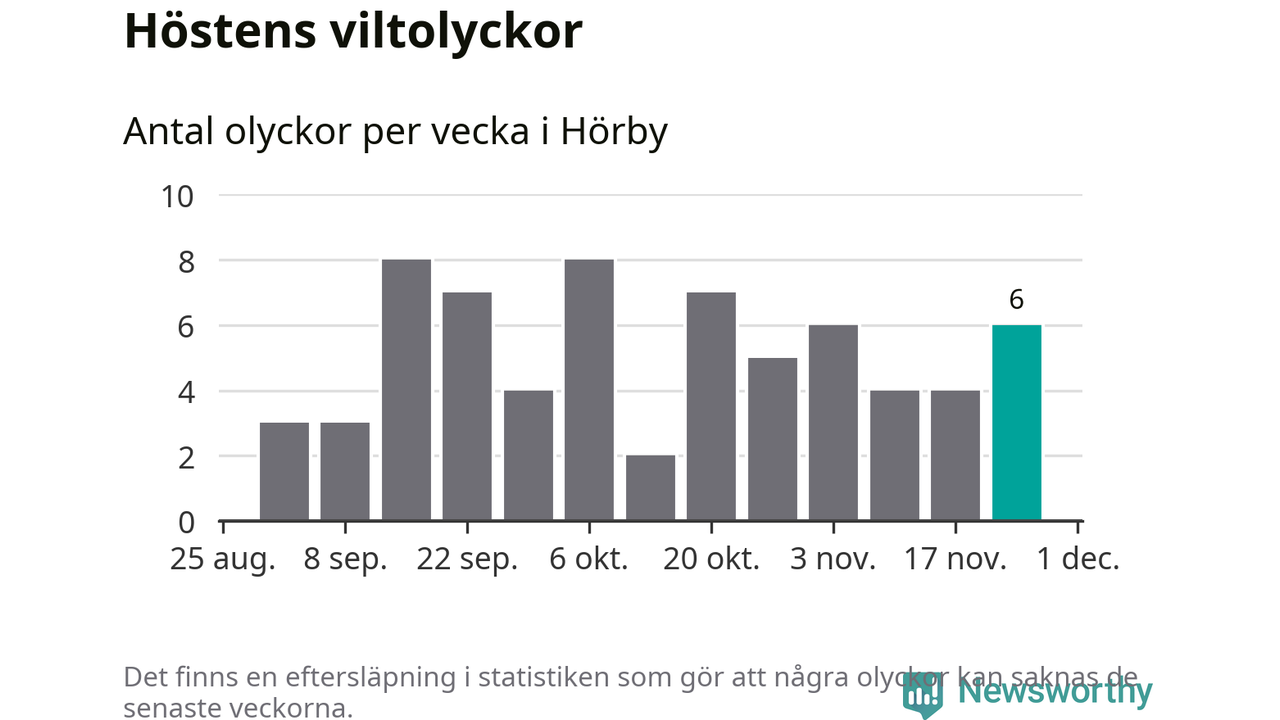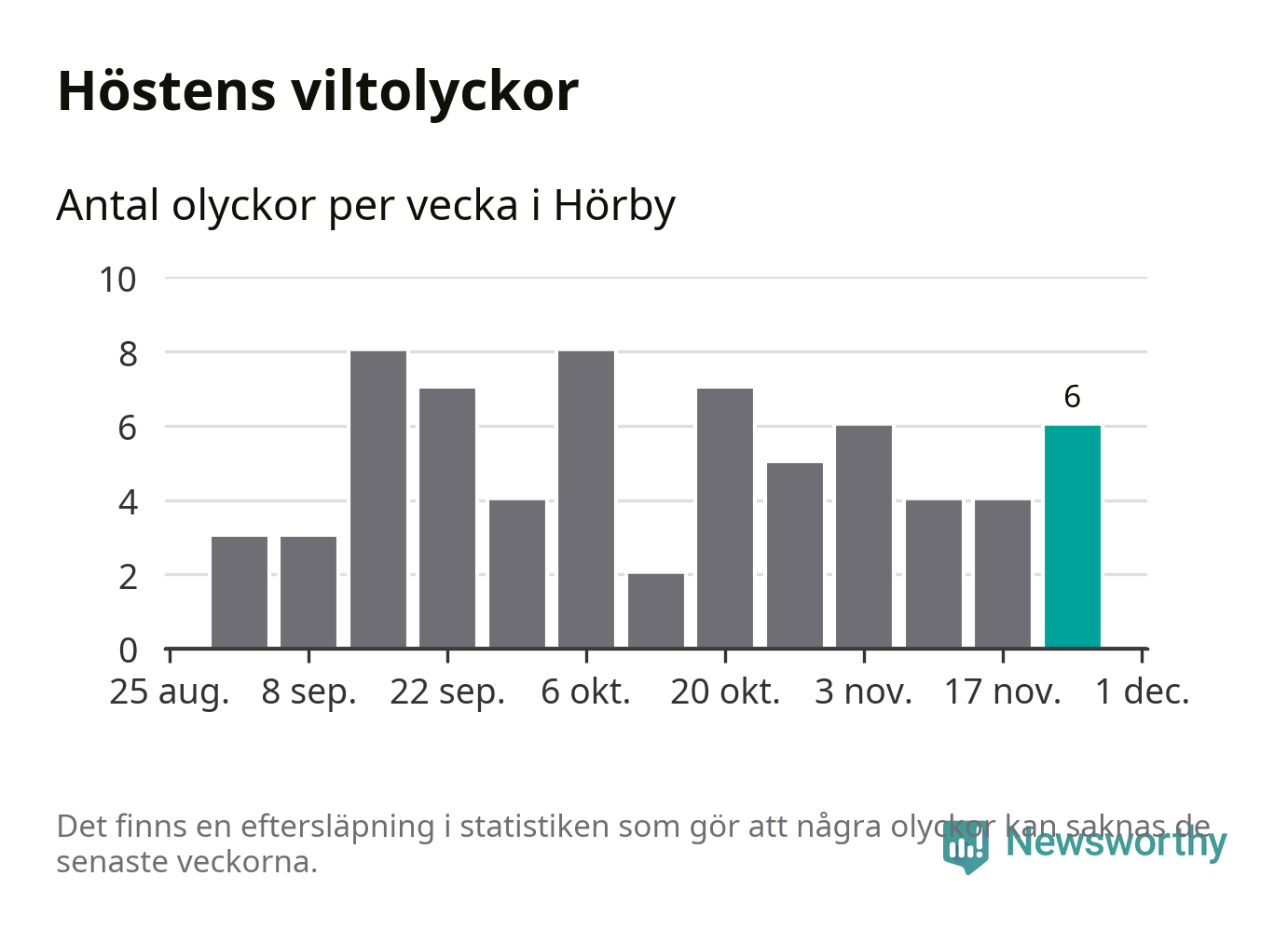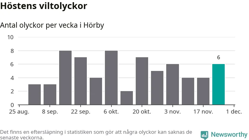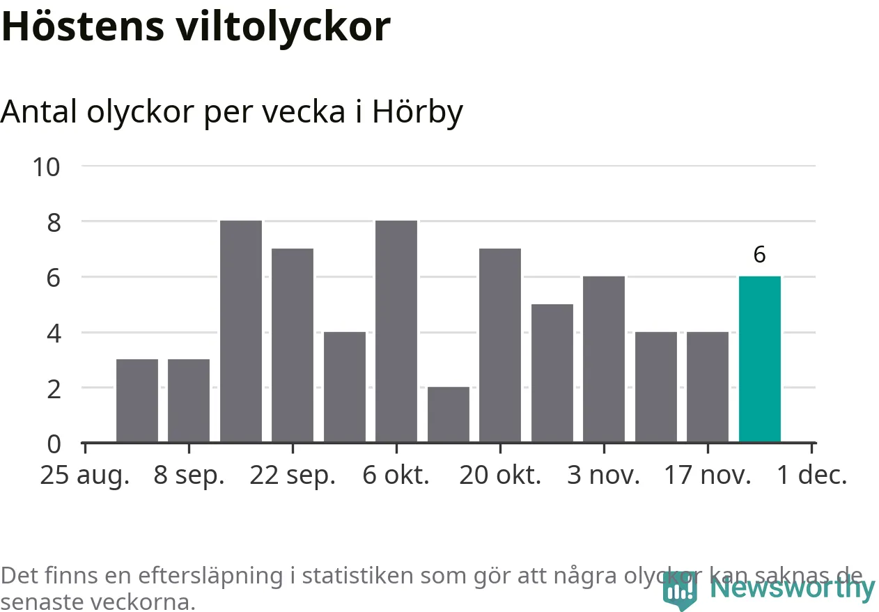 Hittills har sex viltolyckor rapporterats in i Hörby kommun från vecka 48. Se listan här.