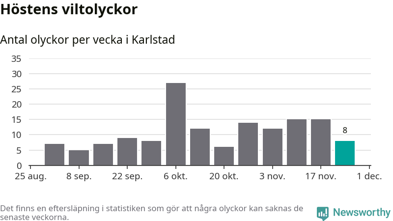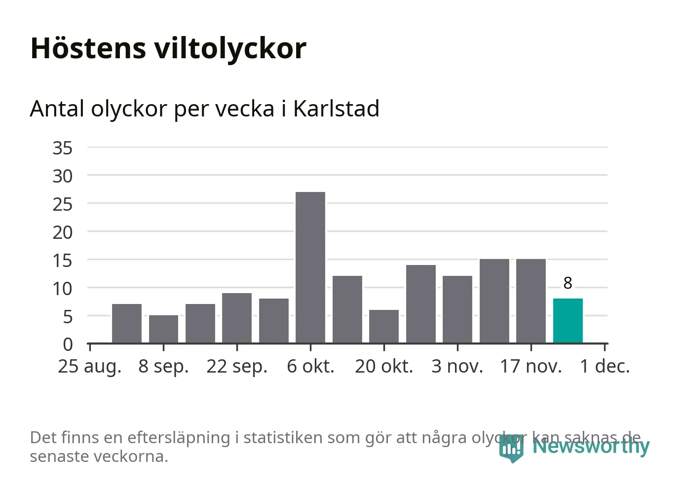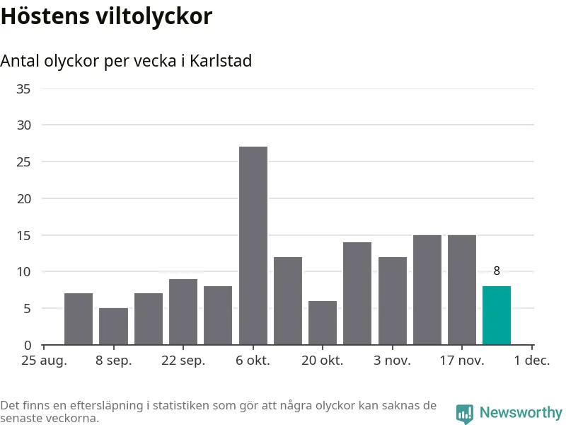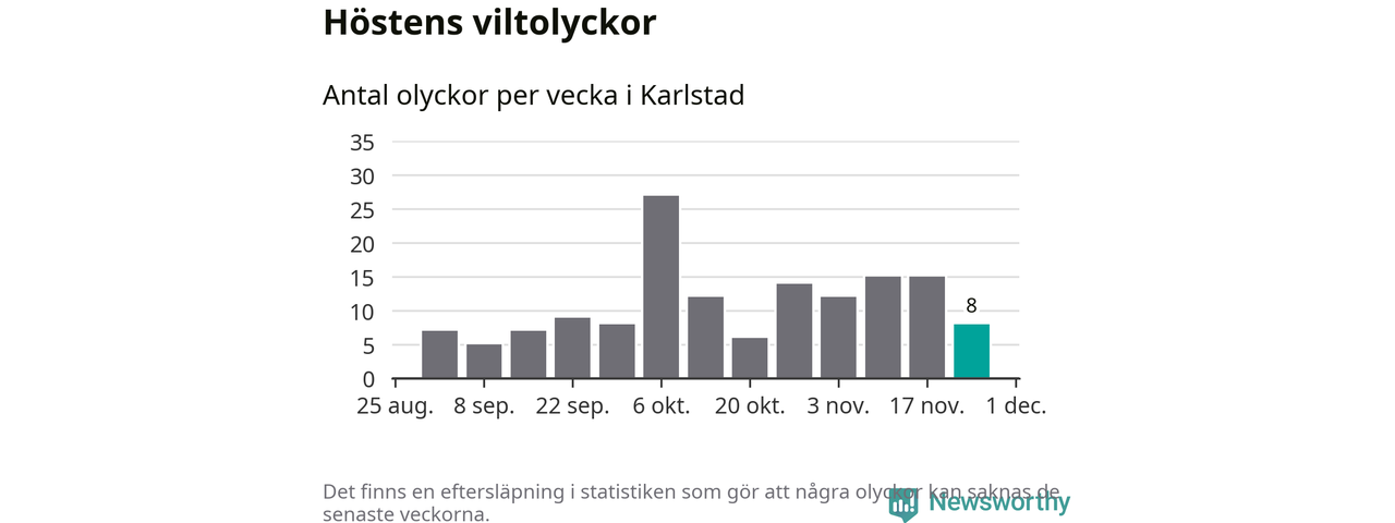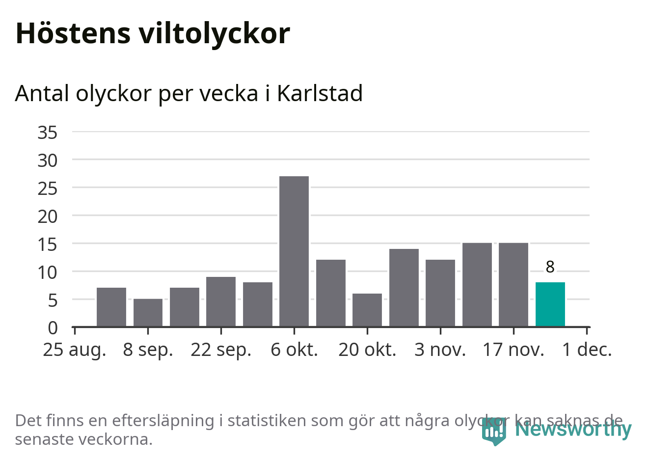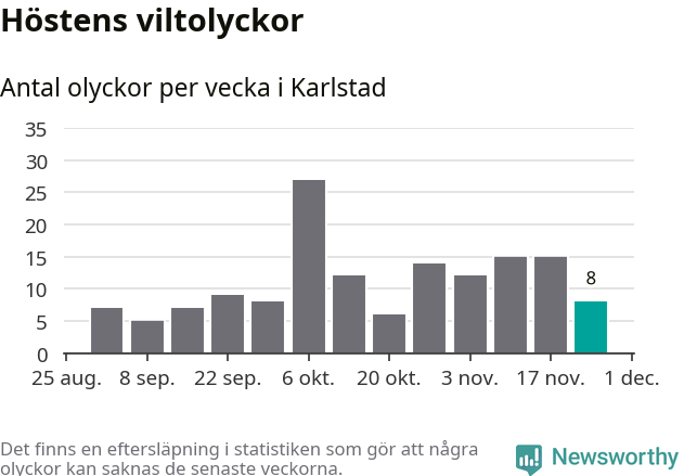 Hittills har åtta viltolyckor rapporterats in i Karlstads kommun från vecka 48. Se listan här.