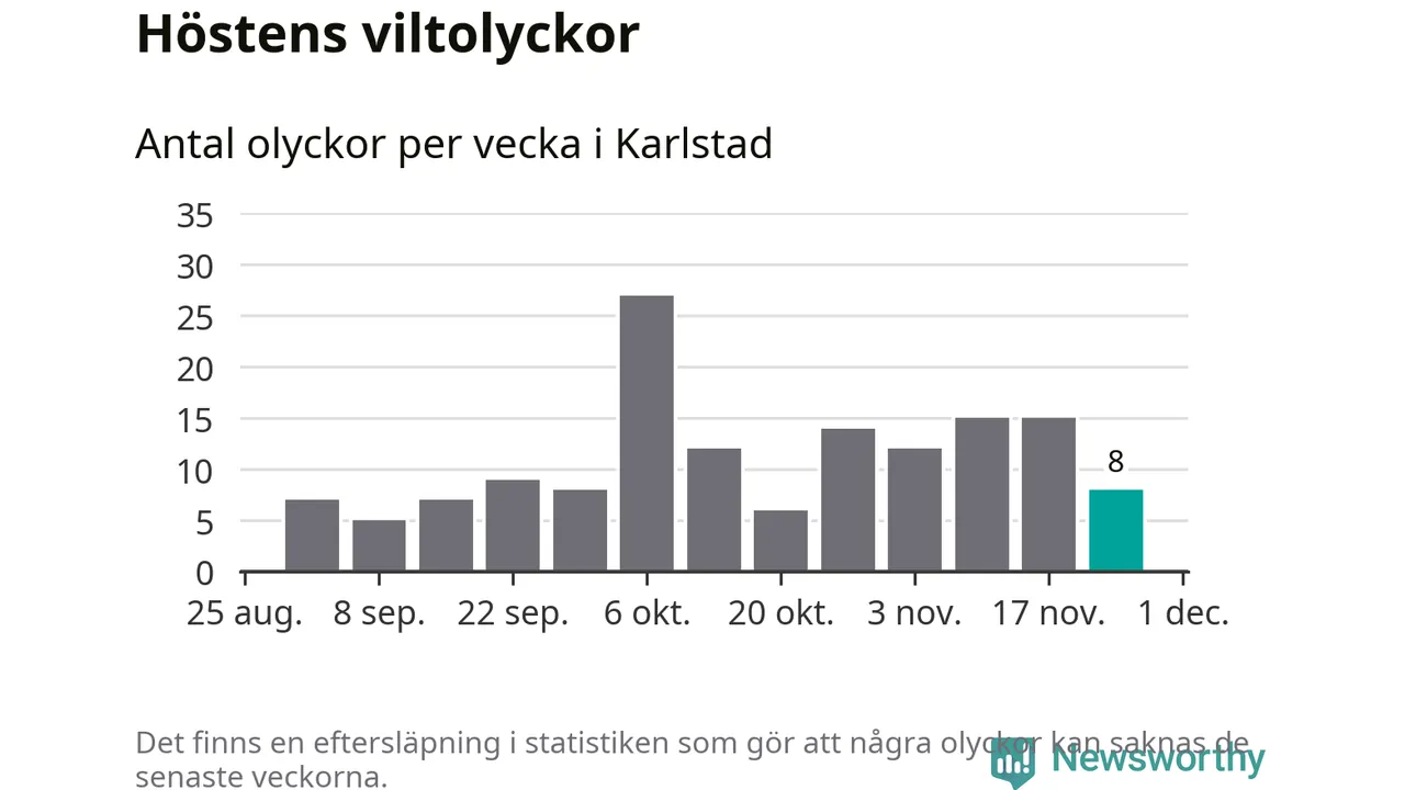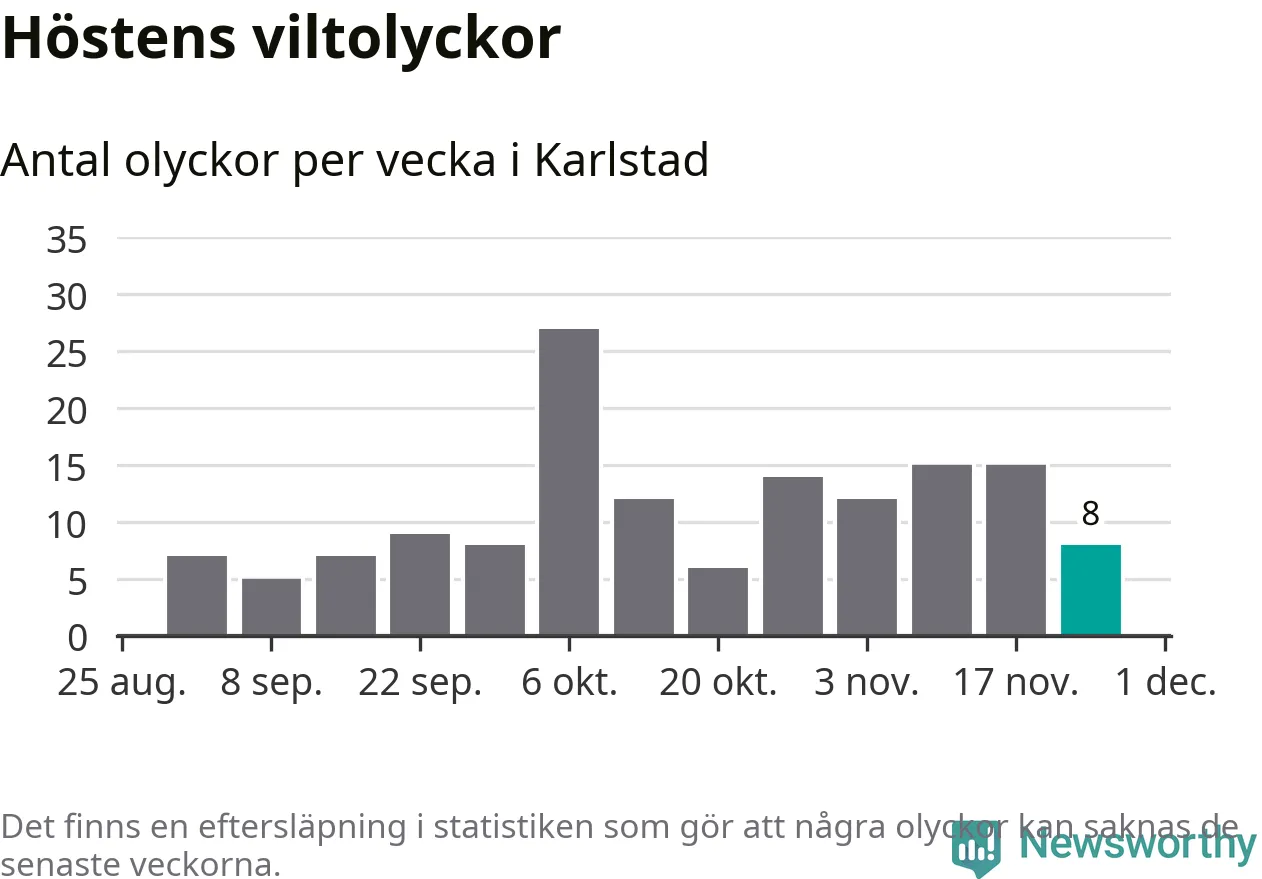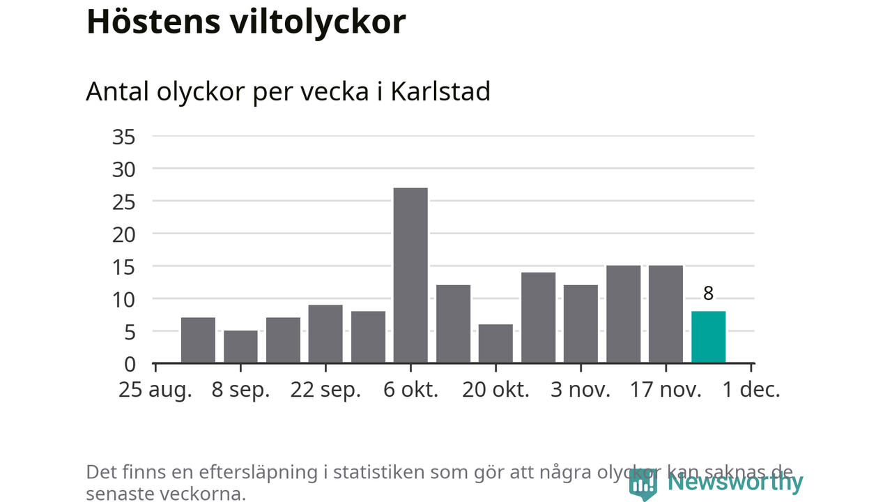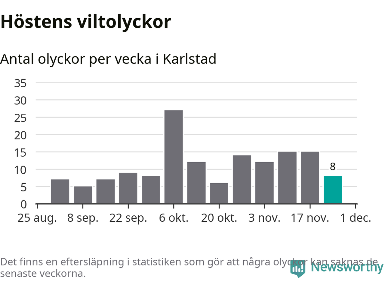 Hittills har åtta viltolyckor rapporterats in i Karlstads kommun från vecka 48. Se listan här.