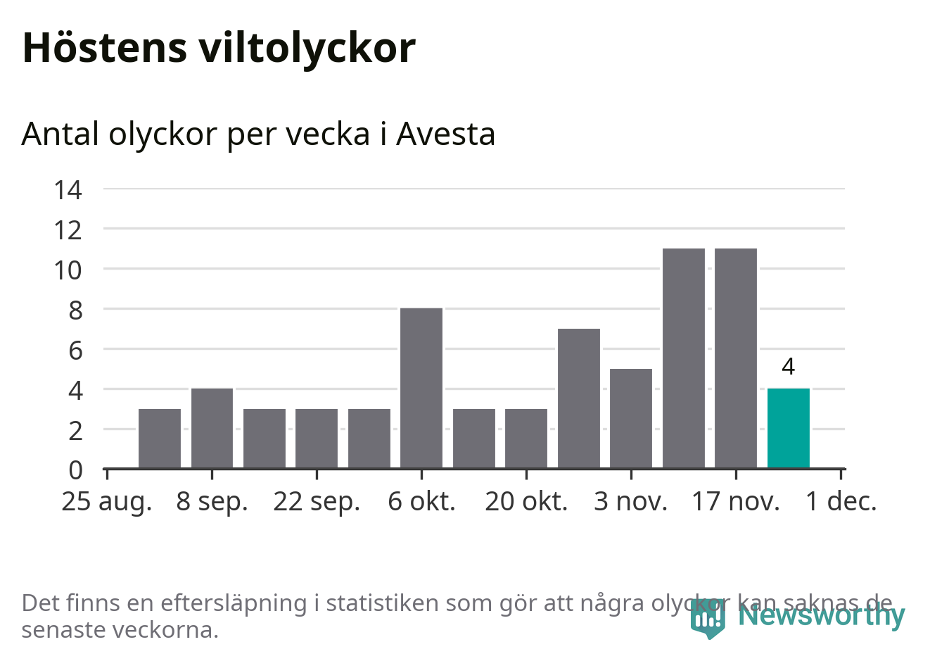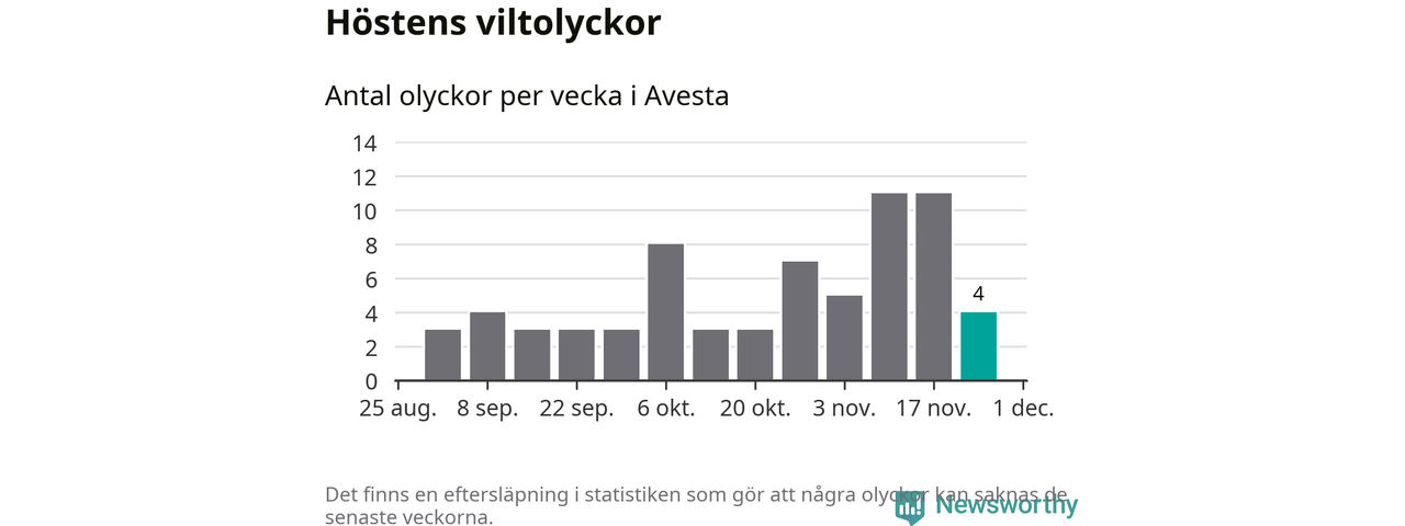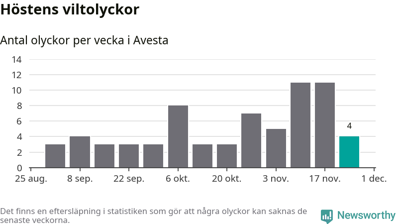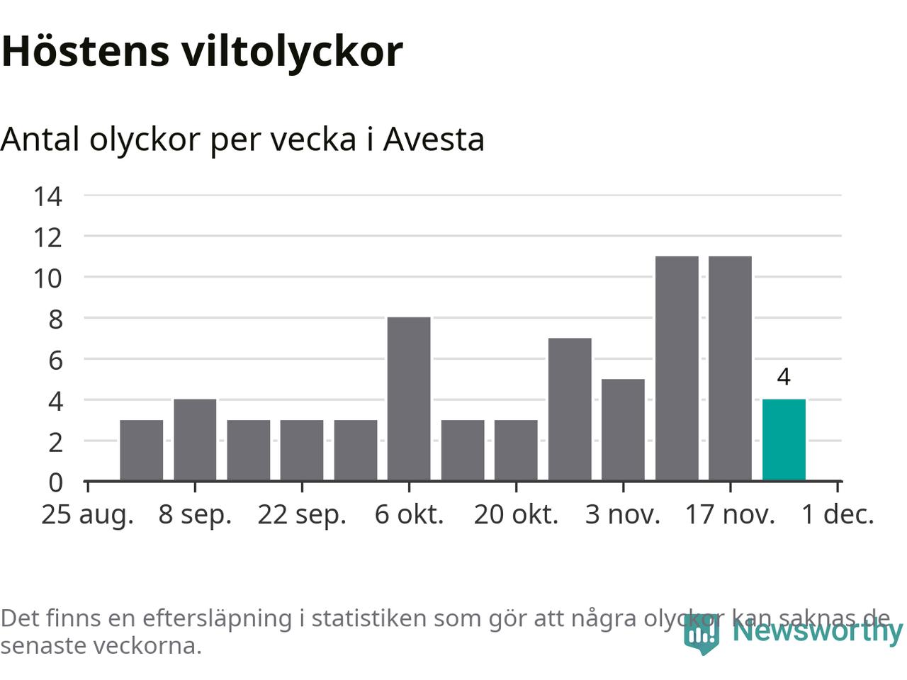 Hittills har fyra viltolyckor rapporterats in i Avesta kommun från vecka 48. Se listan här.