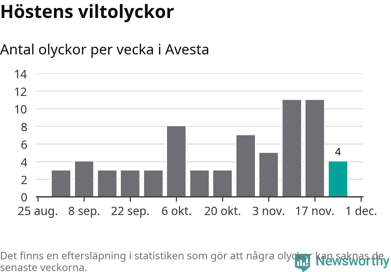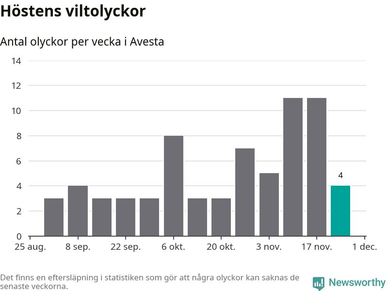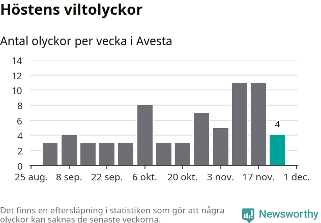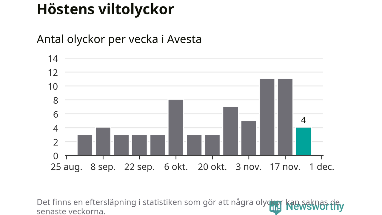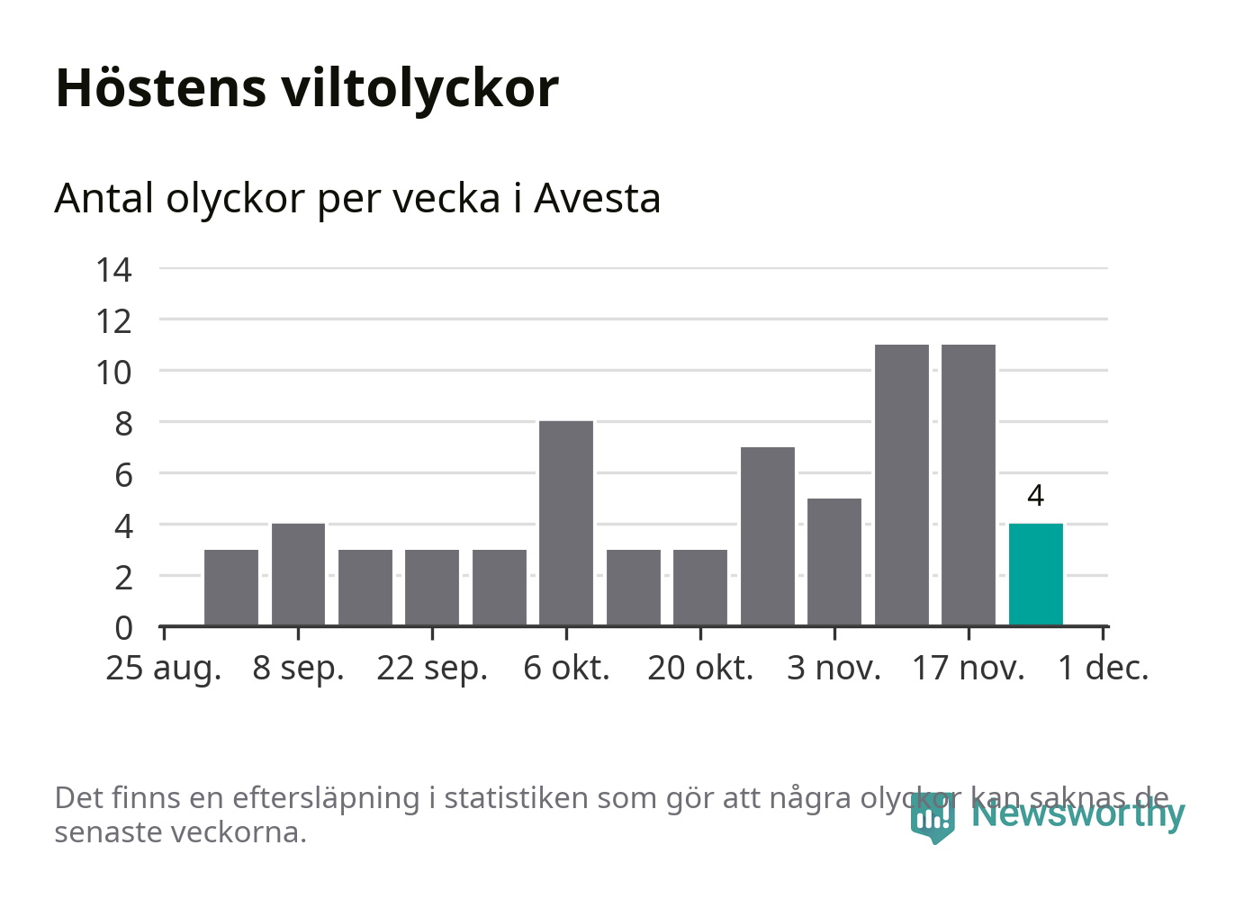 Hittills har fyra viltolyckor rapporterats in i Avesta kommun från vecka 48. Se listan här.