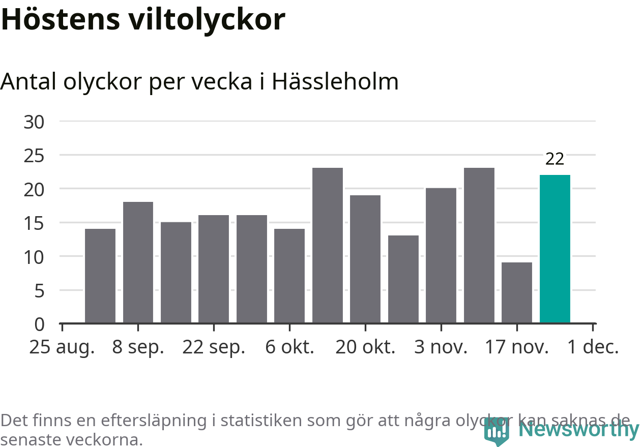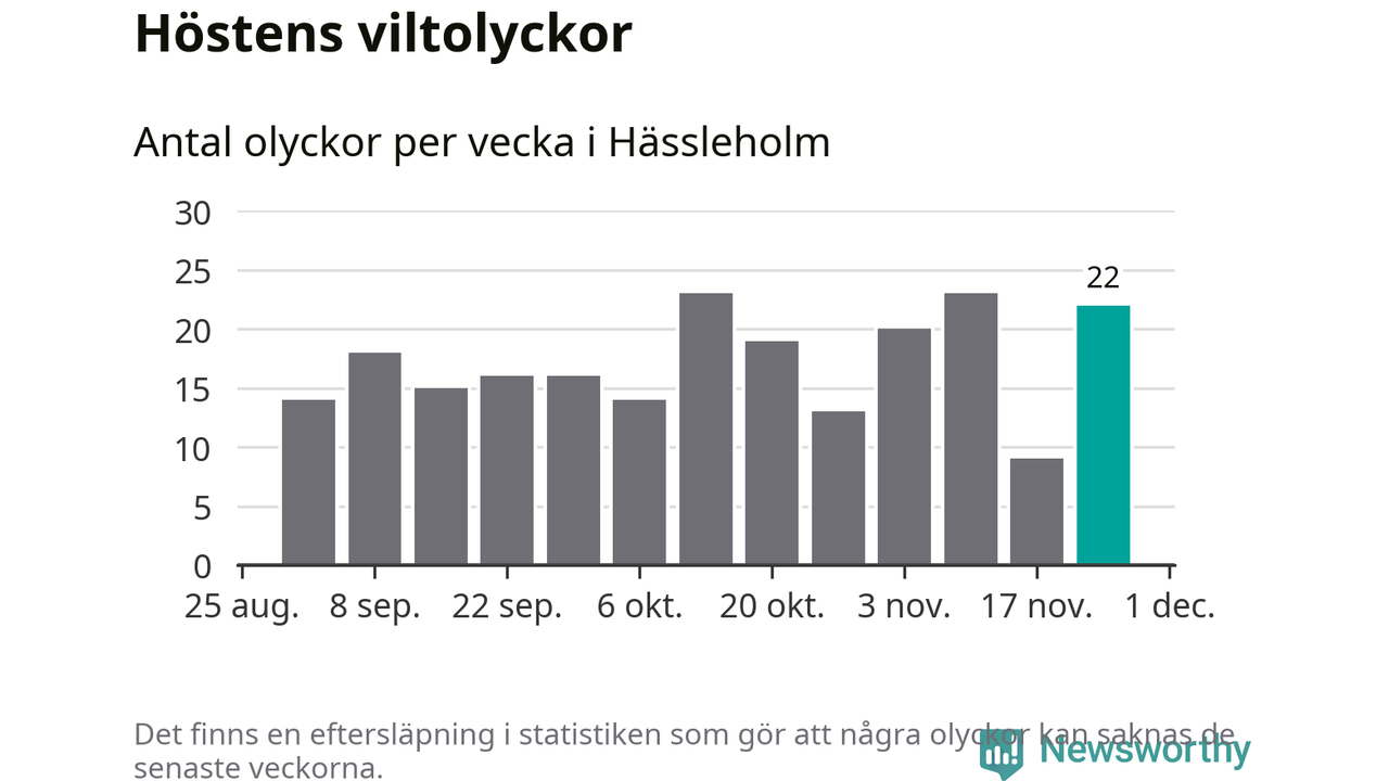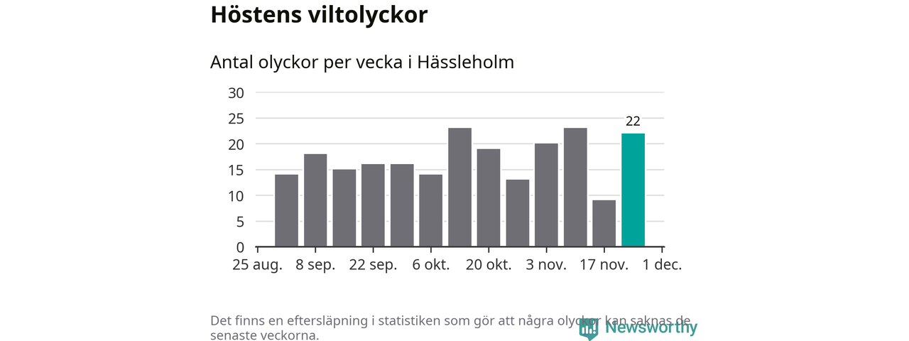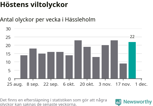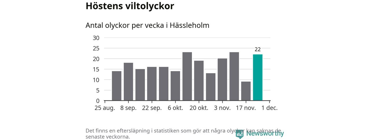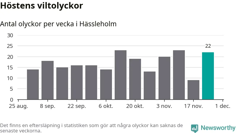 22 olyckor på en enda vecka är däremot ovanligt många. Bara 14 gånger tidigare sedan 2015 har det skett så många viltolyckor på en vecka i Hässleholms kommun, senast för tre veckor sedan.