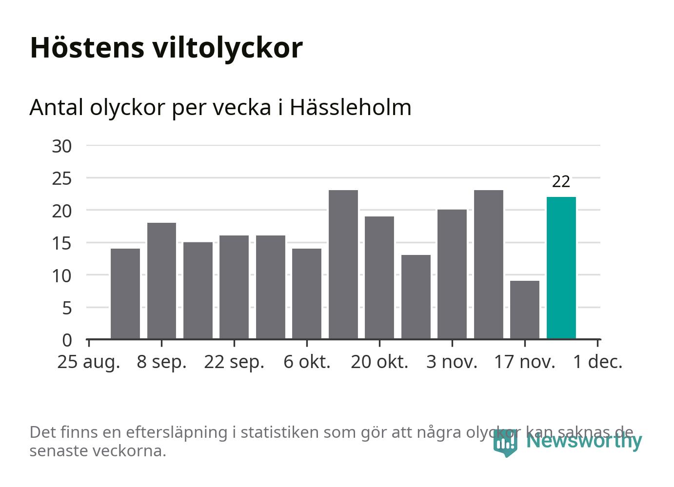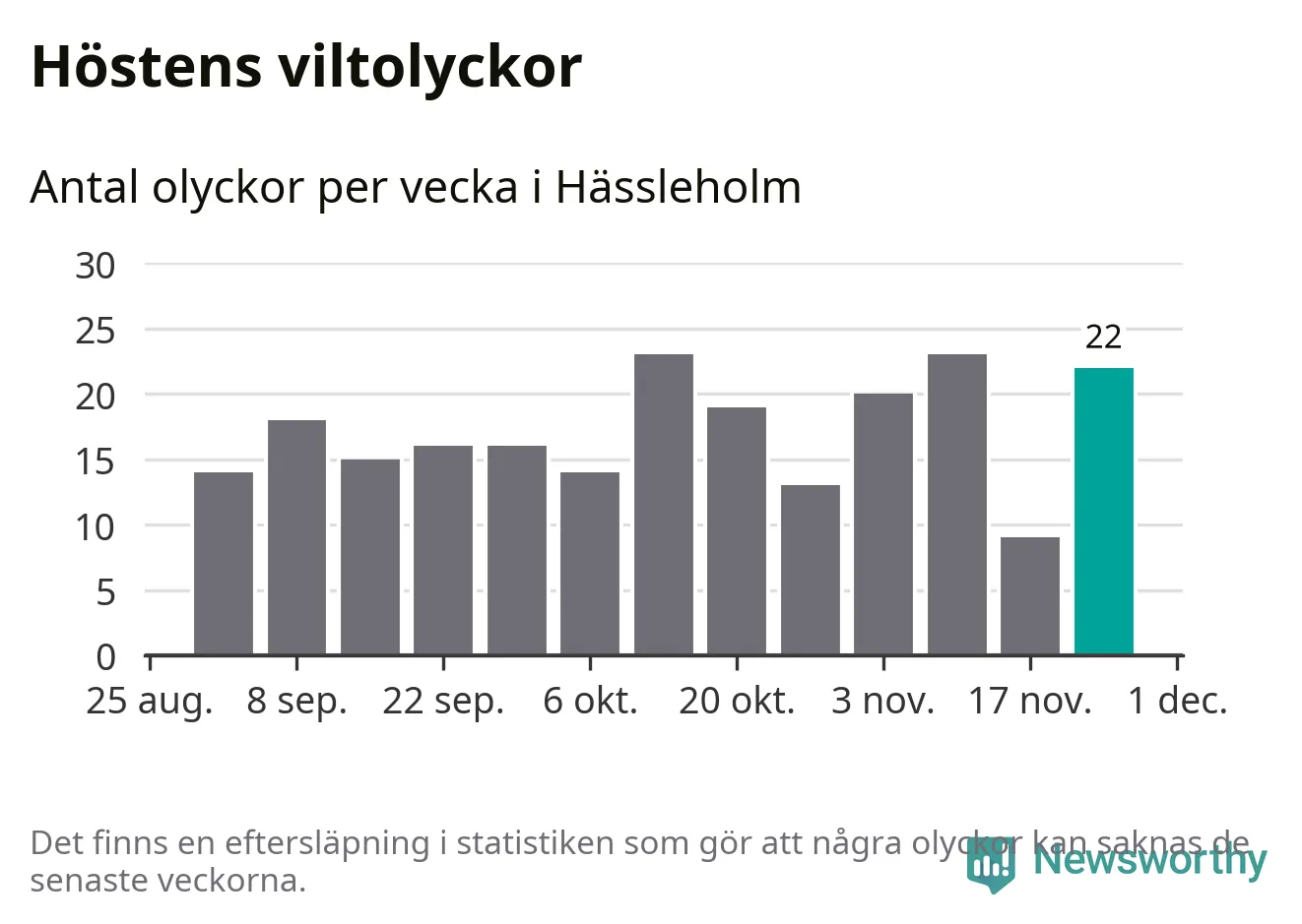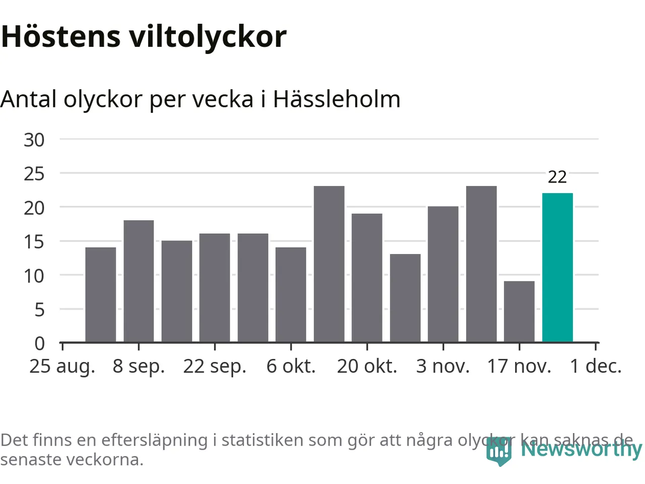 22 olyckor på en enda vecka är däremot ovanligt många. Bara 14 gånger tidigare sedan 2015 har det skett så många viltolyckor på en vecka i Hässleholms kommun, senast för tre veckor sedan.