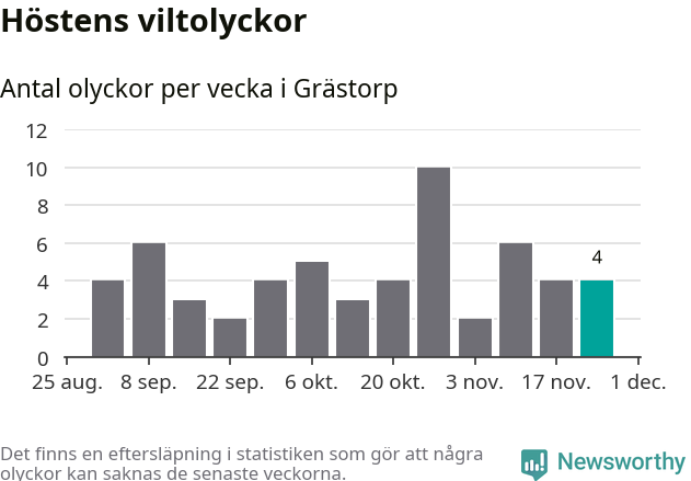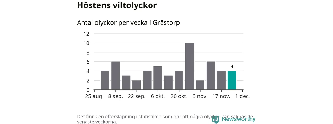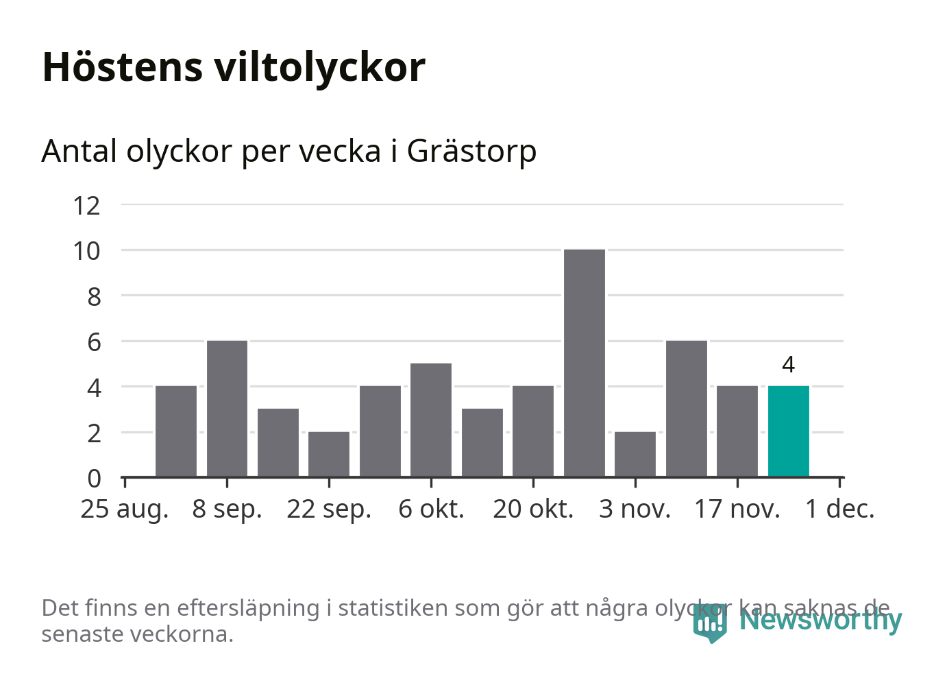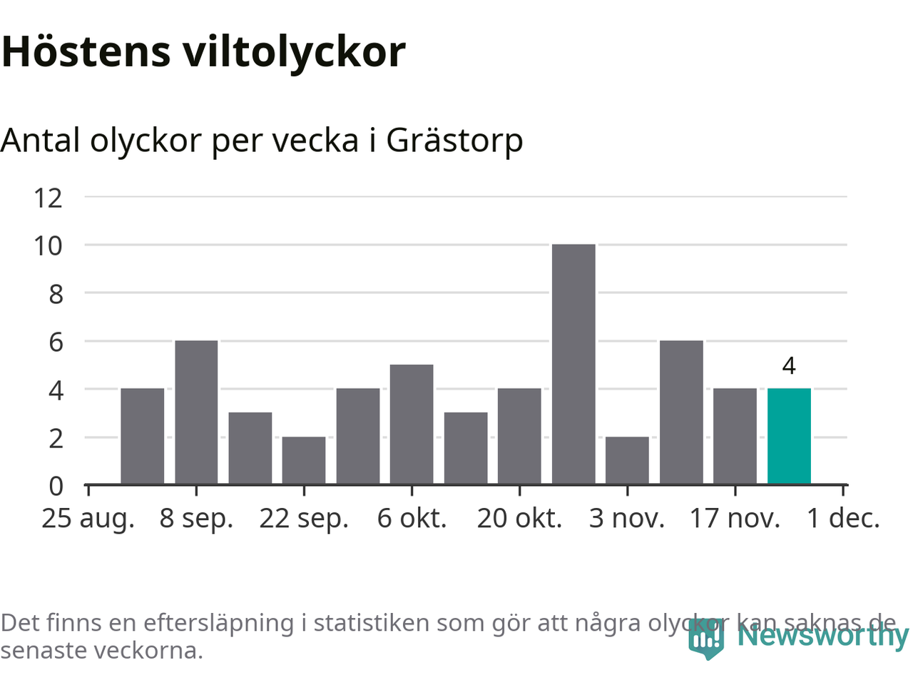 Hittills har fyra viltolyckor rapporterats in i Grästorps kommun från vecka 48. Se listan här.