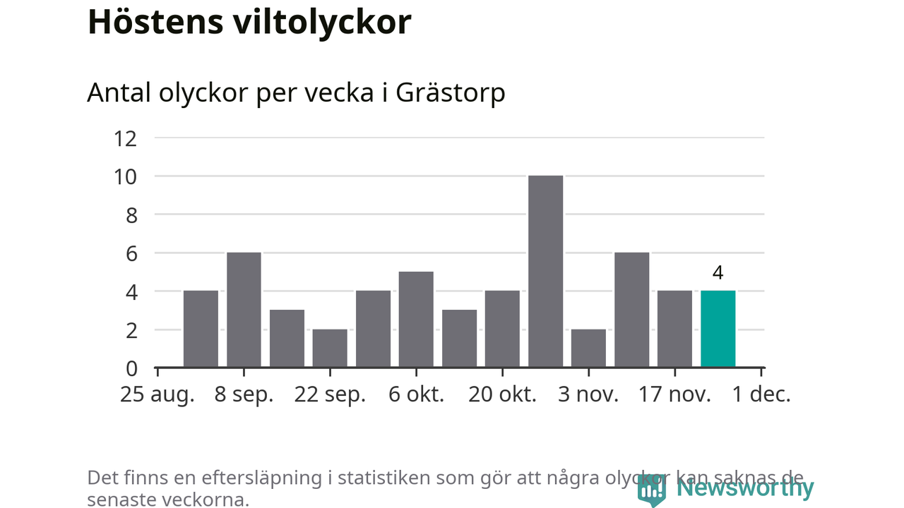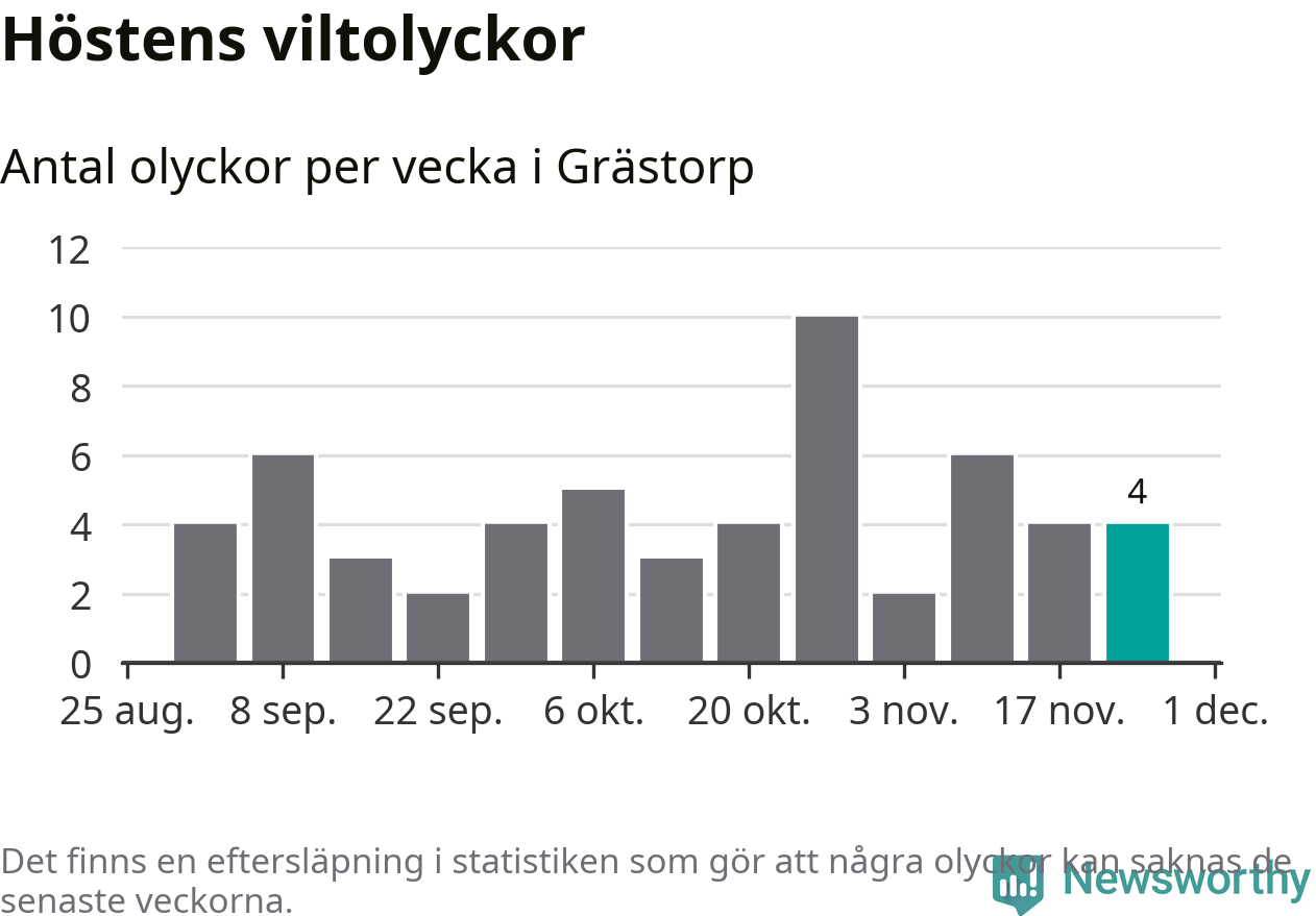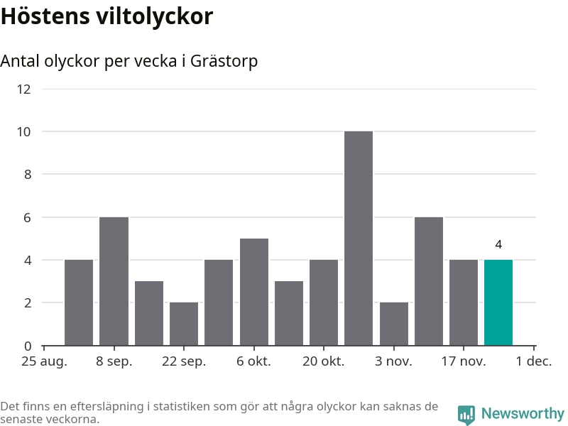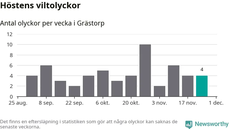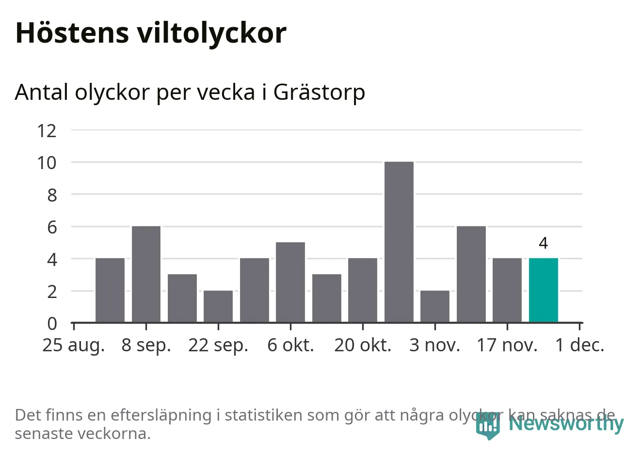 Hittills har fyra viltolyckor rapporterats in i Grästorps kommun från vecka 48. Se listan här.