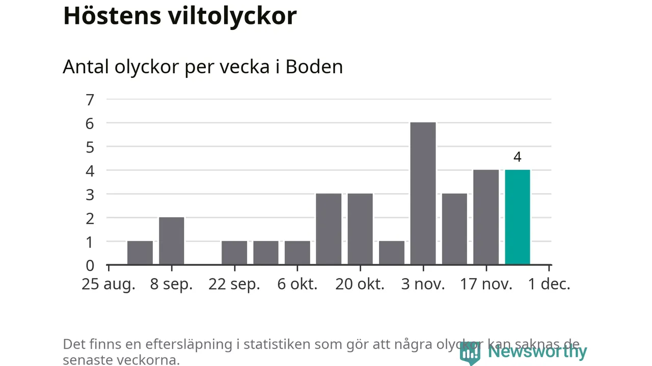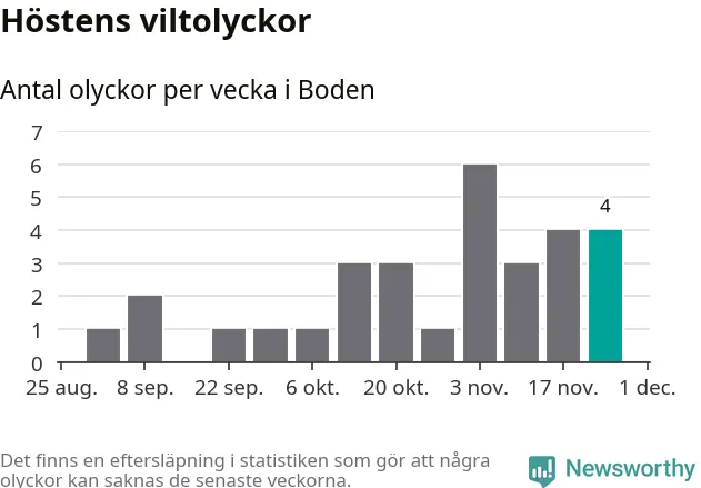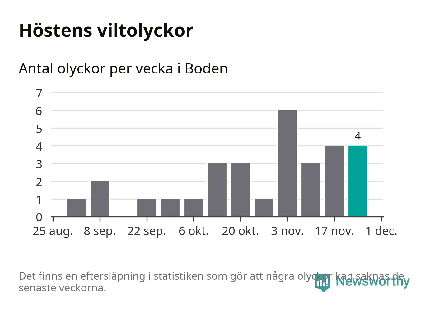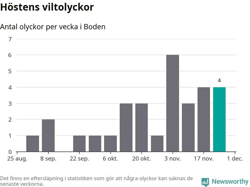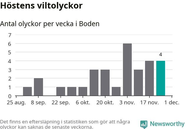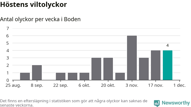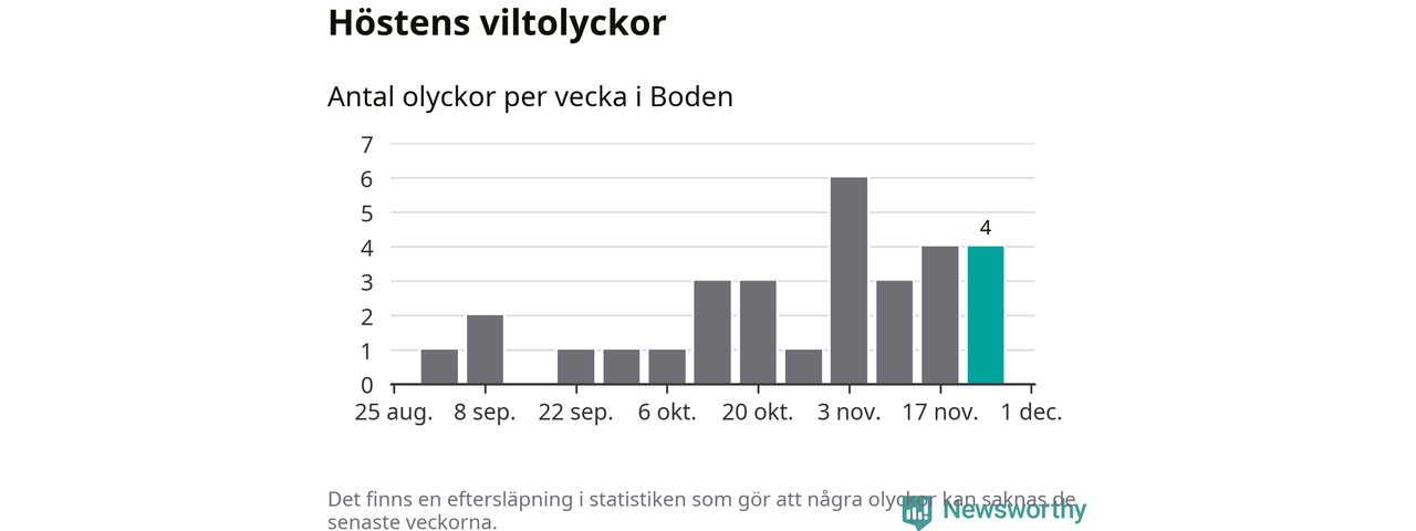Hittills har fyra viltolyckor rapporterats in i Bodens kommun från vecka 48. Se listan här.