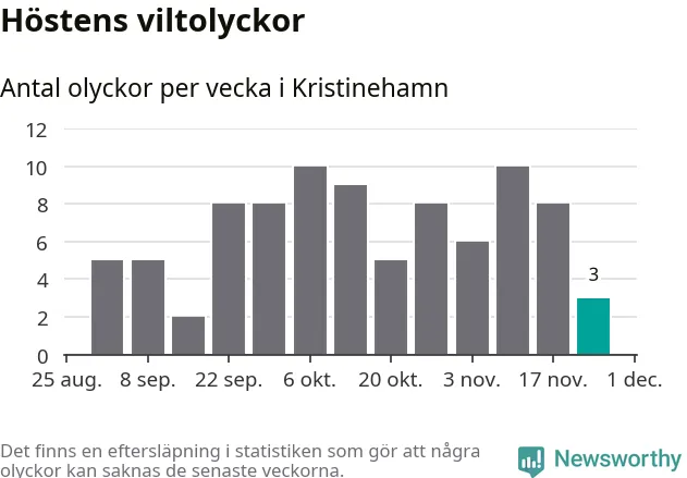 Totalt den här hösten har det inträffat 87 viltolyckor i kommunen. Det är en normal nivå i förhållande till hur det har sett ut under de senaste tio åren – genomsnittet för motsvarande period är 81.