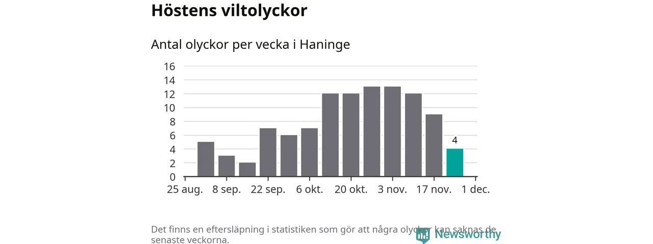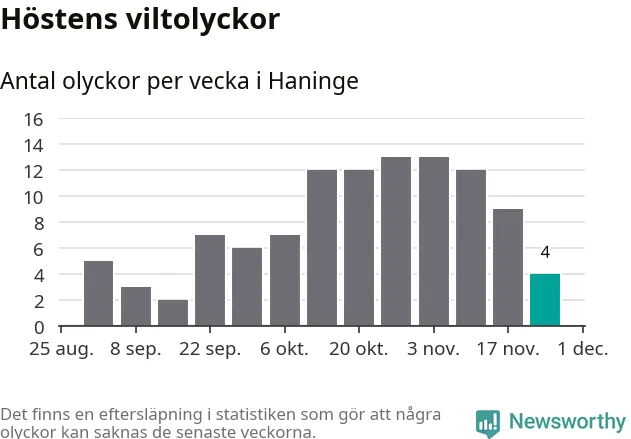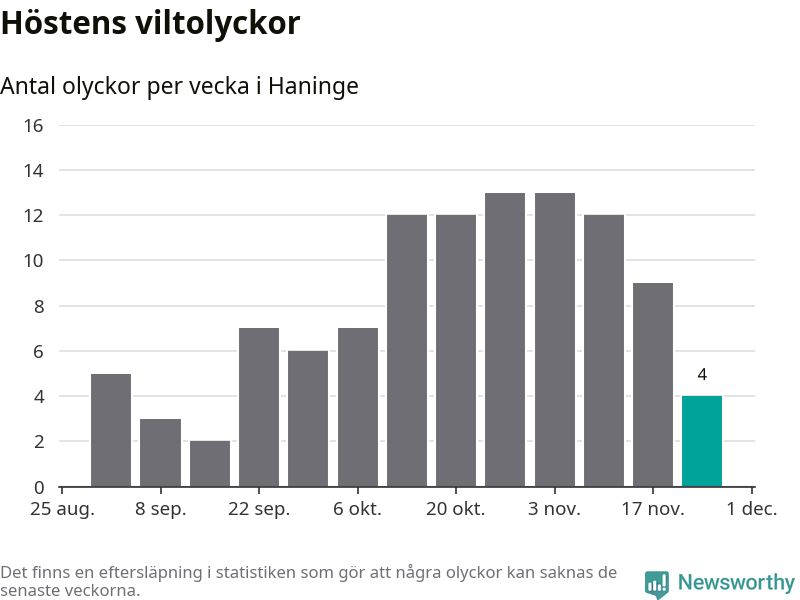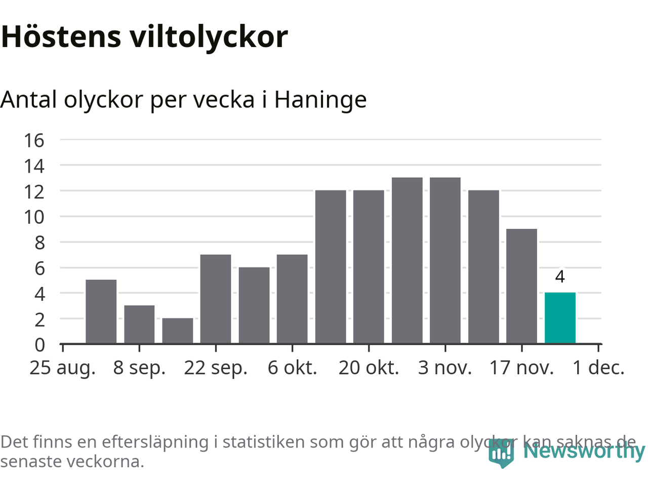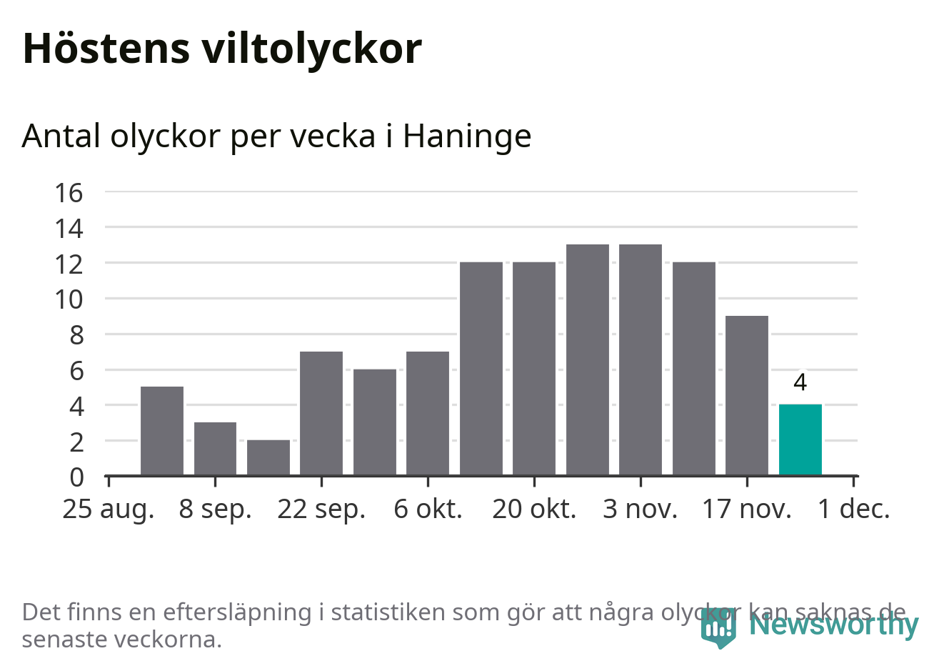 Hittills har fyra viltolyckor rapporterats in i Haninge kommun från vecka 48. Se listan här.